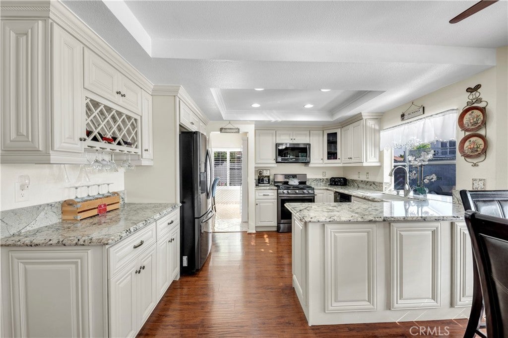 • Interior FeaturesBreakfast Bar, Breakfast Area, Ceiling Fan(s), Cathedral Ceiling(s), Separate/Formal Dining Room, Eat-in Kitchen, Granite Counters, High Ceilings, Recessed Lighting, Solid Surface Counters, Attic, Bedroom on Main Level