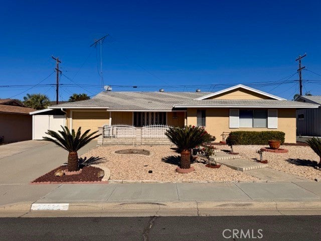 Welcome home! This charming 2 bedroom, 2 bathroom single story 55+ home with an attached garage is available for lease in Sun City. The property offers low-maintenance front and back yards, ideal for those who enjoy a neat, welcoming exterior without the upkeep. Inside, you’re greeted by a bright and inviting living room featuring a light, neutral paint scheme and a blend of plank and tile flooring for a warm, comfortable feel. Adjacent to the living room is the kitchen, complete with oak cabinetry, granite like countertops, black hardware, tons of storage and more. The kitchen connects to the dining area, which opens through double French doors to the California room, an excellent additional space for relaxing or entertaining. The laundry room is conveniently located just off the California room and kitchen. Down the hallway are both bedrooms, each featuring plank flooring. The primary bedroom includes an oversized closet and an ensuite bathroom with a single vanity sink and a shower tub combination. The backyard offers a spacious outdoor area with low maintenance landscaping, a covered patio, a large storage shed, and plenty of room to enjoy year-round. This home is near Menifee Lakes Country Club and includes a paid membership with access to fantastic amenities such as a golf course, clubhouse, pools, pickleball courts, an outdoor amphitheater, indoor theater, and more. Sun City is a sought-after retirement community known for its active and engaging lifestyle!