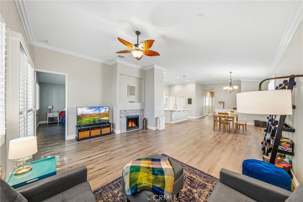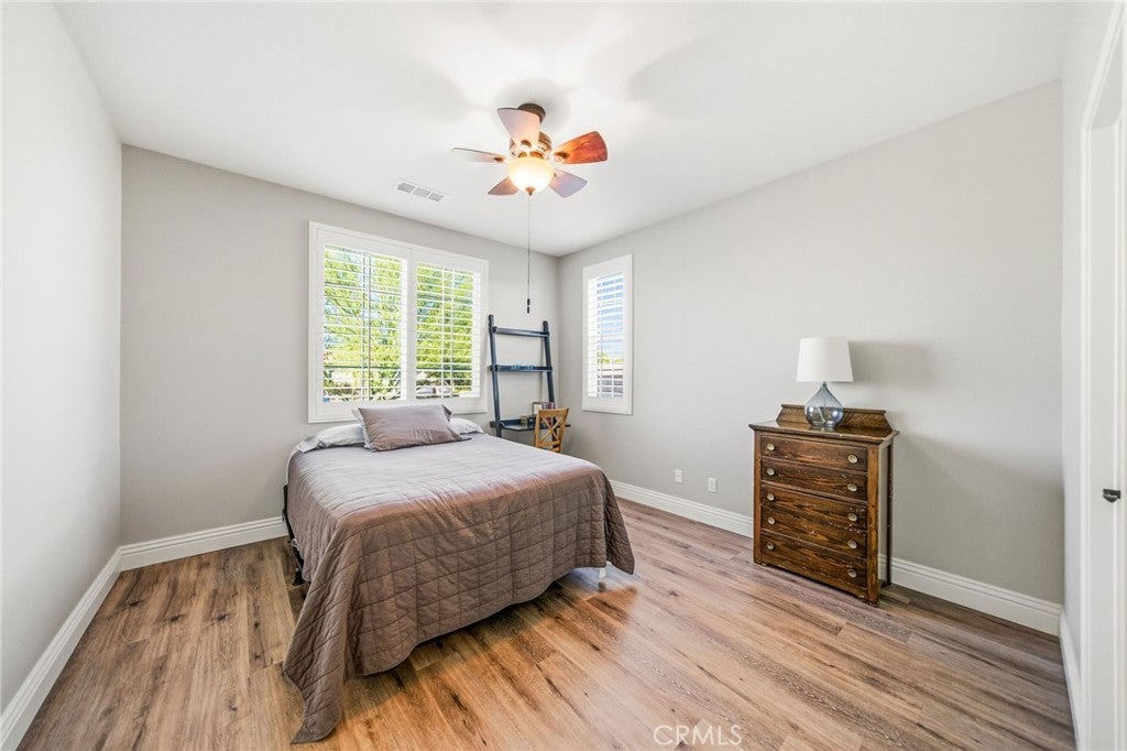 Welcome to this turnkey residence on a prime cul-de-sac location! 26535 Rim Creek Pathway is a truly gorgeous 3-bedroom, 2-bathroom single-family home located on a prime cul-de-sac in a desirable 55+ Menifee community. This home is packed with high-end upgrades, making it fully turnkey. Interior features include vinyl flooring throughout, shutters on all windows, crown molding, upgraded baseboards, and ceiling fans in every room. The kitchen and bathrooms boast quartz countertops and soft-closing drawers. Kitchen also includes a custom backsplash, stainless steel appliances, and pull-out lower shelves in the kitchen/pantry. The third bedroom features built-in desk and cabinets. When it comes to utility and efficiency, it is equipped with a Tankless Water Heater and a Quiet Cool Whole House Fan. The inside laundry room includes a sink for your convenience. Outside is a backyard featuring an Alumawood patio cover with ceiling fans and gutters. HOA amenities include a Swimming Pool, Spa, Exercise Room, BBQ area, and Tennis/Pickleball Court. Conveniently located near schools, shopping, and commuter access, this home truly represents the pinnacle of upgraded, comfortable living in a prime Menifee 55+ location. This is the complete package. Don't let this opportunity to secure your fully upgraded dream home pass you by! Schedule your showing today!