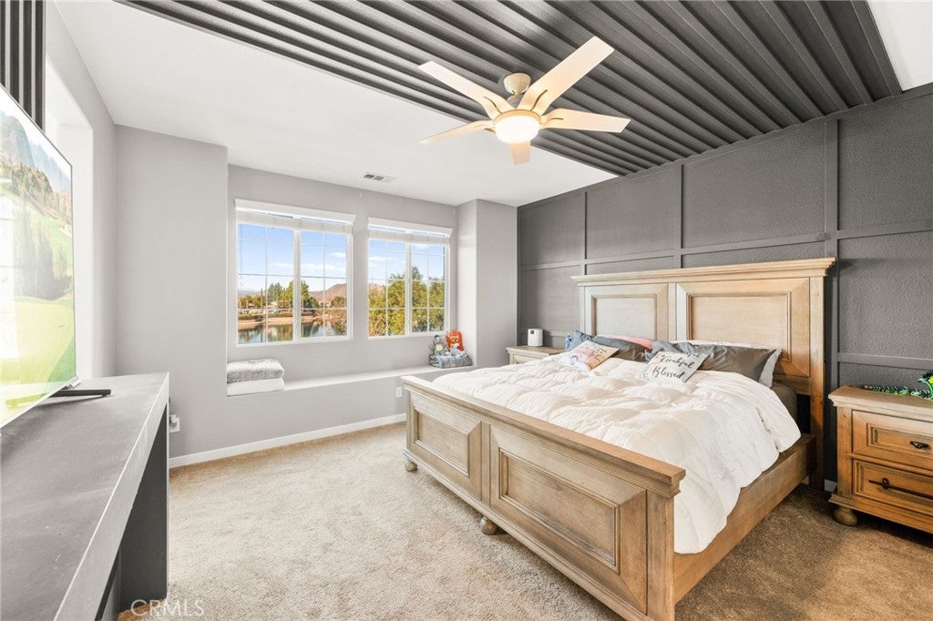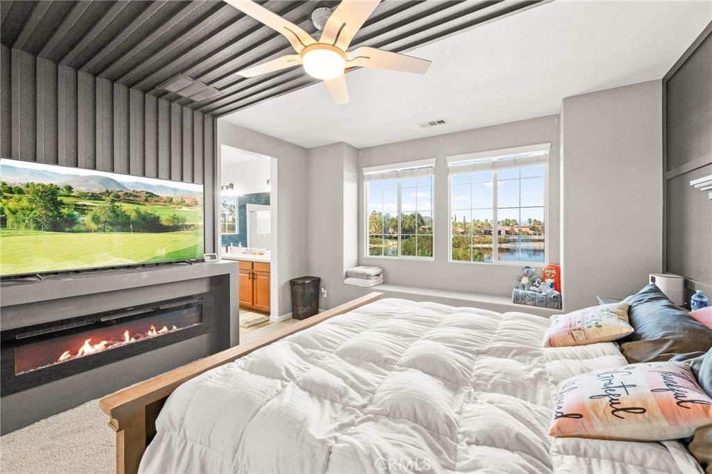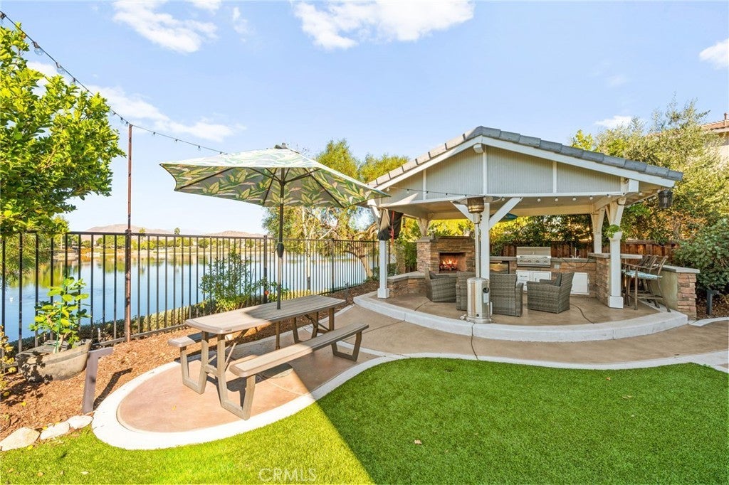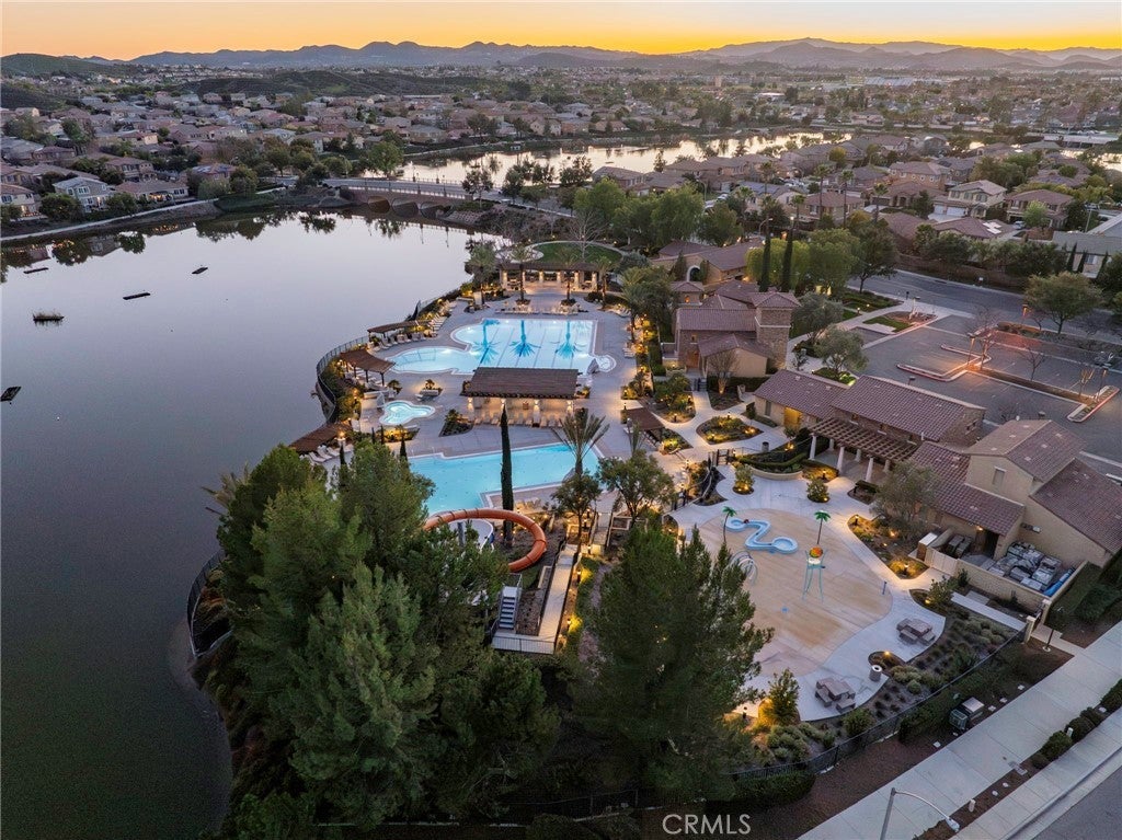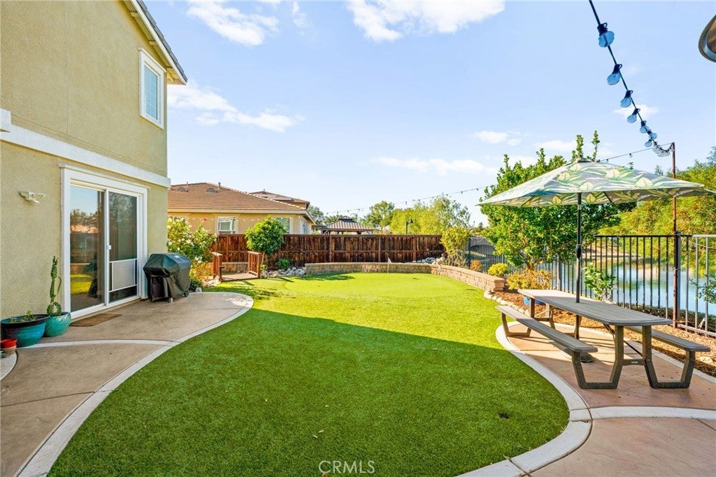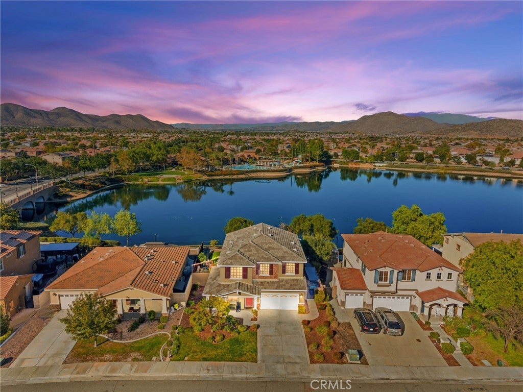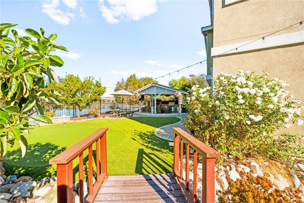 Rare lakefront property in the highly sought after gated community of The Lakes in Menifee. Nestled on a quiet cul-de-sac, this home offers direct lake frontage with breathtaking panoramic water views. Perfectly positioned to capture views of the community clubhouse and the charming bridge across the water, this is a location that rarely becomes available. This stunning 4 bedroom, 2.5 bath residence offers approximately 2,204 square feet of stylish and functional living space. Step inside to a bright, open concept interior featuring beautiful luxury vinyl plank flooring and an inviting layout ideal for both everyday living and entertaining. The kitchen blends comfort and contemporary elegance with sleek quartz countertops, modern finishes, and ample space to gather. As you go upstairs the primary suite provides a peaceful retreat at the end of the day, while the additional bedrooms offer flexibility for family, guests, or a home office. Every detail of this home is designed to maximize comfort, style, and the incredible waterfront setting. The backyard is truly one of a kind an entertainer’s dream and a personal lakeside oasis. Enjoy direct water views while relaxing under the generous covered patio, hosting weekend cookouts with the built in BBQ, or practicing on your private putting green. Low maintenance turf and stamped concrete add an upscale touch while creating a functional and visually striking outdoor space. Whether sipping morning coffee by the lake or hosting unforgettable sunset gatherings, this backyard delivers an unparalleled lakeside lifestyle. Upstairs, all four bedrooms are thoughtfully laid out for comfort and privacy. Living in The Lakes means enjoying gated security and resort-style amenities, including a clubhouse, pool, splash pad, scenic walking trails, parks, and picnic areas all just moments from your front door. Conveniently located near shopping, dining, excellent schools, and freeway access, this home offers both tranquility and convenience. With its serene lakeside setting, prime location, and resort caliber outdoor living, this home is more than a place to live it’s a lifestyle. Opportunities like this don’t come around often.