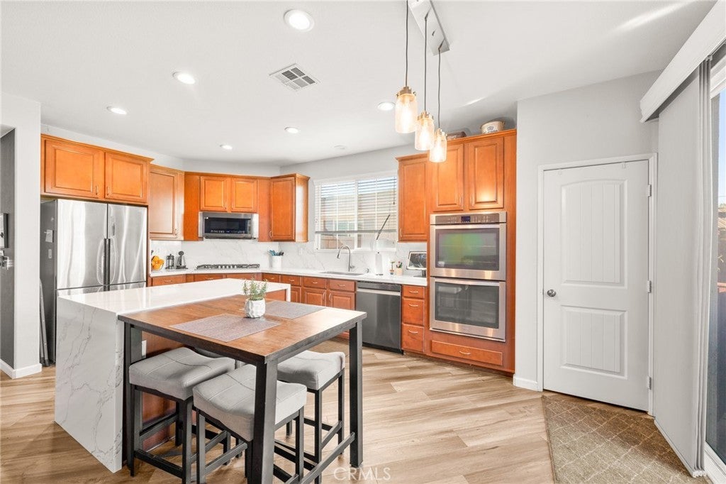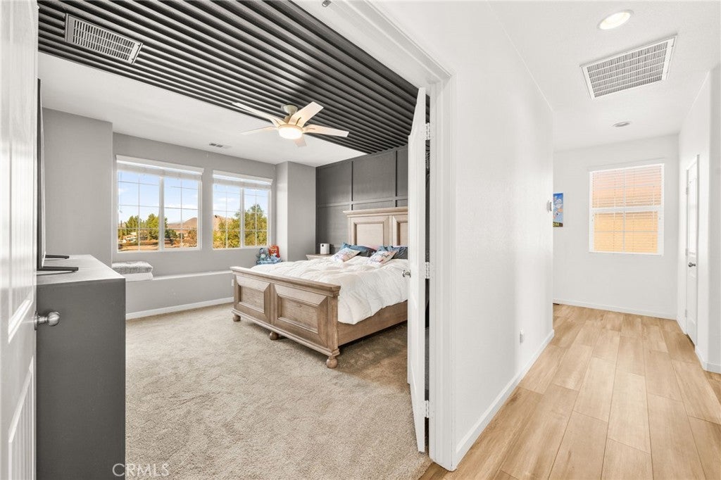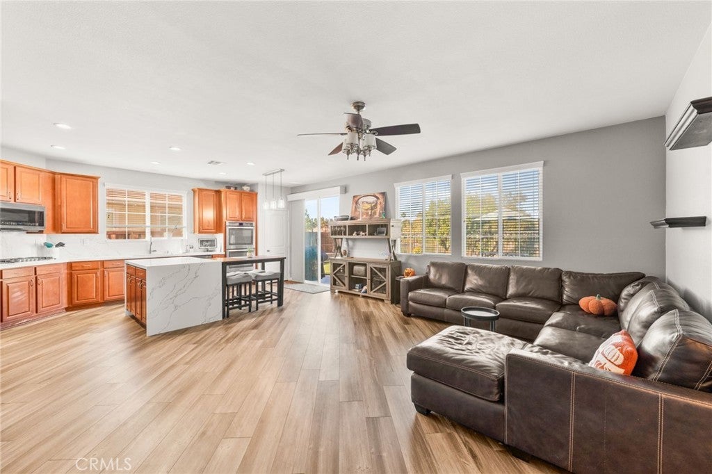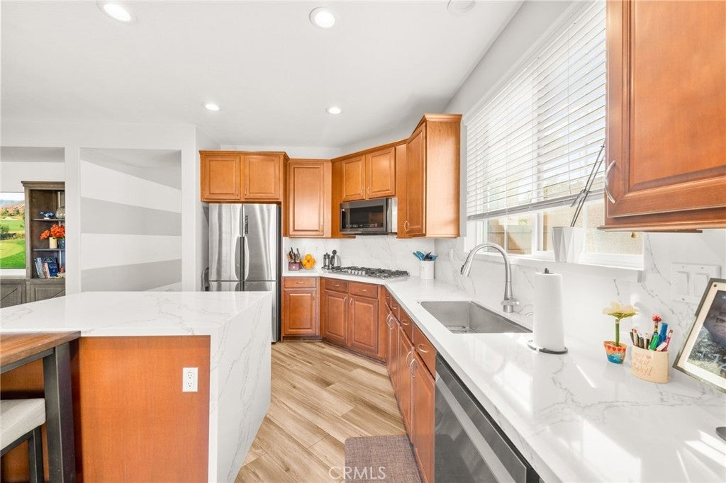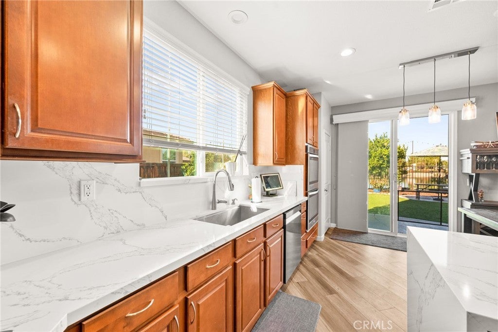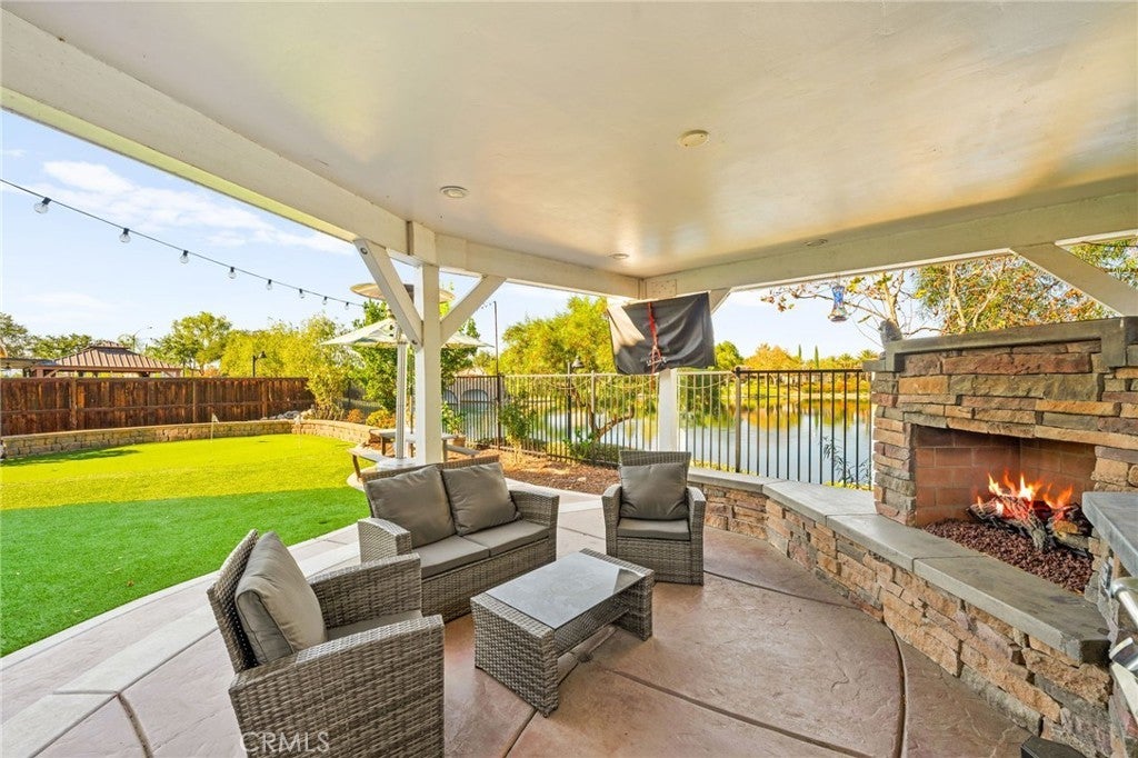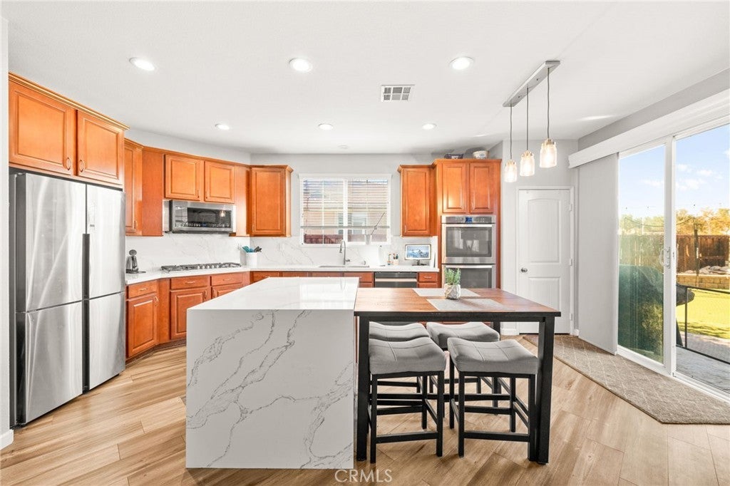 Rare lakefront property in the highly sought after gated community of The Lakes in Menifee. Nestled on a quiet cul-de-sac, this home offers direct lake frontage with breathtaking panoramic water views. Perfectly positioned to capture views of the community clubhouse and the charming bridge across the water, this is a location that rarely becomes available. This stunning 4 bedroom, 2.5 bath residence offers approximately 2,204 square feet of stylish and functional living space. Step inside to a bright, open concept interior featuring beautiful luxury vinyl plank flooring and an inviting layout ideal for both everyday living and entertaining. The kitchen blends comfort and contemporary elegance with sleek quartz countertops, modern finishes, and ample space to gather. As you go upstairs the primary suite provides a peaceful retreat at the end of the day, while the additional bedrooms offer flexibility for family, guests, or a home office. Every detail of this home is designed to maximize comfort, style, and the incredible waterfront setting. The backyard is truly one of a kind an entertainer’s dream and a personal lakeside oasis. Enjoy direct water views while relaxing under the generous covered patio, hosting weekend cookouts with the built in BBQ, or practicing on your private putting green. Low maintenance turf and stamped concrete add an upscale touch while creating a functional and visually striking outdoor space. Whether sipping morning coffee by the lake or hosting unforgettable sunset gatherings, this backyard delivers an unparalleled lakeside lifestyle. Upstairs, all four bedrooms are thoughtfully laid out for comfort and privacy. Living in The Lakes means enjoying gated security and resort-style amenities, including a clubhouse, pool, splash pad, scenic walking trails, parks, and picnic areas all just moments from your front door. Conveniently located near shopping, dining, excellent schools, and freeway access, this home offers both tranquility and convenience. With its serene lakeside setting, prime location, and resort caliber outdoor living, this home is more than a place to live it’s a lifestyle. Opportunities like this don’t come around often.