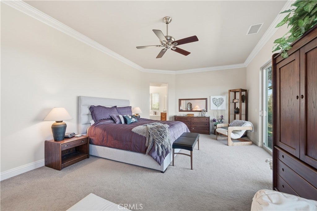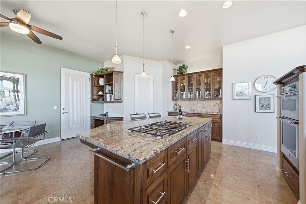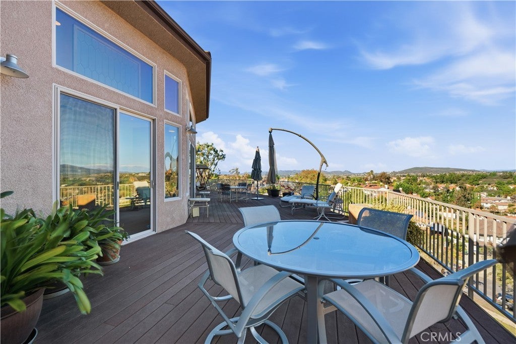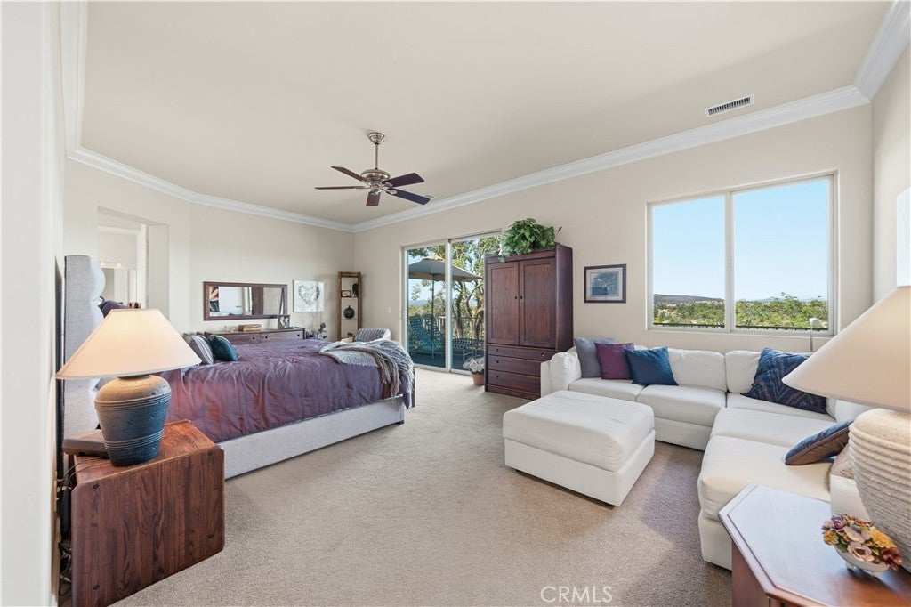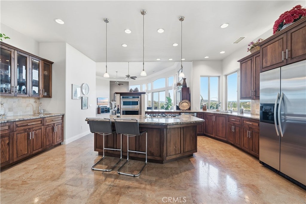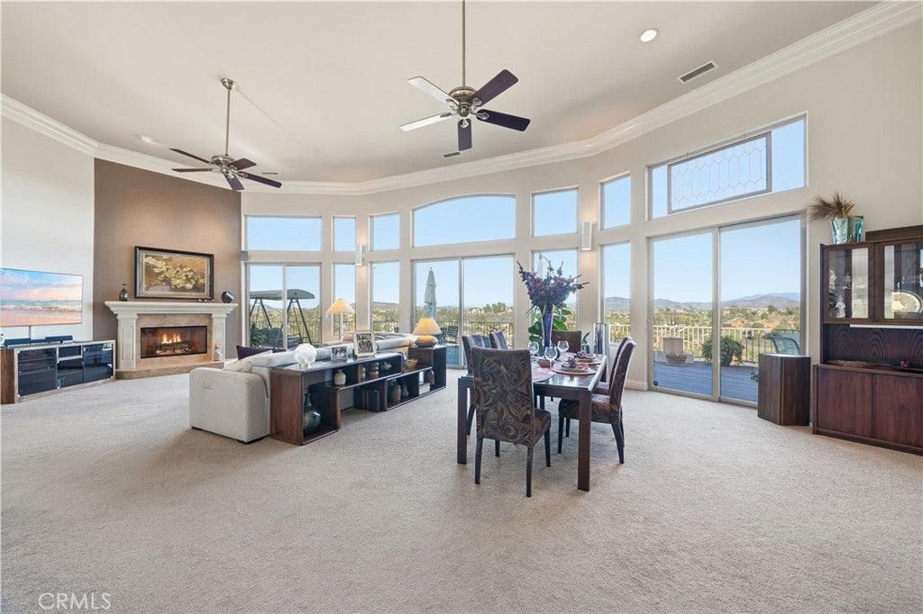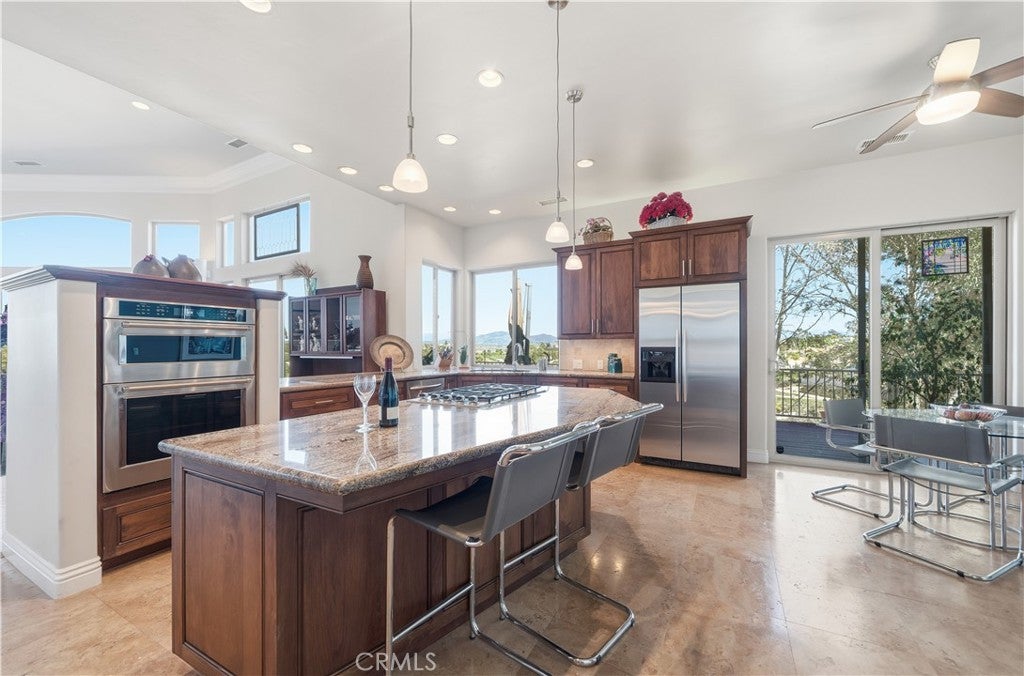 Listed for the first time, this exceptional custom-built single-story residence is gracefully positioned at the end of a private cul-de-sac, elevated to capture sweeping panoramic views. Thoughtfully designed with three bedrooms—including a grand primary suite, a private junior suite, and a guest bedroom. The home welcomes you through a dramatic open-concept entry into expansive living and dining spaces crowned by soaring 14-foot ceilings! Floor-to-ceiling glass windows frame the scenery while a gas fireplace, refined 12-inch crown molding, tall baseboards, and recessed lighting create an atmosphere of understated elegance. A chef's kitchen is both beautiful and functional, showcasing granite countertops, a substantial center island with bar seating, stainless steel appliances, a refined dry bar, and custom wood-and-glass cabinetry ideal for displaying curated collections. The luxurious primary bedroom offers direct access to the balcony through sliding glass doors, a large retreat and features a spa-inspired bath with dual vanities, walk-in shower, separate jetted soaking tub, and a generous walk-in closet. Designed for effortless indoor-outdoor living, six sliding glass doors open to scenic patios and entertaining spaces. Additional highlights include 12x30 RV PARKING, reinforced 2x6 exterior construction for enhanced insulation and durability, solid-core fluted interior doors throughout, and a three-car garage with 8-foot doors, built-in workbenches, and ample storage. Ideally located near Temecula’s renowned wine country and just minutes from premier shopping, dining, and entertainment, this one-of-a-kind residence offers privacy, craftsmanship, and an elevated lifestyle rarely found. Welcome Home!