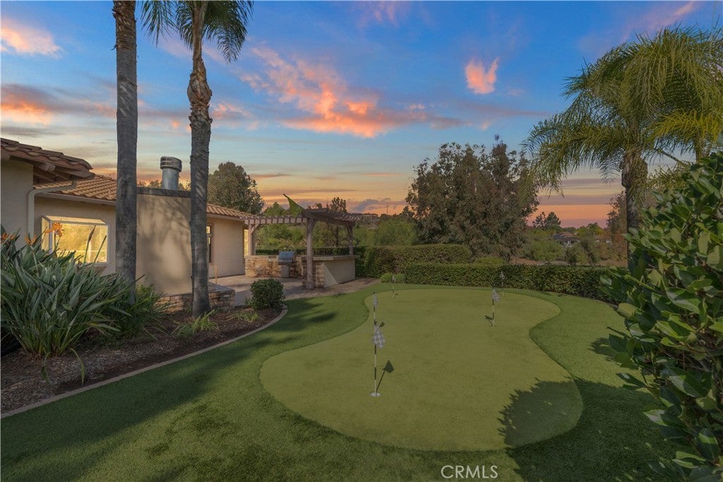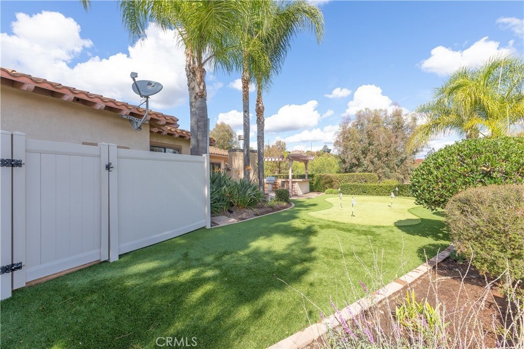 Check out this sprawling single level on over one-half of an acre in Sycamore Ranch, a community set around The Golf Club of California golf course. The Community of Sycamore Ranch has low turnover, large single stories on private, large lots. There is no HOA or Mello Roos This home features timeless, high-end finishes such as engineered hardwood, a gorgeous remodeled kitchen with light colored shaker cabinets, quartz countertops, pot drawers, a vegetable sink in the island and KitchenAide appliances. The flowing floor plan offers a formal living room with huge windows showcasing the back of the property and the views. The separate family room with fireplace offers two different sliding glass doors to two separate patios. One patio at the back has a gas fire pit to sit around on chilly nights. The large side patio provides a built-in-grill and mini-refrigerator, fireplace and bar for seating. There is also a putting green just off the patio. The primary suite with fireplace has direct sliding door access to the back patio, two walk-in closets, a custom tile-shower, and large makeup vanity between the separate vanities with sinks. Two secondary bedrooms are separated from both the primary and each other. Every bedroom offers privacy and the secondary bedrooms are well-located with a bathroom next to each. The laundry room with cabinets has both gas or electric hookups to the dryer. The three car garage with epoxy flooring has storage cabinets for all your seasonal decor, outdoor supplies and tools. The wide lot and big side yards offer distance between immediate neighbors and plenty of room for a pool and spa. One of the most convenient locations in Fallbrook with easy access to the 76 so you can head to the beach, the freeways, casinos, shopping without having to take time to get through town. Solar is owned so it will be a no-hassle transfer. One of the few homes with fire sprinklers which can benefit with homeowner's insurance. Call today for private tour.