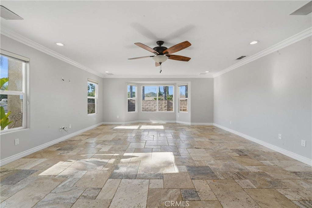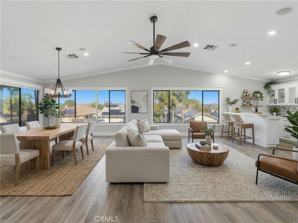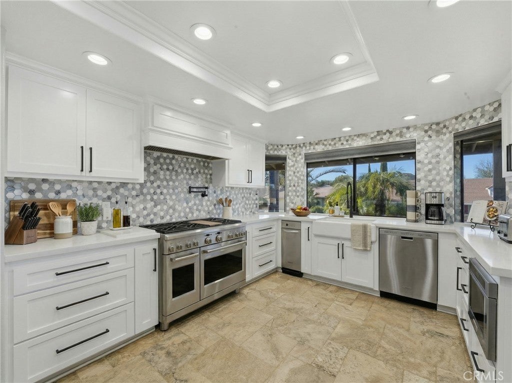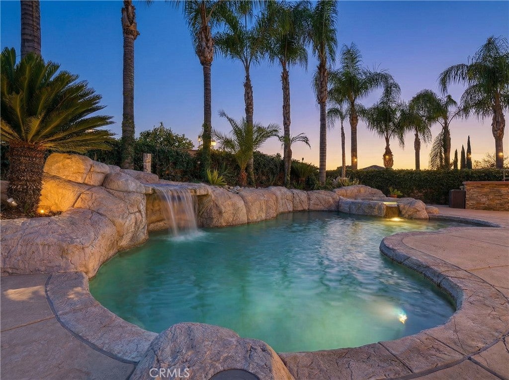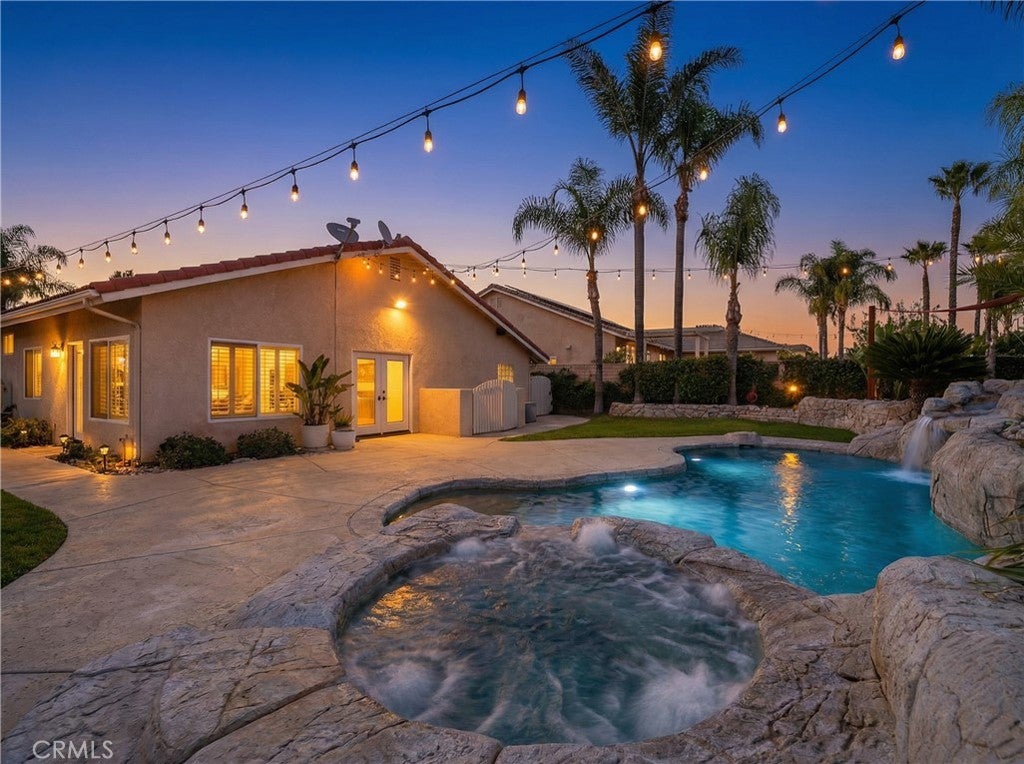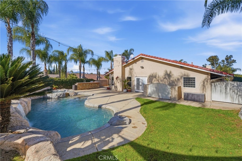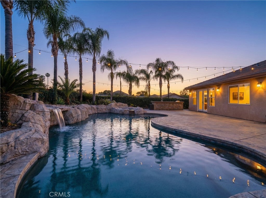 Welcome to a rare single-story retreat where refined design meets resort-style living. Set on a spacious corner lot within the private, gated community of Canyon Lake, this beautifully upgraded home blends comfort, sophistication, and outdoor luxury in a layout perfect for both everyday living and entertaining. From the moment you arrive, pride of ownership is evident. Inside, enjoy a light-filled, open-concept design with fresh paint, high ceilings, luxury vinyl and travertine flooring, crown molding, recessed lighting, newer interior doors, and designer finishes throughout. The flexible floor plan offers three bedrooms plus a dedicated office and 2.5 bathrooms. The chef’s kitchen is a true showpiece with quartz countertops, an oversized island, premium stainless-steel appliances, double ovens, a six-burner cooktop with griddle and pot filler, pull-out storage, and custom finishes — all flowing seamlessly into the dining and family rooms, highlighted by a statement fireplace, built-in mini bar with wine refrigerator, and expansive backyard views. The primary suite is a private sanctuary with custom cabinetry, a spa-inspired bath featuring a jetted soaking tub and walk-in shower, and a generous walk-in closet. The office features stylish barn doors and custom built-ins, ideal for working from home or creating a private study. An indoor laundry room with sink and extra storage adds everyday convenience. Outside, enjoy true resort-style living with a dramatic saltwater rock pool and spa with waterfall, reef step, and PebbleTec finish, a fully equipped outdoor kitchen and BBQ island, and a separate fire-pit lounge for unforgettable evenings. A covered deck off the living room offers the perfect place to enjoy sunset views. An oversized four-car garage with its own half bath provides exceptional space for vehicles, storage, and hobbies. Meticulously maintained and move-in ready, this exceptional home offers a rare opportunity to enjoy luxury, privacy, and the Canyon Lake lifestyle — all in one remarkable property.