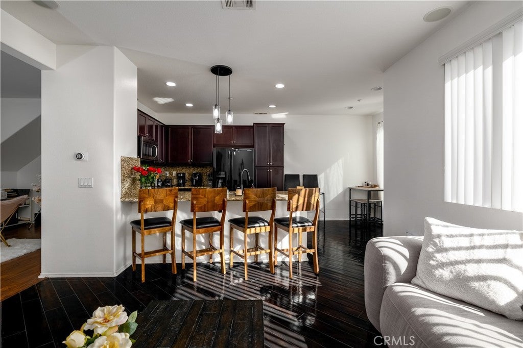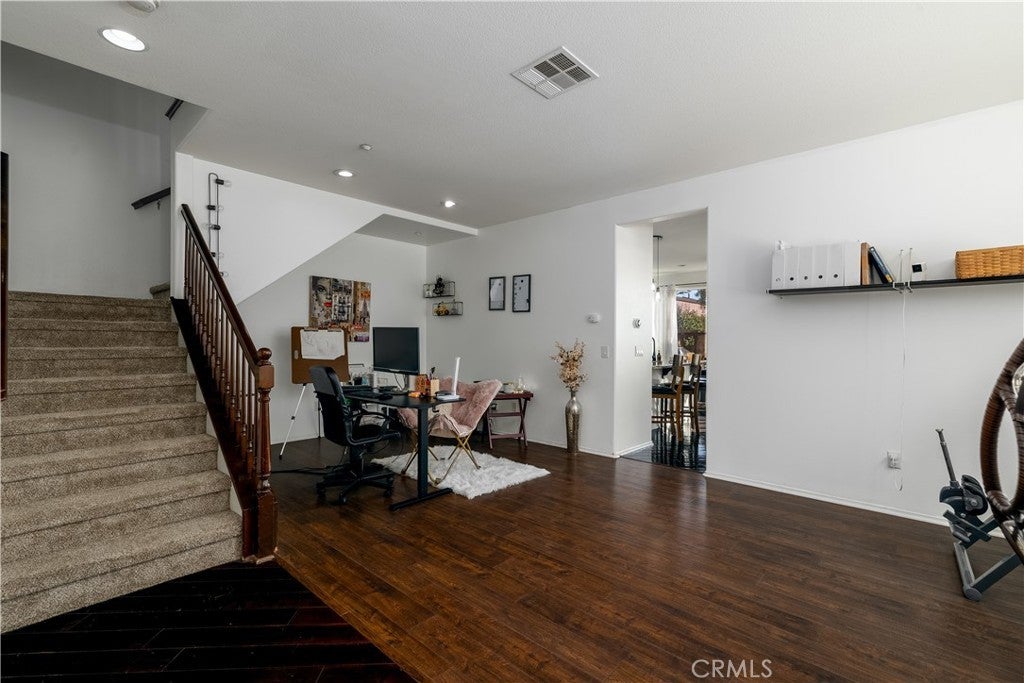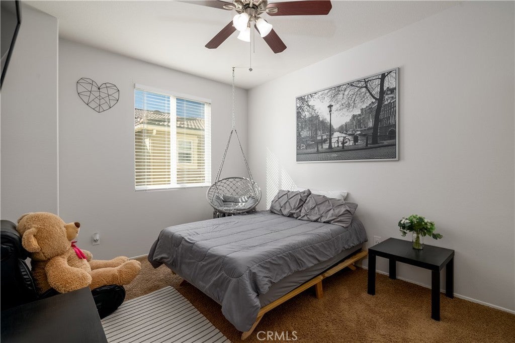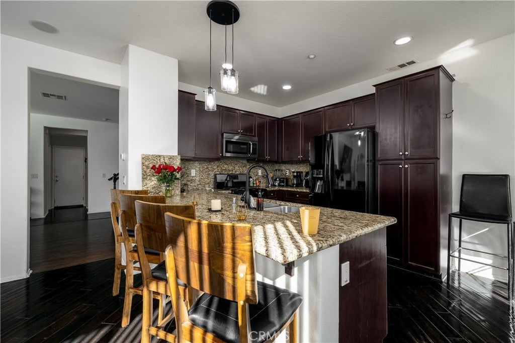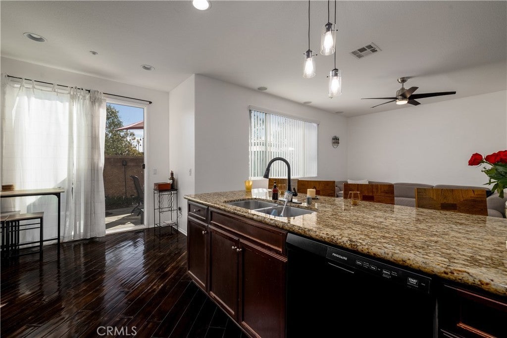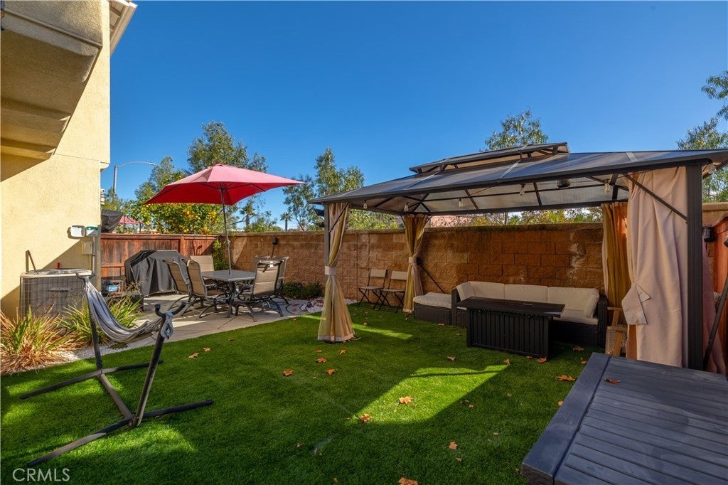 FHA/VA Approved! 3 BED, 2.5 BATH CONDO. Featuring PRIVATE ENTRY and an ATTACHED 2-CAR GARAGE, creating the feel of a standalone residence. SOLAR and BACK-UP BATTERY perfect for Electric Vehicles! CLOSE to FREEWAY, SHOPPING and SCHOOLS. The main level welcomes you with a formal entry and living space, highlighted by wood flooring throughout. Just off the kitchen, the spacious family room is perfect for relaxing or entertaining. The kitchen is thoughtfully designed with granite countertops, rich dark cabinetry, and ample storage, while abundant natural light pours in from the backyard, creating a bright and inviting atmosphere. Main level also includes laundry room and half bathroom with pedestal sink. Step outside to your private backyard oasis, complete with artificial turf, a concrete patio, and a gazebo included for shade—ideal for outdoor dining, playtime, or unwinding after a long day. Upstairs, the primary suite offers a peaceful retreat with a private bathroom featuring dual sinks, a walk-in shower, and a walk-in closet. Down the hall, you’ll find two generously sized guest bedrooms and a full bathroom with a tub/shower combo, perfect for family or guests. Additional highlights include solar with a backup battery, providing excellent energy savings and efficiency. The community offers resort-style amenities, including a pool, park, and front yard maintenance covered by the HOA, making for low-maintenance living. Conveniently located just off the 215 freeway, this home is close to Costco, gas stations, Starbucks, Target, shopping, dining, and everyday essentials. Plus, highly regarded schools are within walking distance, making this an ideal place to call home. This move-in-ready condo checks all the boxes—location, efficiency, amenities, and style—don’t miss it!