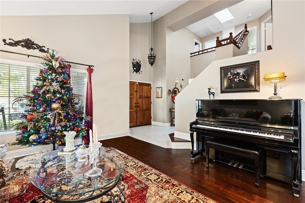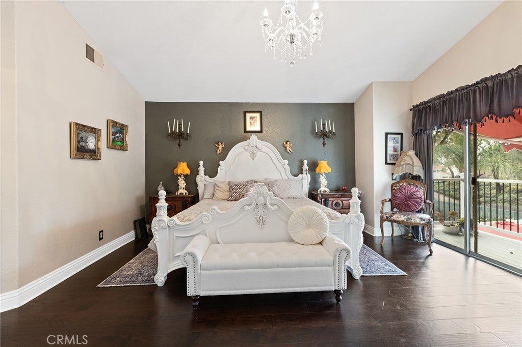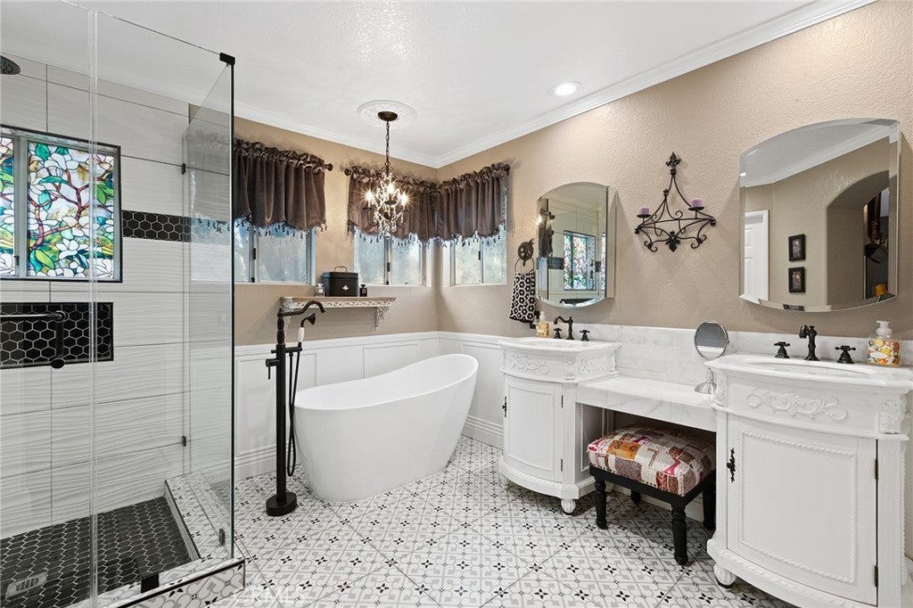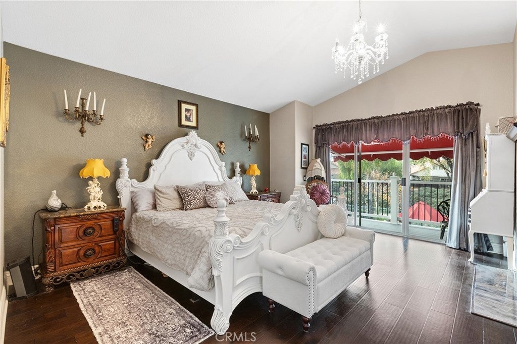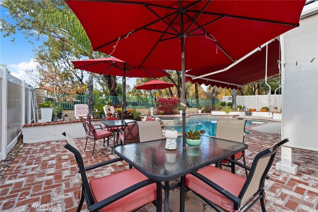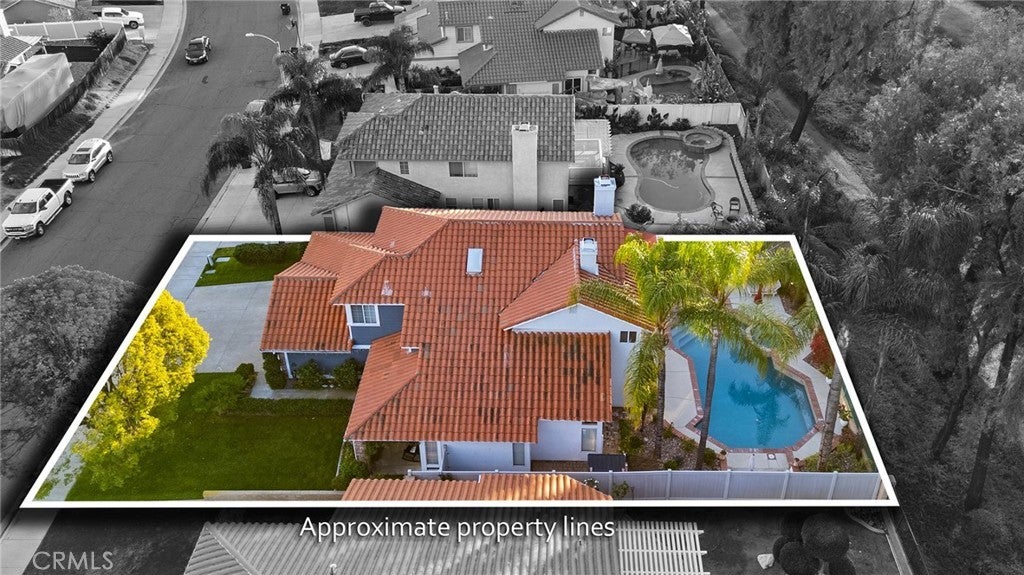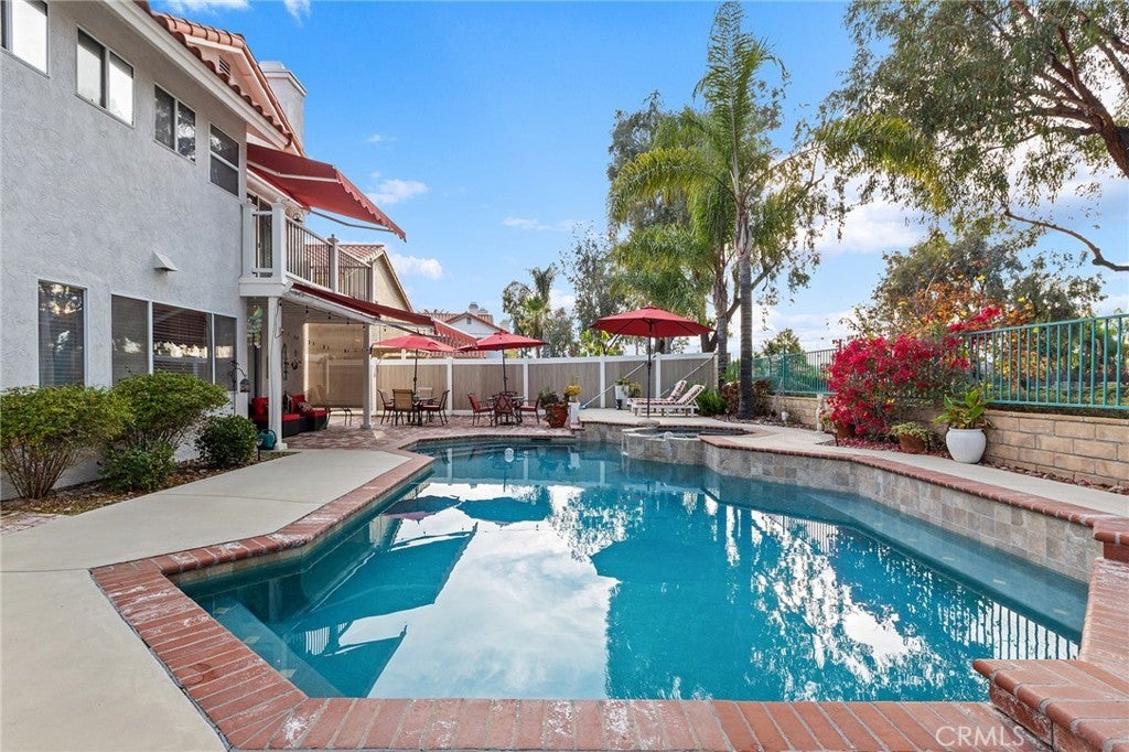 Great Location, Gorgeous upgrades, Pool & spa & No Rear Neighbors! Relax in the large front porch with the sound of an elegant water fountain, the smell of beautiful flowers and views of the plush lawn & front yard trees. A double door entrance leads into a grand foyer with soaring ceilings & an impressive staircase that opens to an opulent living room and formal dining room. Cathedral ceilings accentuate the flowing natural light of this home and contrast the beautiful dark wood flooring & the white upgraded baseboards throughout. The beautifully remodeled kitchen features white cabinets, pullout shelves, Quartz countertops, white backsplash & al dry bar area. The kitchen/breakfast area opens to the family room which features a beautiful fireplace refaced with mosaic Spanish tile and a dark wood mantle. The picture perfect backyard is a traditional yet resort-like setting defined by warm red brick paving that frames a sparkling pool/spa, all under a canopy of vibrant green trees. There are covered seating areas lined with flowers & no neighbors in the back. Back inside the home there is a bedroom & full bath on the main floor with exterior access near the laundry room, which is ideal for multi generational living or a Nex Gen Suite. The second floor offers three bedrooms and two bathrooms. The oversized primary bedroom showcases cathedral ceilings, crystal chandelier, corner fireplace with marble-like tile, an accent wall. The extra wide sliding door leads to the trex balcony with custom vinyl/metal railing which allows panoramic views of the gorgeous backyard and green forested area in the back. The primary bathroom has been luxuriously remodeled with ornate Spanish tile flooring, a sleek black/white tile shower, free standing tub, custom double vanity with powder area and custom chandelier & plumbing fixtures. The guest bedrooms are generously sized and remodeled with chair railings & custom paint. The guest bathroom has also been upgraded with modern grey Quartz countertops, a beautiful tiled bathtub/shower, intricate black/white tile flooring, modern cabinets & backsplash and beautiful plumbing fixtures. This home offers countless upgrades including a whole house water softener, extendable canopies, soft close drawers/cabinets, updated light fixtures & flooring throughout, large storage shed, vinyl fences, mirrored closet doors & more! Super low taxes, NO HOA & walking distance to schools, shopping, dining & I-215 make this is the perfect home!