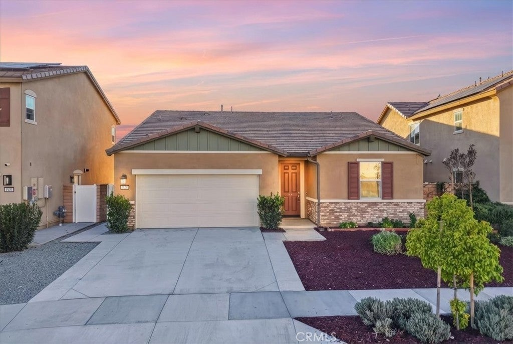 MOTIVATED SELLERS! Single-story - Cul-de-sac - No rear neighbors - LVP Flooring Built in 2021, this single-story home is located on a quiet cul-de-sac and offers a functional open-concept layout with no rear neighbors. The kitchen features granite countertops, a large center island, large walk-in pantry, and flows directly into the main living area. Luxury vinyl plank flooring runs throughout the primary living spaces. The primary suite is positioned separately from the secondary bedrooms, providing added privacy, and includes an ensuite bath and walk-in closet. Additional features include a very large laundry room and attached two-car garage. The backyard is fully enclosed with block and vinyl fencing and offers an open rear setting. Front landscaping is owner maintained. The home includes leased solar. Community amenities include a pool, spa, and walking trails. Conveniently located near shopping, dining, regional recreation, and freeway access. Proximity to Diamond Valley Lake and access toward Idyllwild make this location well positioned for both everyday needs and outdoor activities.