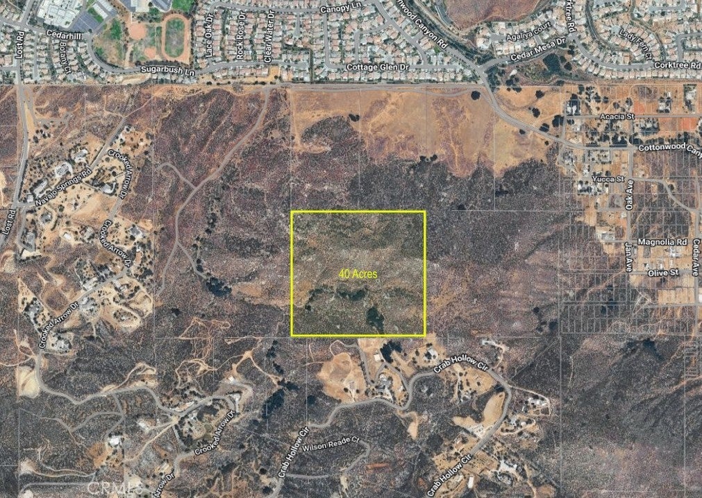 Views for miles---Fantastic opportunity to own and develop this private parcel of land into a hilltop estate with majestic views all around. Vacant land with utilities nearby with panoramic views of the neighbors below and surrounding mountains. 40 acre parcel located off of Turtle Creek Rd and Crab Hallow Circle. Several potential homesite pads that allow you to have privacy and views. Zoned RA1. Residential agriculture 1- typically requires a minimum one-acre lot size, blending rural living with limited residential and agricultural uses, allowing single-family homes, some farming, and accessory structures, while promoting orderly growth and preserving open space. Peaceful, elevated setting within a few minutes of desired amenities-- shopping, schools, medical. Per Elsinore Valley Municipal Water District website, the property does not have access to nearby sewer so septic system would be necessary but there appears to be water access on Crab Hollow Circle. Imagine the possibilities of creating your own hilltop estate!!