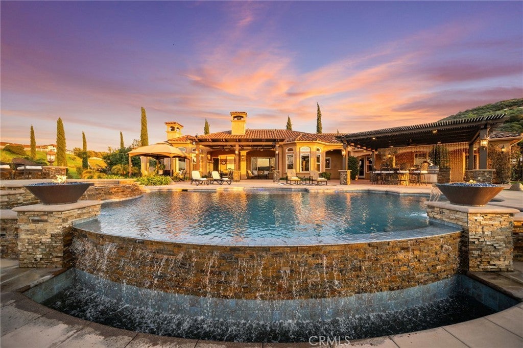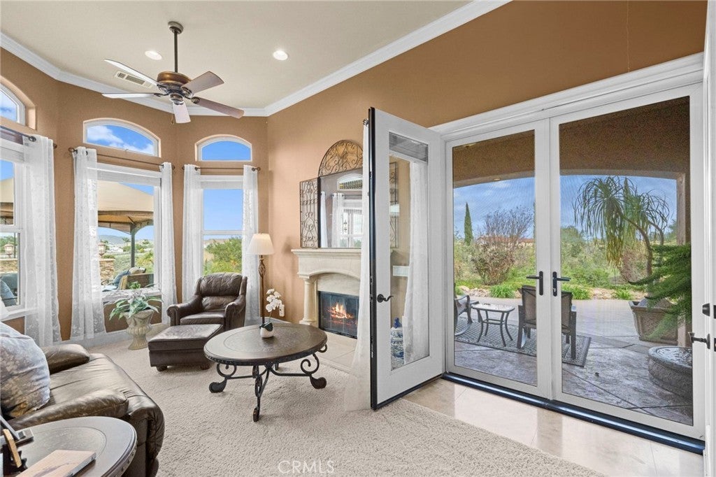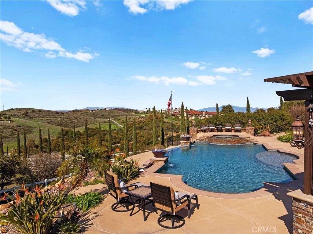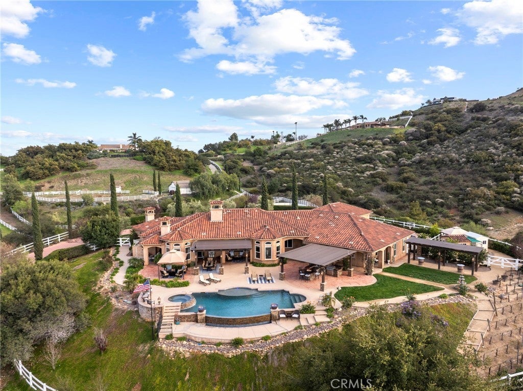 Private 5.65 acres of rolling hills in the peaceful community of La Cresta, 21051 Via Sevilla is a contemporary single-story estate offering 5,152 square feet of refined living. This property blends luxury, privacy, and the natural beauty of Southern California’s countryside into one exceptional retreat. The home features five spacious bedrooms, five bathrooms, an office, a game room, a library, and an exercise room—each space thoughtfully designed for comfort and versatility. Inside, coffered lighting and an effortless layout create a warm, welcoming flow. The gourmet kitchen stands out with high-end appliances, an oversized walk-in pantry, and a generous center island, making it perfect for everyday living and effortless entertaining. It opens to expansive living and dining areas, where large windows frame sweeping views of the surrounding landscape. A stylish wet bar and a temperature-controlled wine room—capable of storing up to 400 bottles—add an elevated touch for those who love to host. The primary suite is a true sanctuary, complete with two fireplaces, a spa-inspired bathroom, and dual walk-in closets. Each additional bedroom includes its own en-suite bathroom and walk-in closet, showcasing the home’s attention to detail and craftsmanship. Step outside to a resort-style oasis featuring a sparkling pool, spa, and a fully equipped outdoor kitchen. The grounds are beautifully landscaped and enhanced by a charming boutique vineyard—an exceptional feature for wine enthusiasts. A high-capacity 100 GPM well provides ample water for the vineyard and fruit trees. With generous flat land, the property offers endless possibilities: add equestrian facilities, build a guest house, create additional parking, or simply enjoy the open space and tranquility. Known for its serene, upscale lifestyle, La Cresta provides the perfect backdrop for this remarkable estate. With panoramic mountain views, unforgettable sunsets, and room to roam, this property offers a rare opportunity to live in harmony with nature while enjoying the finest comforts of luxury living.