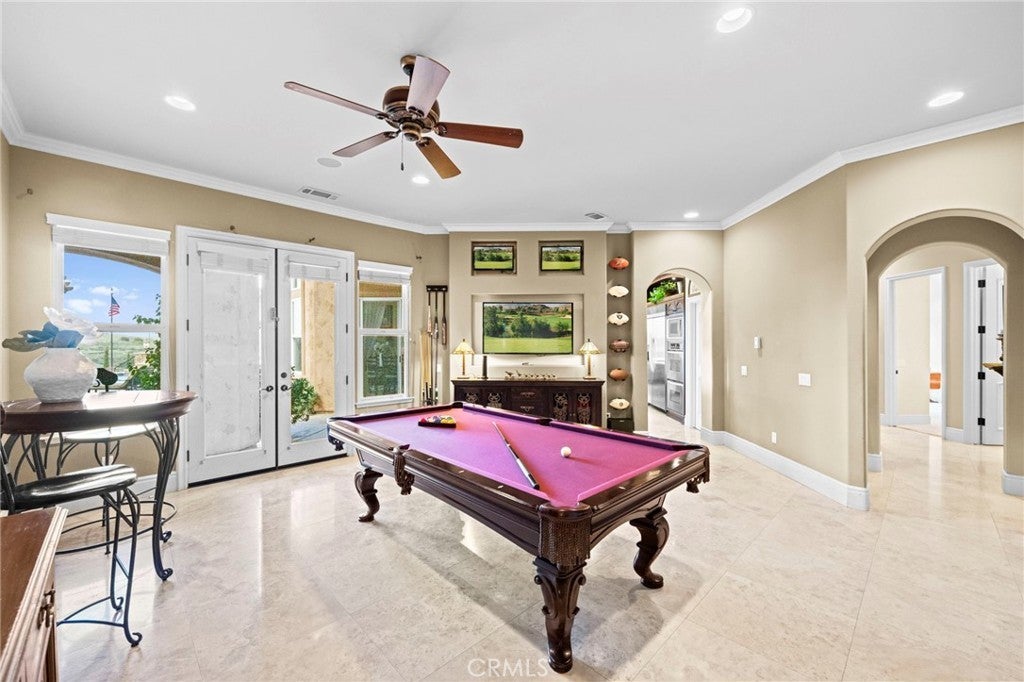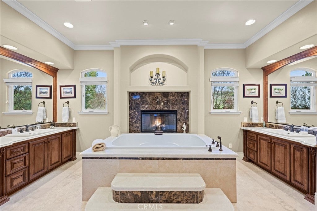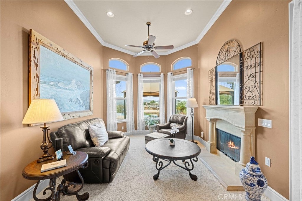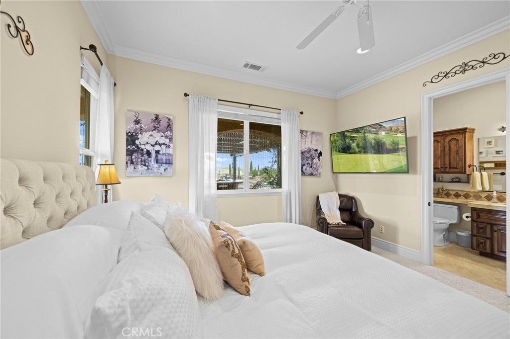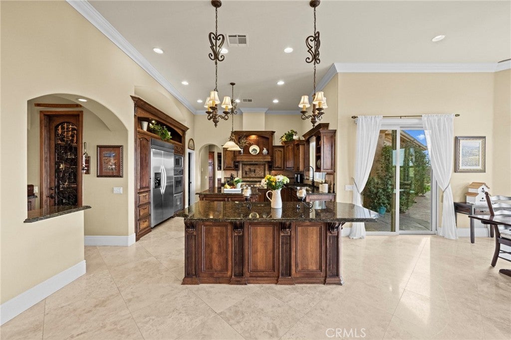 Private 5.65 acres of rolling hills in the peaceful community of La Cresta, 21051 Via Sevilla is a contemporary single-story estate offering 5,152 square feet of refined living. This property blends luxury, privacy, and the natural beauty of Southern California’s countryside into one exceptional retreat. The home features five spacious bedrooms, five bathrooms, an office, a game room, a library, and an exercise room—each space thoughtfully designed for comfort and versatility. Inside, coffered lighting and an effortless layout create a warm, welcoming flow. The gourmet kitchen stands out with high-end appliances, an oversized walk-in pantry, and a generous center island, making it perfect for everyday living and effortless entertaining. It opens to expansive living and dining areas, where large windows frame sweeping views of the surrounding landscape. A stylish wet bar and a temperature-controlled wine room—capable of storing up to 400 bottles—add an elevated touch for those who love to host. The primary suite is a true sanctuary, complete with two fireplaces, a spa-inspired bathroom, and dual walk-in closets. Each additional bedroom includes its own en-suite bathroom and walk-in closet, showcasing the home’s attention to detail and craftsmanship. Step outside to a resort-style oasis featuring a sparkling pool, spa, and a fully equipped outdoor kitchen. The grounds are beautifully landscaped and enhanced by a charming boutique vineyard—an exceptional feature for wine enthusiasts. A high-capacity 100 GPM well provides ample water for the vineyard and fruit trees. With generous flat land, the property offers endless possibilities: add equestrian facilities, build a guest house, create additional parking, or simply enjoy the open space and tranquility. Known for its serene, upscale lifestyle, La Cresta provides the perfect backdrop for this remarkable estate. With panoramic mountain views, unforgettable sunsets, and room to roam, this property offers a rare opportunity to live in harmony with nature while enjoying the finest comforts of luxury living.