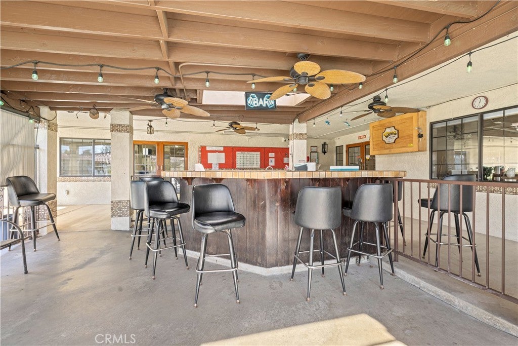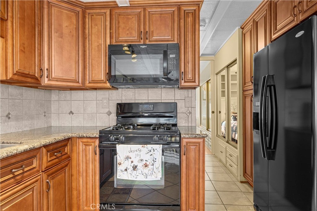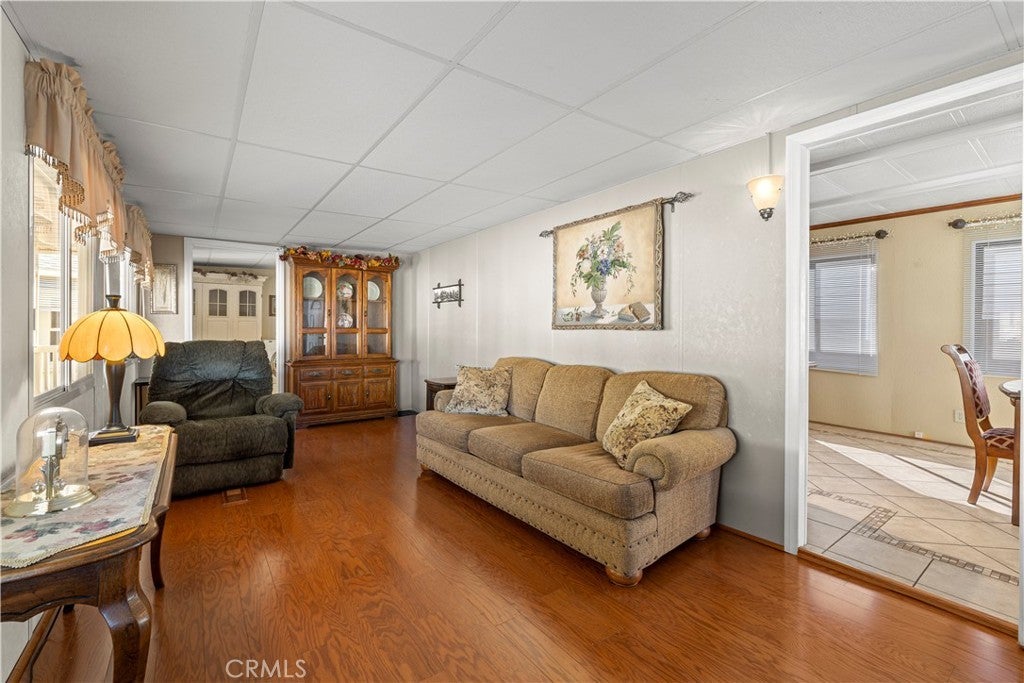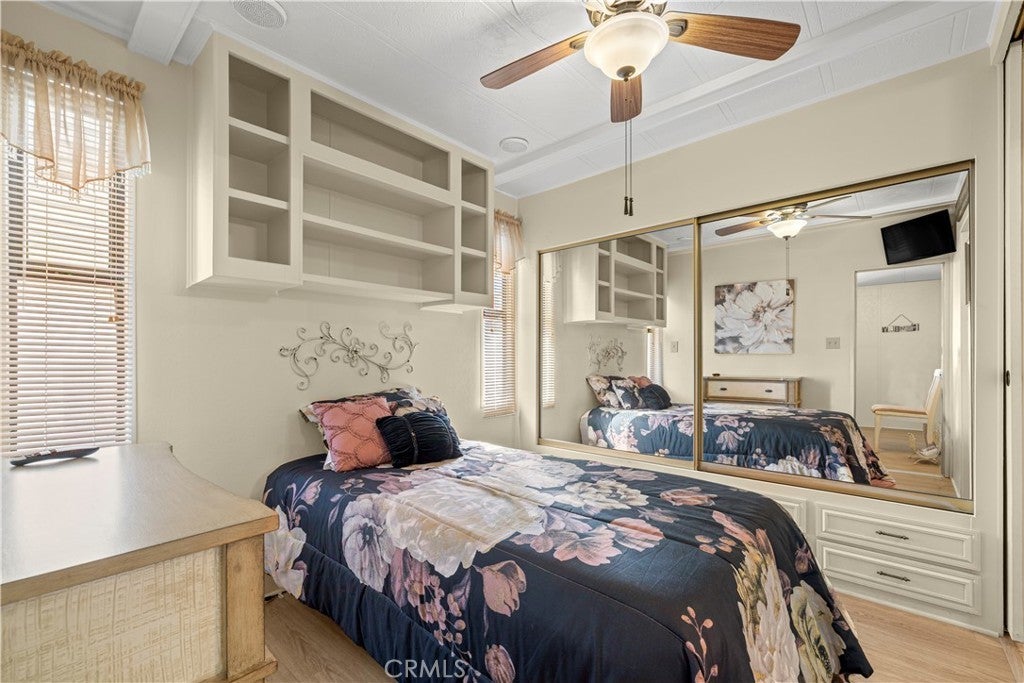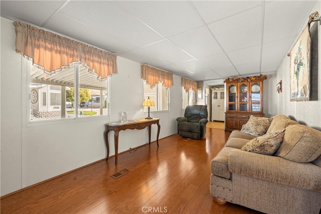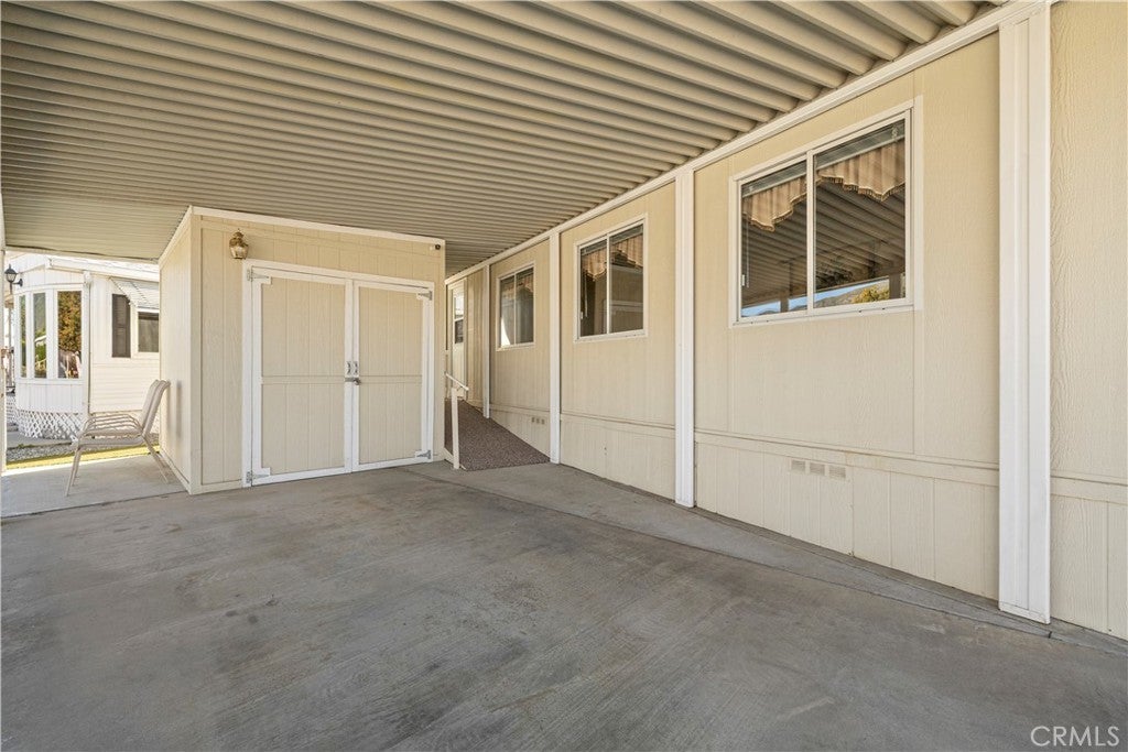 Welcome to Heritage Ranch, a gated 55+ active senior community offering comfort, convenience, and resort-style amenities. This charming 1985 park model with a thoughtfully designed addition offers approximately 700 sq ft of well-utilized living space with stunning views of the San Jacinto Mountains. The upgraded kitchen features updated cabinetry, granite countertops, stainless steel appliances and sink, and a stylish tiled backsplash, complemented by hardwood and tile flooring throughout and ceiling fans for year-round comfort. The spacious bathroom includes an enlarged corner shower, and the home is equipped with a tankless water heater. Additional highlights include an indoor laundry room with storage, handicap ramp access, and an oversized storage shed providing ample space for tools, hobbies, or seasonal items. Washer, dryer, and furniture are included, making this home truly move-in ready. Heritage Ranch offers amenities galore, including a clubhouse, gym, indoor spa, outdoor pool, recreation area, and library, creating an ideal setting for an active and social lifestyle. Enjoy low taxes and a low HOA of $218/month, which includes water, sewer, trash, basic cable, and internet. Conveniently located near shopping and medical offices, this home is the perfect blend of comfort, accessibility, and community.