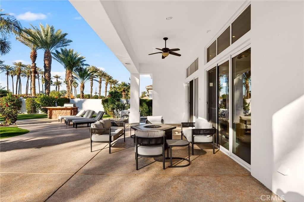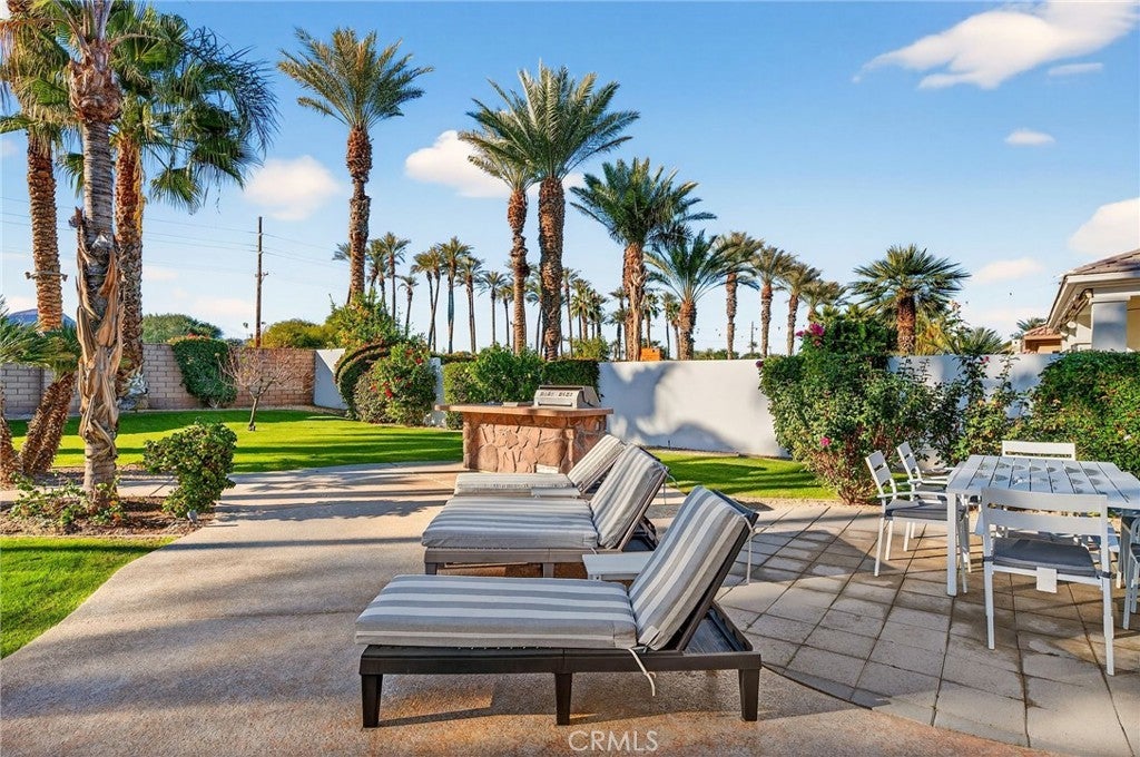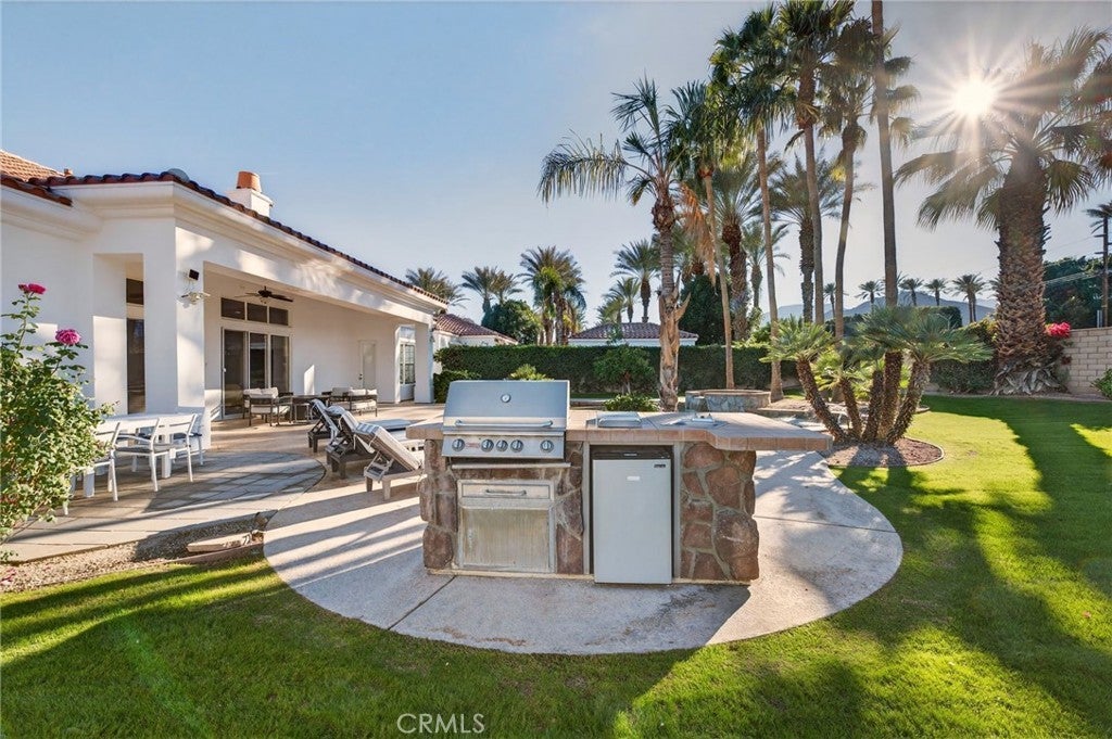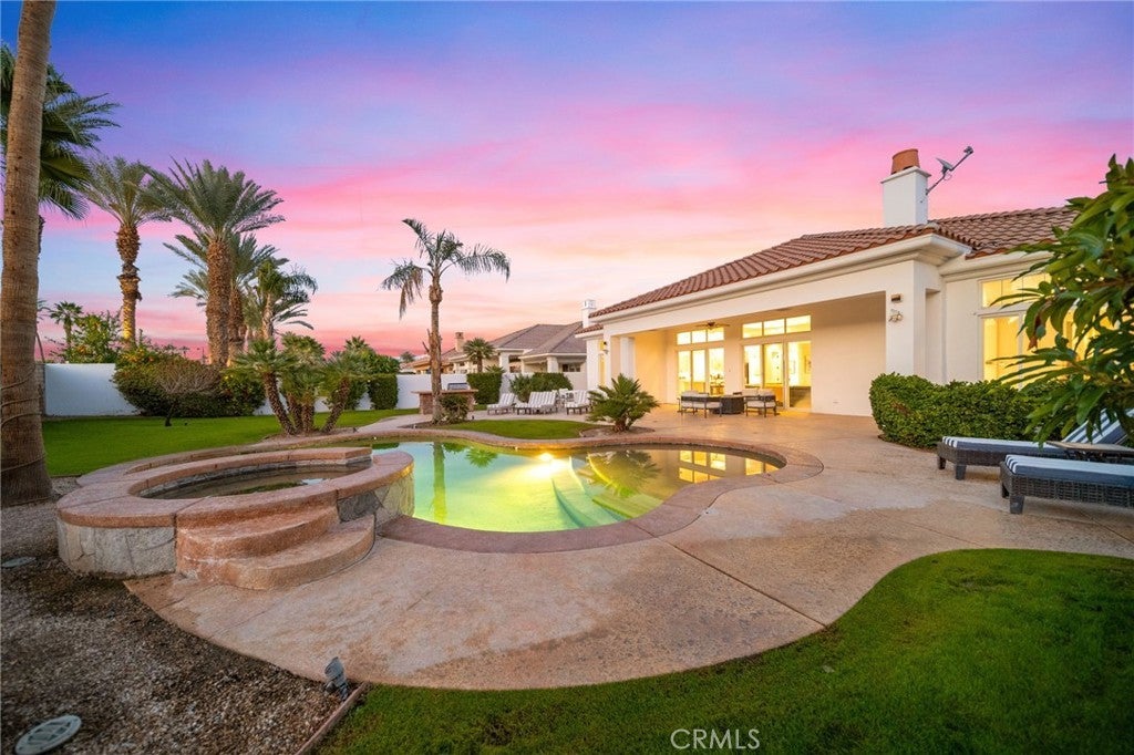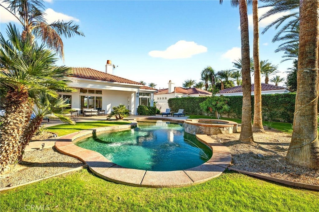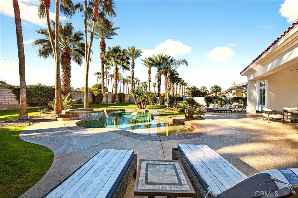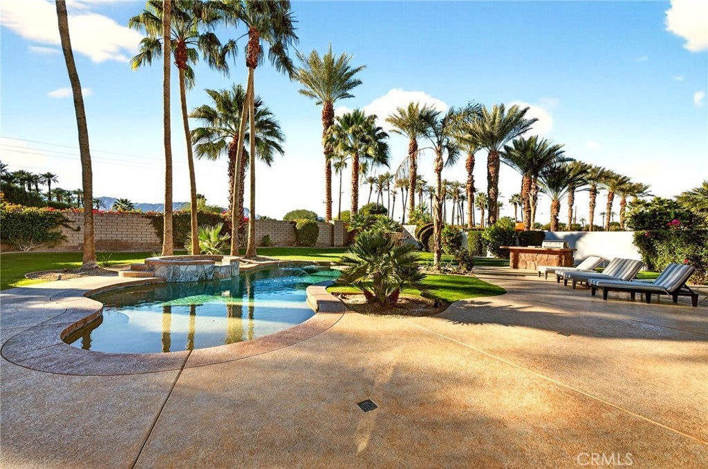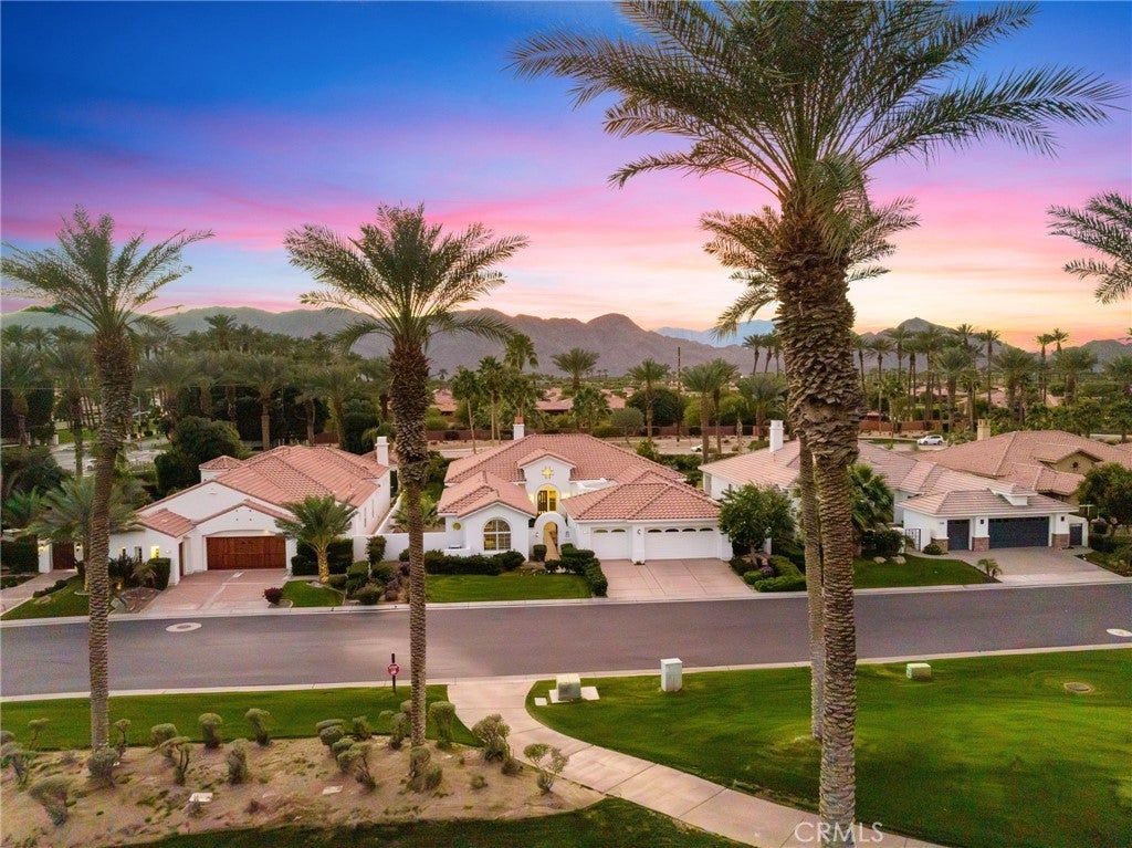 Welcome to your private desert retreat in the prestigious Mountain View Country Club in La Quinta, ideally situated just off the 8th hole of this highly sought after Arnold Palmer designed golf course community. This exceptional residence offers the perfect blend of luxury, comfort, and resort style living. Spanning over 3,600 square feet, this beautifully appointed home features 4 bedrooms and 4.5 bathrooms, including a private guest casita ideal for hosting friends and family with comfort and privacy. Inside, modern elegance meets timeless design with new flooring throughout, creating a warm and inviting atmosphere. The thoughtfully updated kitchen is a true centerpiece, showcasing high-end appliances, refined finishes, and generous workspace, perfect for both everyday living and entertaining. Additional highlights include a 3 car garage with built-in cabinetry, providing ample storage and functionality. Step outside to a stunning west facing backyard designed to capture breathtaking sunset views over the surrounding desert mountains. This expansive outdoor oasis features a large pool and spa, built-in barbecue, and multiple seating and entertaining areas, making it ideal for hosting gatherings or enjoying peaceful moments of relaxation just steps from the fairway. As a resident of Mountain View Country Club, you’ll enjoy access to an exceptional clubhouse and world-class amenities, including championship golf on the Arnold Palmer course, tennis, pickleball, and a vibrant social scene all within one of the Coachella Valley’s most desirable private communities. This is desert living at its finest where elegance, leisure, and location come together seamlessly.