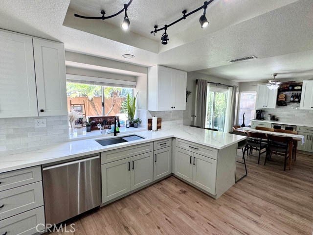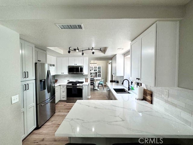 This beautiful home located in the heart of Murrieta features 4 bedrooms, 3 bathrooms, and a generous 2,222 square feet of living space, complete with Solar! Upon arrival, you'll be greeted by lush landscaping and an inviting exterior, enhanced by a roomy driveway and a convenient 3 car garage. Coming inside, the home exudes a bright and airy ambiance throughout. Recently renovated, the main level showcases a modern aesthetic with light paint tones and stylish and durable vinyl flooring. On this floor, you'll find the living room, formal dining area, family room, a bedroom, full bathroom, laundry room, and a stunning remodeled kitchen. The kitchen is stunning, featuring quartz countertops, sleek shaker-style cabinets, stainless steel appliances, and opens to an additional dining space with a built in bar area! Upstairs, you'll discover the remaining bedrooms, including the primary suite retreat. This expansive sanctuary includes a separate area ideal for a workspace or cozy seating, as well as a private patio surrounded by greenery. The ensuite bathroom is a tranquil haven, boasting dual sinks, a freestanding tub, a striking walk-in shower, and a generously sized walk-in closet. The other bedrooms on this level offer ample space and comfort for family or guests, with a conveniently equipped hallway bathroom featuring dual sinks and a shower tub combination. Outside, the backyard offers a serene oasis like setting, providing ample space for various outdoor activities. Don't miss the chance to see this remarkable home – schedule a showing today!