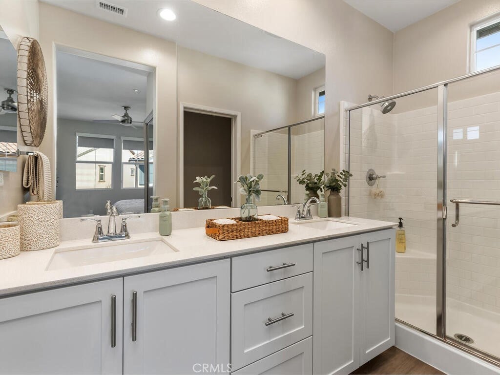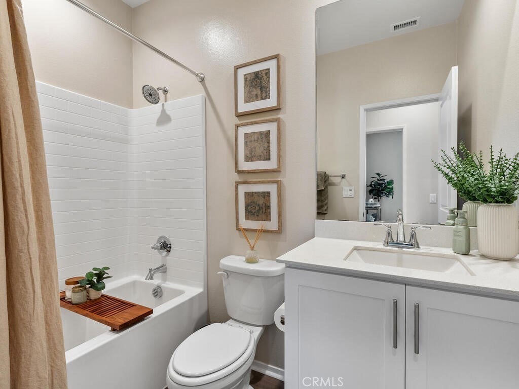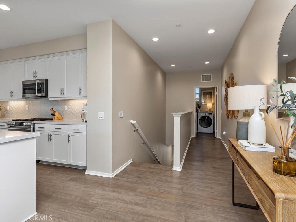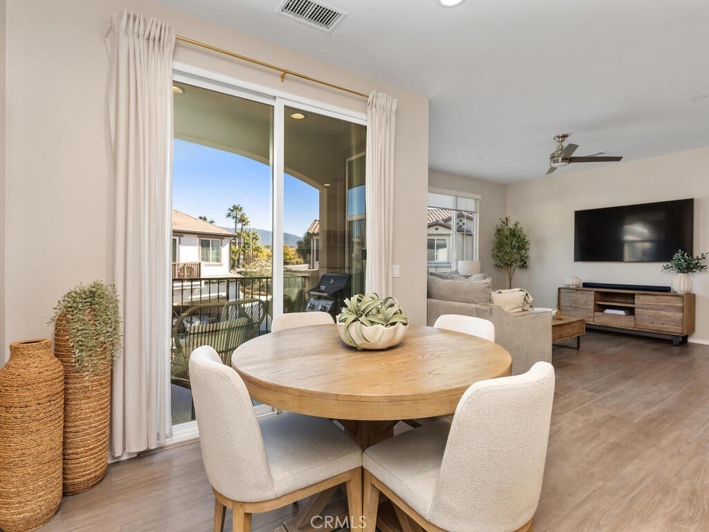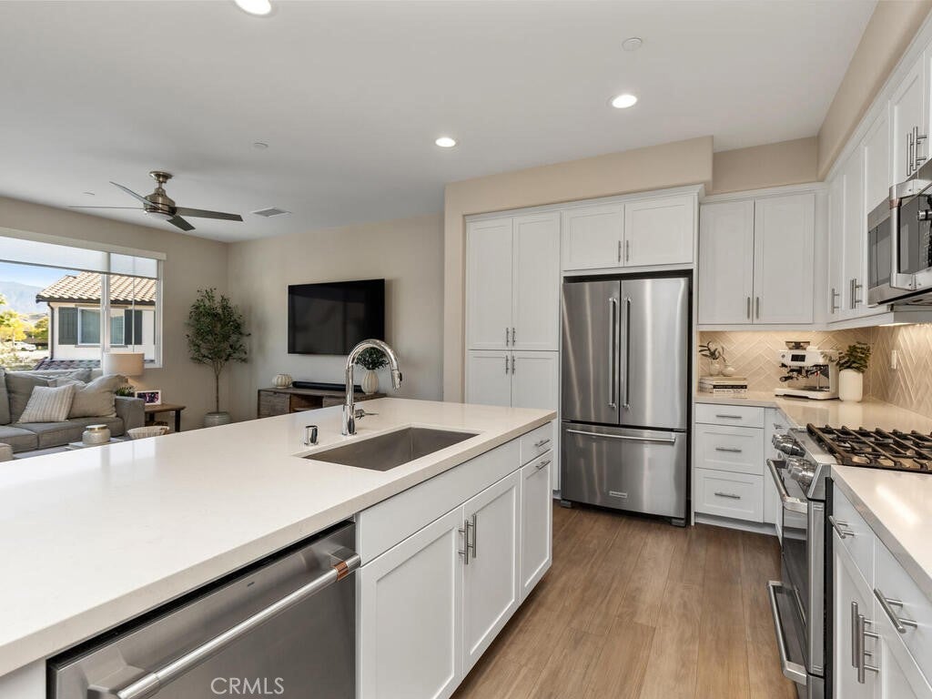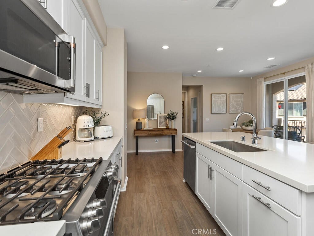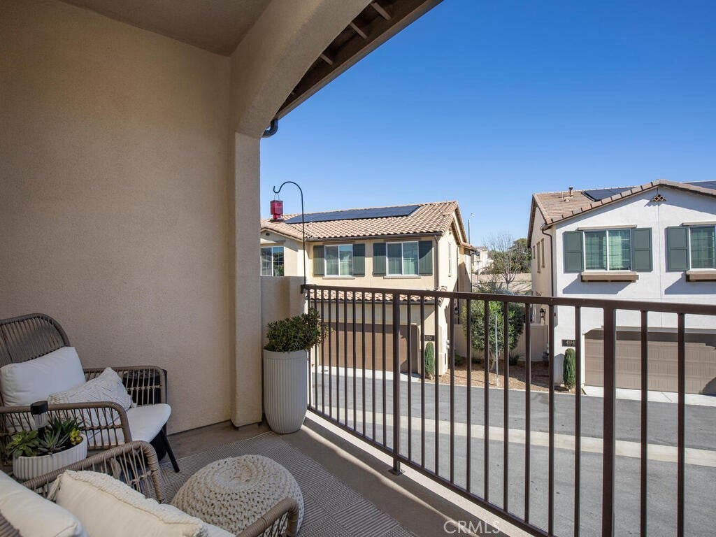 Immaculate and spacious, this upgraded condo is located in the highly sought-after gated community of Rancho Soleo. From the moment you enter, this home impresses with its pristine condition and thoughtful upgrades throughout. The entry hallway features Luxury Vinyl Plank flooring, convenient access to the garage, and a storage closet, with upgraded carpeted stairs leading to the main living level. As you approach the second level you'll immediately start falling in love with this exceptionally clean, beautifully decorated TURNKEY home that instantly feels welcoming. The stunning open-concept kitchen is a showstopper, featuring premium stainless steel appliances, quartz countertops, custom Herringbone layout subway tile backsplash, white shaker cabinetry with modern hardware, a single stainless steel sink, and under-cabinet lighting. The layout flows seamlessly into the dining and living areas, ideal for both everyday living and entertaining. Sliding doors from the dining area lead to a private balcony, offering effortless indoor-outdoor living—perfect for morning coffee, evening relaxation, or hosting guests. Down the hall, you’ll find a charming secondary bedroom accented with custom wainscoting that adds warmth and character. Across the hall is a stylish full bathroom featuring a quartz countertop, undermount sink, and white shaker cabinetry. At the end of the hall, you'll enter the spacious Primary Suite which offers a peaceful retreat, featuring abundant natural light, a generous closet and a private ensuite bath. Imagine unwinding in the inviting primary suite that was thoughtfully designed for relaxation and everyday comfort. The walkway along the staircase leads to a dedicated laundry room complete with a full wall of shelving for added storage. With numerous upgrades already completed, this move-in-ready home allows you to enjoy effortless living from day one. Conveniently located within the Temecula School District, close to the I-15 freeway, Pechanga Resort Casino, Journey Golf Course, city parks, and shopping. Welcome home—where comfort, style, and treasured memories come together.