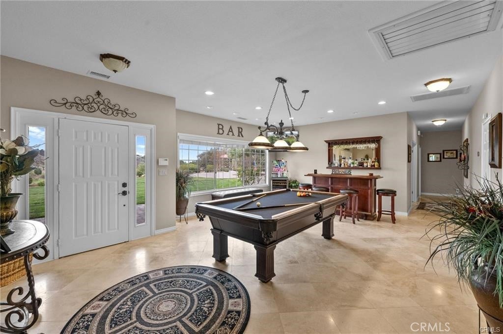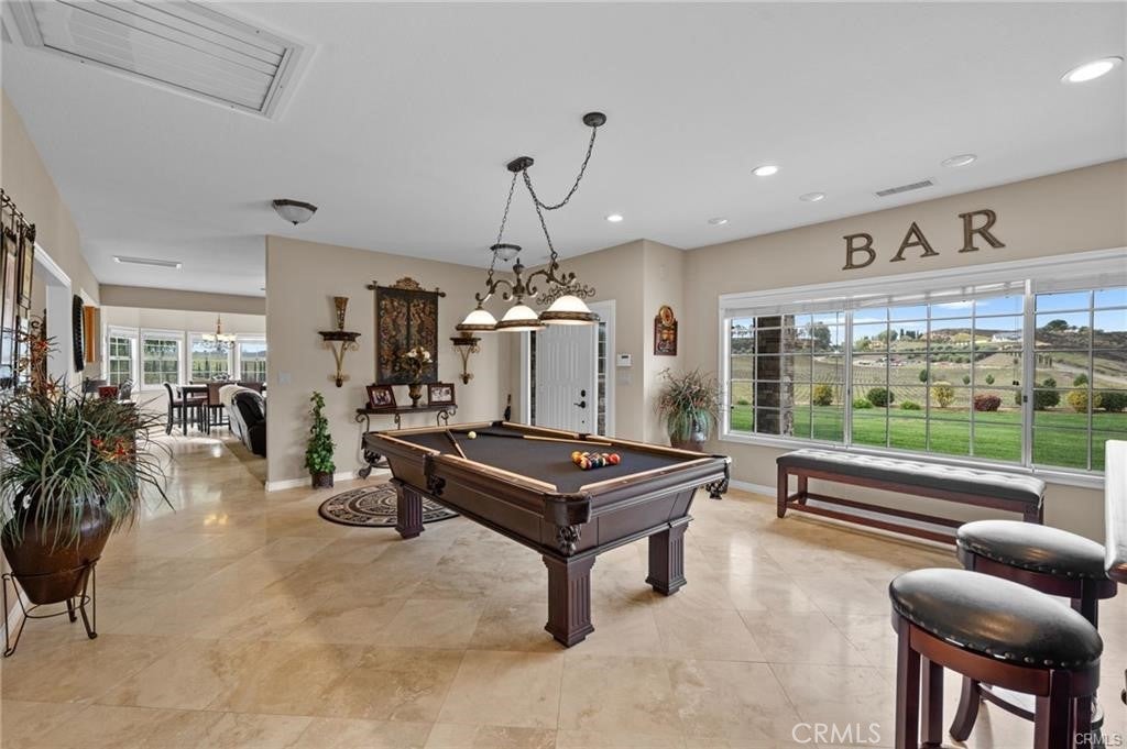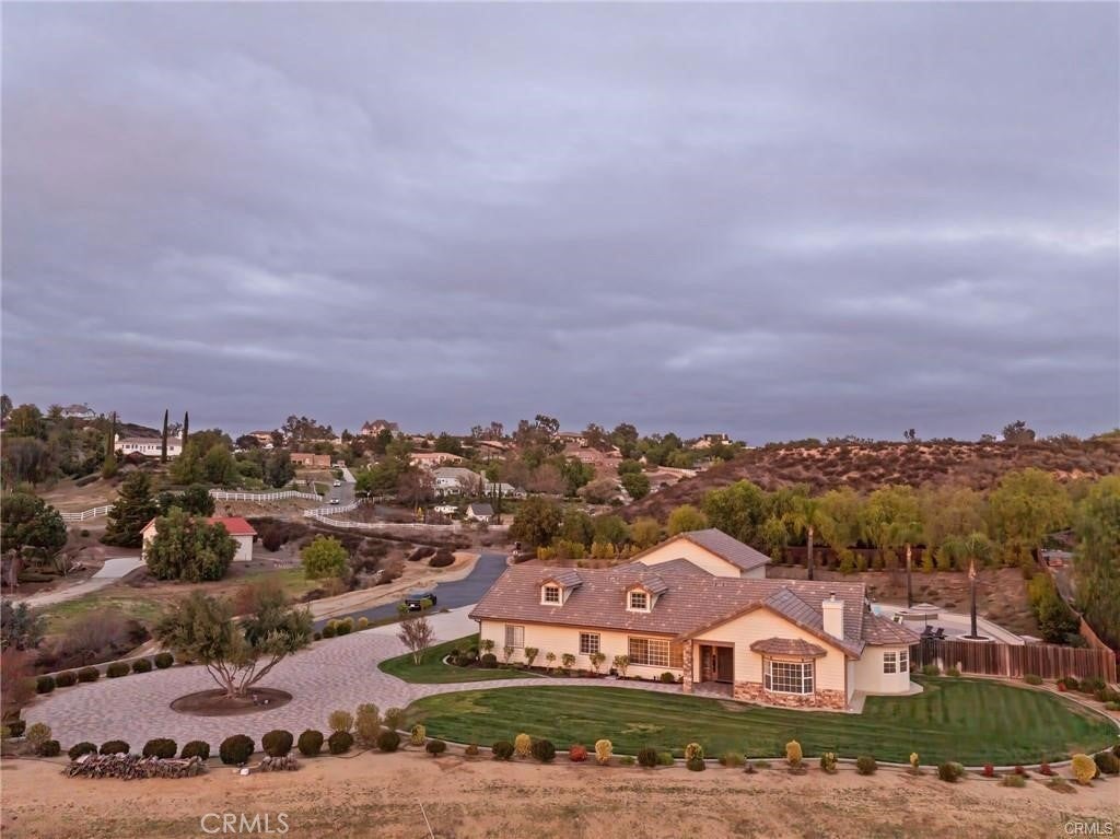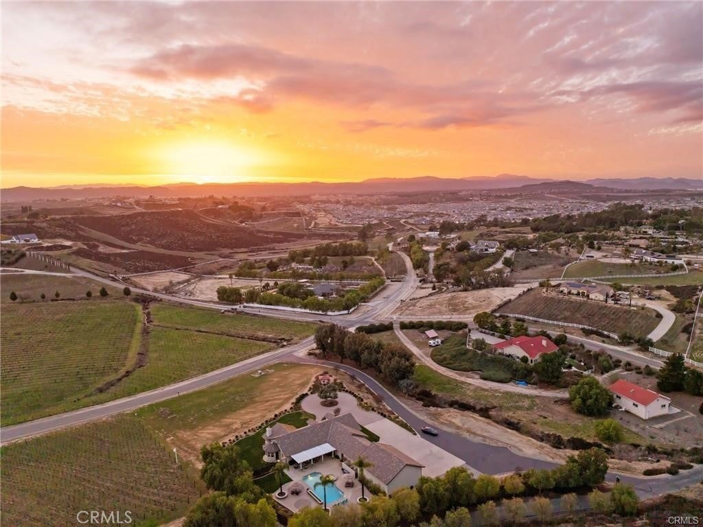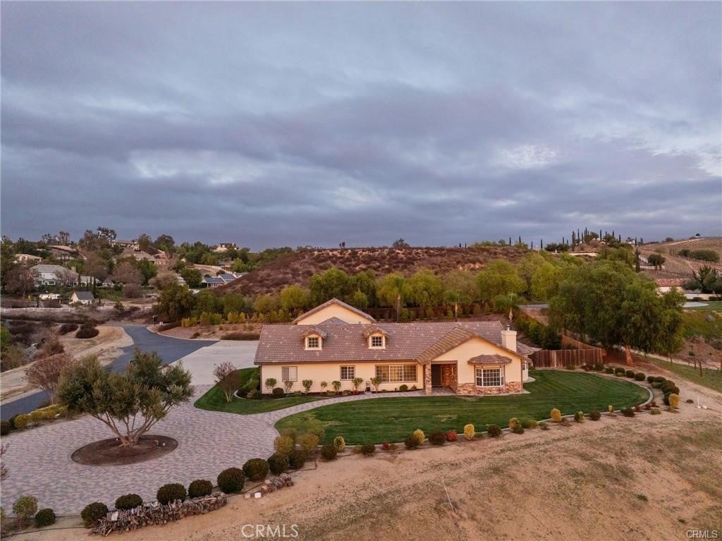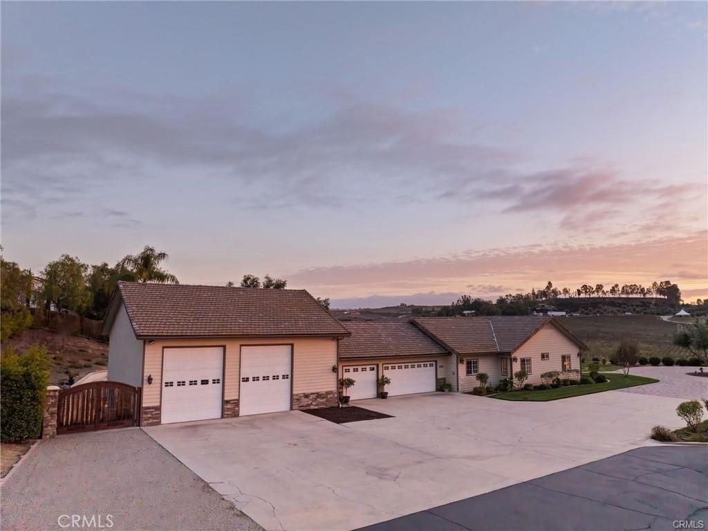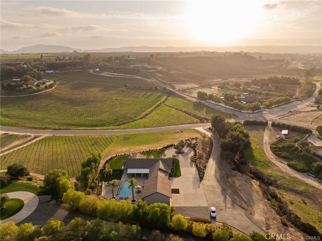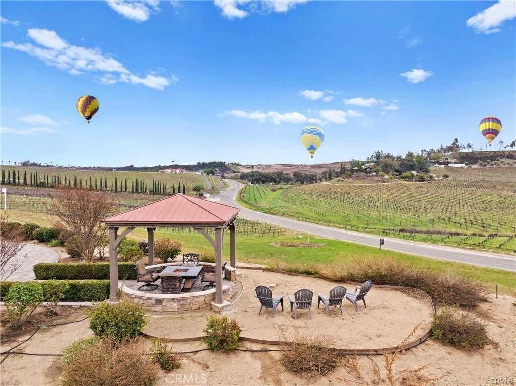 Nestled in the heart of the renowned Temecula Wine Country, this stunning single-story home offers a rare opportunity to live among the region’s most celebrated wineries including Falkner, Akash, and Long Shadow. Enjoy breathtaking panoramic views of the picturesque vineyards and the gentle sight of hot air balloons soaring across the sky, nearly every day. The location simply doesn’t get any better than this. Boasting 2,845 square feet of living space, this home sits on a generous 2.27-acre lot, with four spacious bedrooms, each featuring scenic views, this residence offers an inviting, open atmosphere. The expansive 2,006-square-foot garage with 12-foot ceilings and dual bays provides ample room for your RV, boats, or any of your hobbies—making this property truly a dream for enthusiasts of all kinds. Inside, you’ll find travertine flooring throughout. All of the bedrooms are generously sized, each offering its own stunning view of the surrounding vineyards. The cozy family room features a wood-burning fireplace and the chef’s kitchen is equipped with Corian countertops, an abundance of cabinetry, and a double oven, ideal for cooking and hosting.The home also boasts newly landscaped grounds, including a custom-engineered 30x30 paved driveway that leads to a 12x12 sitting area with a custom gazebo—perfect for outdoor relaxation. The backyard, complete with pavers and lush planters, offers a perfect spot for unwinding or entertaining guests by the sparkling pool and spa. An Alumawood patio cover with fans ensures comfort on warm summer days, making the outdoor space even more inviting. The property also offers a new asphalt private road, providing easy access and privacy. Additionally, there’s a graded space ideal for an ADU or shop, allowing for endless possibilities. Recent upgrades include a new roof job completed in 2024, a brand-new HVAC system, and a reverse osmosis and Kagan PH Alkaline Water System. Other thoughtful touches include two whole-house fans, a hot water circulation pump, ceiling fans, and cased windows throughout the home. Step outside to unwind and watch hot air balloons float gracefully over the vineyards. Enjoy peaceful walks to nearby wineries or simply bask in the tranquility and stunning scenery from your own backyard. Whether you’re entertaining guests or savoring a quiet evening, this home offers the ultimate Temecula Wine Country lifestyle.