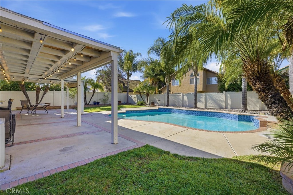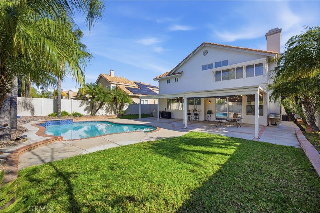This 4-bedroom, 2.5-bath home offers 2,722 sq ft of living space, a private pool, and no HOA, creating a comfortable setting for both daily living and entertaining. Inside, the formal living room and separate dining room provide welcoming spaces for gatherings. The back of the home features a spacious family room with a fireplace that opens to the kitchen, allowing for an easy, connected flow. The kitchen offers generous counter space, a large window overlooking the backyard, and a pass-through counter to the covered patio. All four bedrooms are located upstairs, including a well-sized primary suite with dual sinks, a soaking tub, and a separate shower. The backyard includes a covered paved patio and pool, ideal for relaxing or hosting guests. Notable upgrades include vinyl plank flooring, fresh interior paint, new vinyl fencing, a new pool pump, new attic insulation, and fully paid solar with a new inverter. A 3-car garage adds functionality. Conveniently located minutes from the I-15 freeway, shopping, and dining, this home offers space, comfort, and accessibility.
