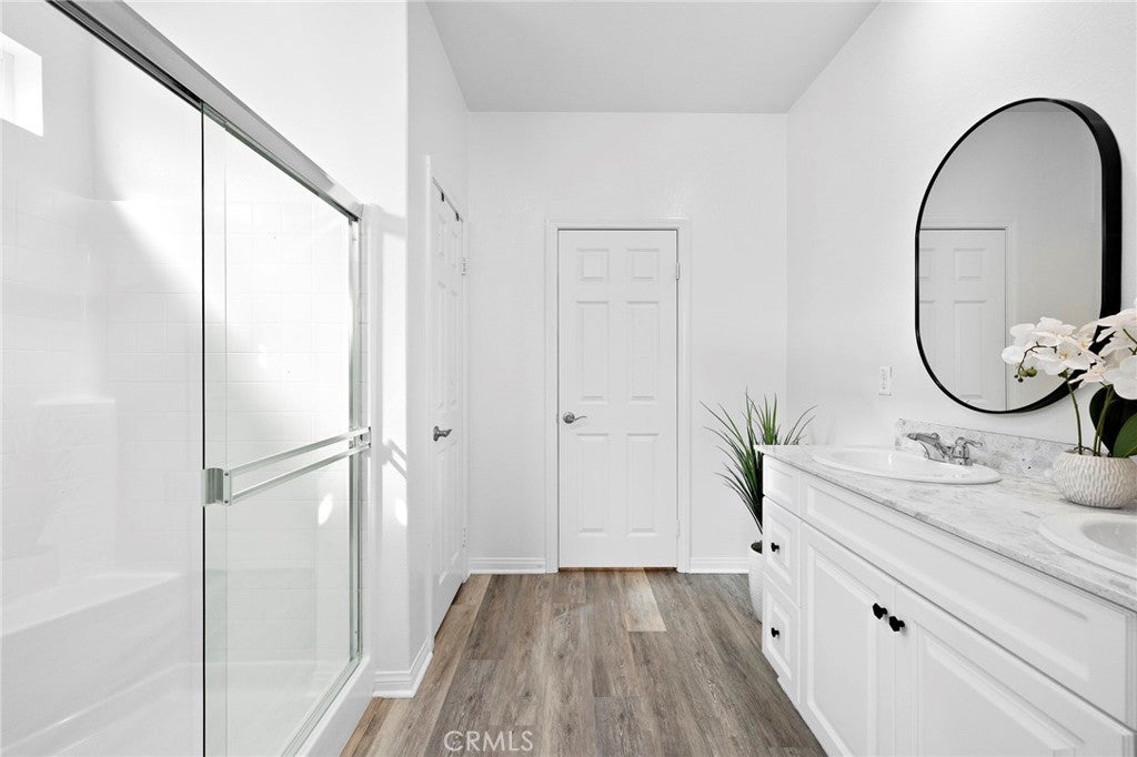 Welcome home to this beautifully upgraded single-story KB Cypress Home built in 2017, perfectly situated in the highly sought-after Hidden Hills community. Offering 3 spacious bedrooms, 2 bathrooms, and 1,430 square feet of thoughtfully designed living space, this home combines modern style with everyday comfort. As you enter you will be greeted with a warm and inviting entry that opens to a bright, airy great room. The open-concept layout is filled with natural light, creating the perfect space for both relaxing and entertaining. At the heart of the home, the stunning kitchen features a large center island ideal for cooking, casual dining, and gathering with family and friends. Upgraded with elegant gray quartz countertops, a classic white subway tile backsplash, stainless steel appliances, and modern fixtures, this kitchen is as beautiful as it is functional. The seamless flow continues with a sliding glass door that leads to a spacious, fully fenced backyard and an upgraded covered patio. Whether hosting weekend barbecues or creating your dream outdoor retreat, this private backyard offers endless possibilities. The generously sized primary suite provides a peaceful escape, complete with a walk-in closet, dual sinks, and a walk-in shower. Two additional bedrooms and a full bathroom with a tub/shower combo offer flexibility for family, guests, or a home office. Additional highlights include vinyl plank flooring throughout, modern finishes, an inside laundry room for convenience, and direct access to the two-car garage. The garage has been upgraded with Epoxy too! Enjoy all that Hidden Hills has to offer, with community amenities that include scenic walking trails, basketball and tennis courts, a soccer field, and a playground. Conveniently located near schools, shopping, dining, and with easy access to the 215 and 15 freeways, this home offers both comfort and convenience. Move in ready and thoughtfully designed, it is a wonderful opportunity for first time buyers or those looking to downsize. This single-story home is truly a must see!
