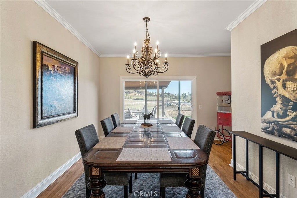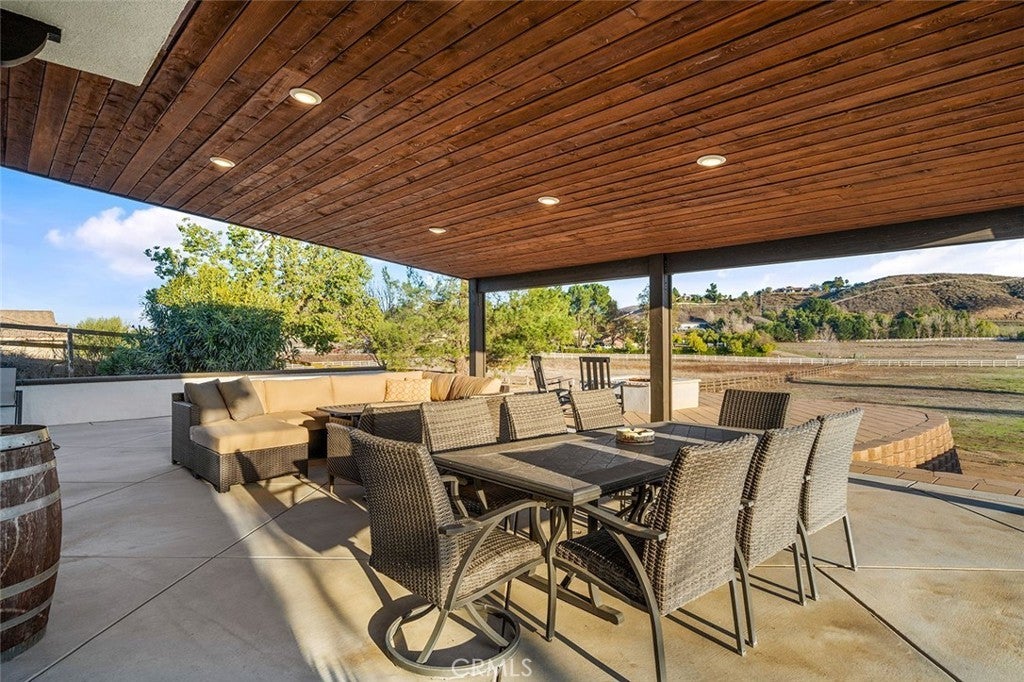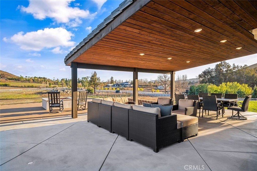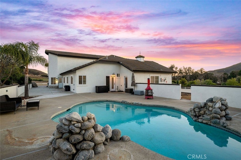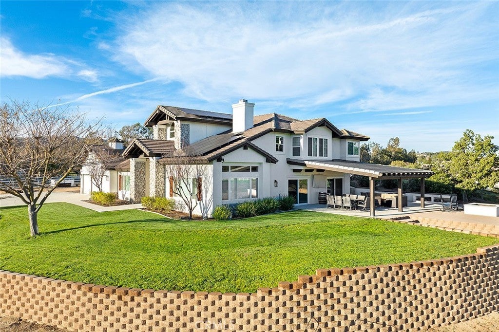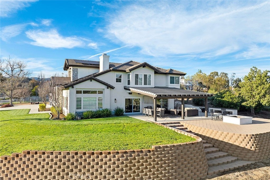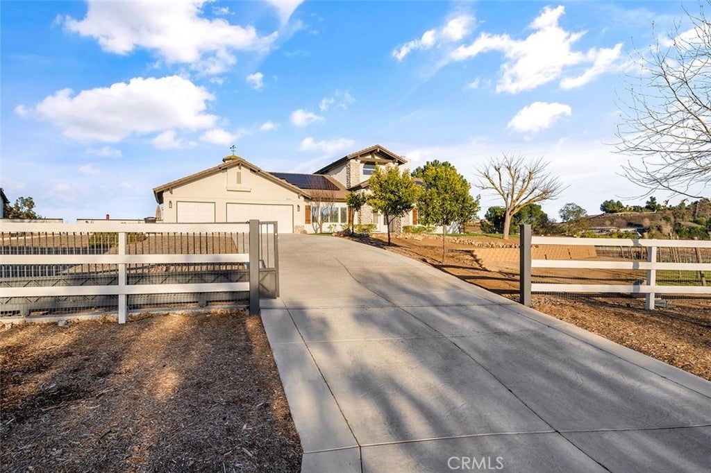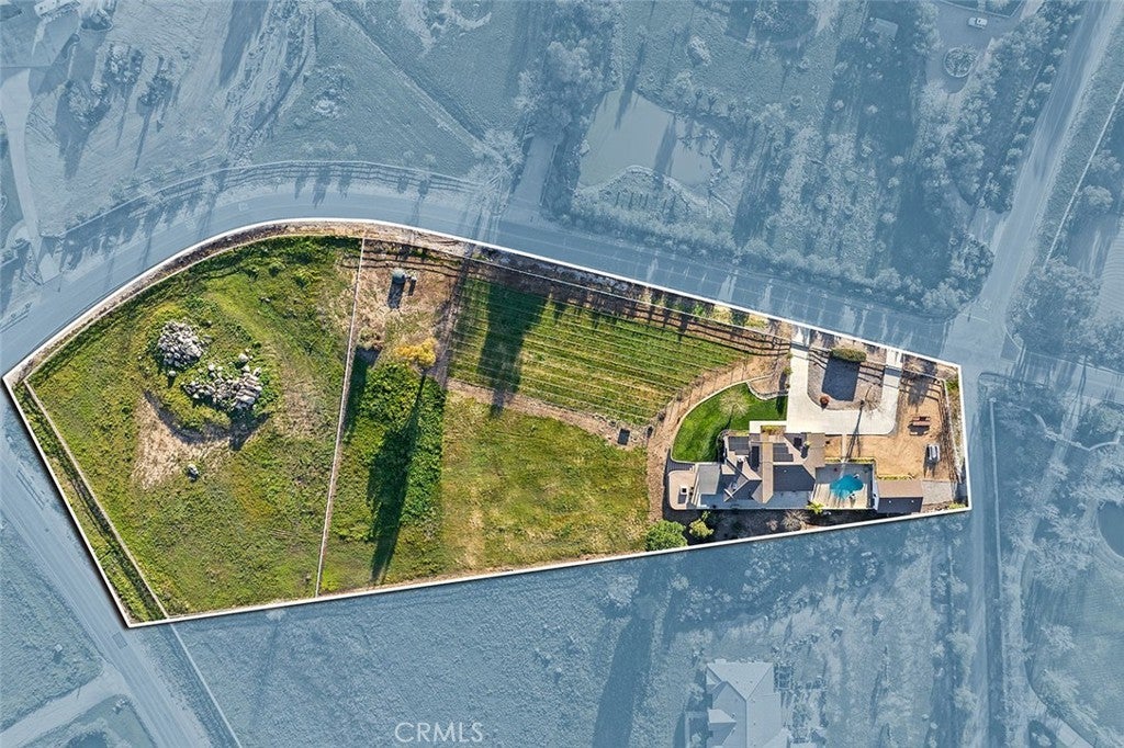 IN THE HEART OF LA CRESTA…THIS SPACIOUS 4-BEDROOM HOME SITS ON 5 FLAT & USABLE ACRES WITH VINEYARD, POOL AND SEPARATE RV GARAGE! This fantastic fully fenced property is conveniently located at the corner of Avenida La Cresta & Calle de Companero near the entrance of La Cresta, has four privacy gates, new concrete driveways, a robust private water well system, and offers direct access to the miles of community recreational trails. This uniquely usable parcel includes a charming vineyard of 400+ Cabernet Sauvignon vines and ample additional FLAT land for whatever else you desire…Perfect for future amenities, such as horse barn, arena, ADU, guesthouse, outbuildings. The modern farmhouse-style home is flooded with natural light and has 4 bedrooms (3 are downstairs), 3 bathrooms, large recreation room/office, formal living room with fireplace and vaulted ceilings, dedicated laundry room with direct access to the attached 3-car garage, formal dining room, chefs’ kitchen which opens to breakfast room and family room. From the dining and family rooms, walk out to a spacious covered outdoor living room with lighting, mounted TV, multiple seating areas, custom walls and built-in firepit, all overlooking your vineyard and pasture. Imagine catching a game in this picturesque setting! From the very private upstairs Primary Suite, enjoy beautiful views, an ensuite bathroom with jetted tub, separate shower and walk-in closet. Beyond the pool deck, find a detached multi-use RV GARAGE with its own gated entrance, creating an excellent immediate opportunity for workshop, gym, office… This entire property is designed for low-cost living, with its free water from the well, paid-for solar, new energy-efficient windows and LED lighting. Don’t miss this fantastic home with usable land and convenient location! *****Discover the La Cresta Lifestyle: 5-acre minimum parcels (10-acre minimum in SR West), just minutes to schools, restaurants, hospitals, shopping, 15 Fwy & Temecula Wine Country. Enjoy this peaceful ranch community w/no commercial businesses, robust social activities, miles of private community trails & 1000s of acres of Ecological Reserve…All less than 1.5 hours from LA, SD, OC, Palm Springs & Big Bear. Discover the country, yet convenient, lifestyle of La Cresta, Tenaja & the Communities of the Santa Rosa Plateau!