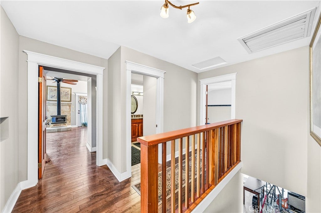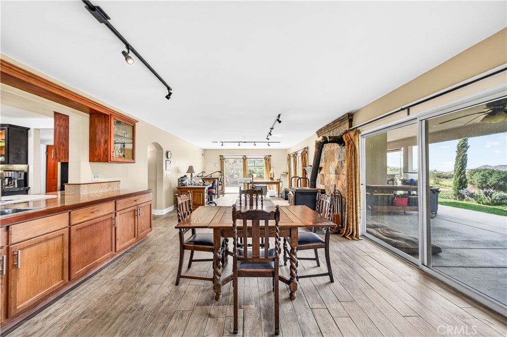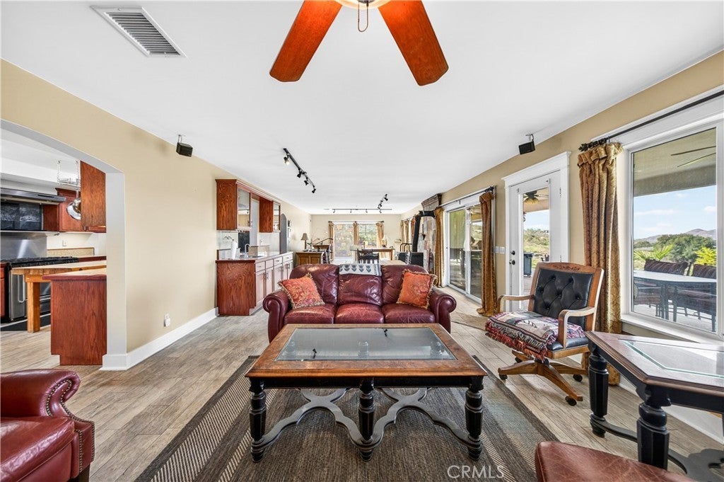 An extraordinary opportunity awaits at 33620 Oak Dr, Hemet, CA 92544 an exceptional 47.85-acre retreat privately situated at the end of a dedicated easement and embraced by a stunning 360-acre nature preserve and national forest. This remarkable property features three beautifully designed residences, creating the ultimate private sanctuary for multi-generational living, rental income, or a peaceful escape. The main residence spans approximately 3,400 square feet and offers four spacious bedrooms, three full bathrooms, two dining areas, and a thoughtfully designed kitchen that opens seamlessly into a breathtaking great room with a built-in bar and panoramic views through three expansive sliding glass doors perfect for unforgettable gatherings. Solid wood plank flooring enhances the inviting family room, complete with a cozy wood-burning stove, while the downstairs features tile flooring and the home boasts a total of two wood-burning stoves and one fireplace. Upstairs, four bedrooms one ideal for a home office provide comfort and flexibility. The second residence, an approximately 1,450-square-foot manufactured home, includes two bedrooms, two bathrooms, a generous living room, a family room with a wood-burning stove, a spacious kitchen with an island, and an indoor laundry area. The third residence, affectionately known as “The Cottage,” offers approximately 850 square feet of charming living space with one bedroom, one bathroom, a brand-new kitchen, and a wood-burning stove that enhances its cozy cabin ambiance. The land itself is a nature lover’s dream, featuring seasonal creeks and ponds, abundant wildlife, pasture areas, and multiple hiking trails, all at an elevation of approximately 3,100 feet with sweeping views of rolling hills and mountain ranges stretching from Big Bear to Idyllwild. With ample space for livestock, recreation, and endless possibilities, plus the benefit of private well systems, this one-of-a-kind property offers unmatched privacy, versatility, and breathtaking natural beauty.