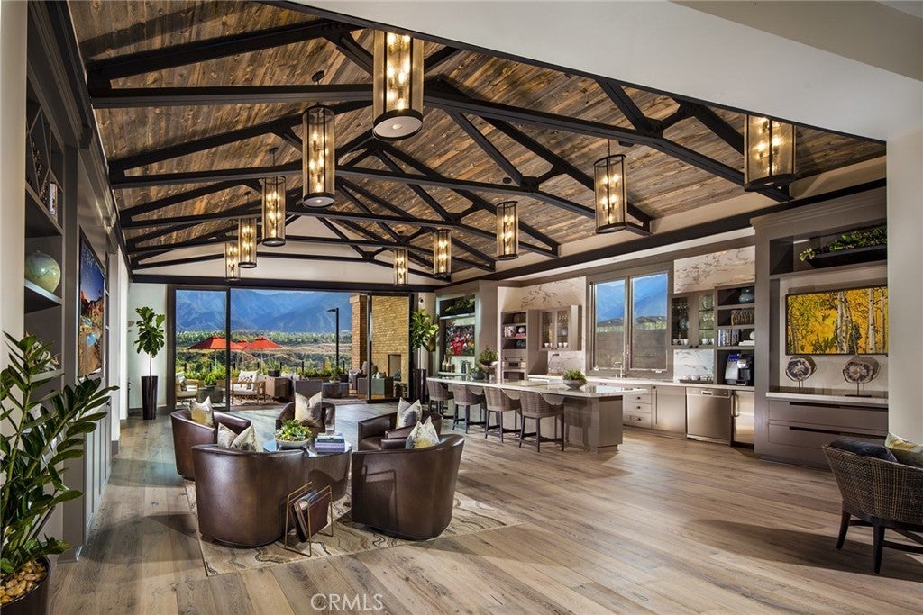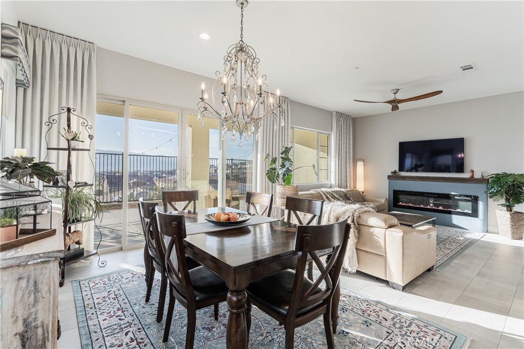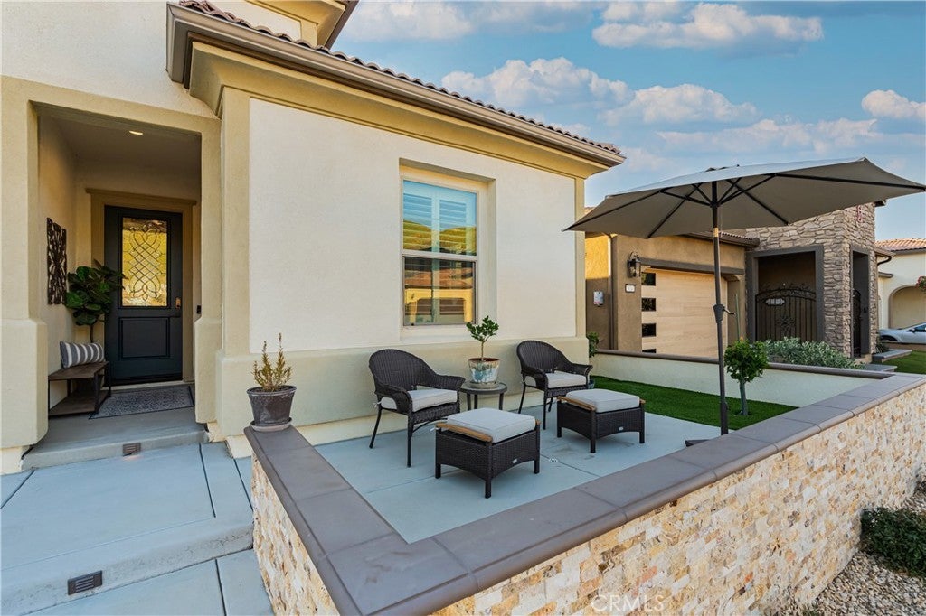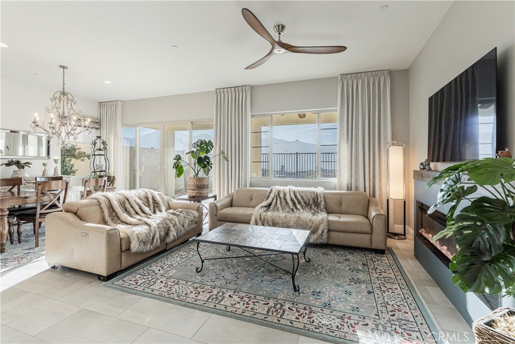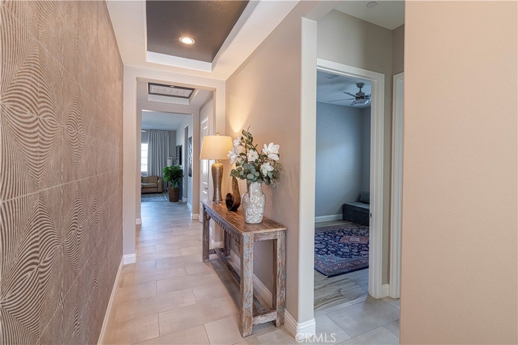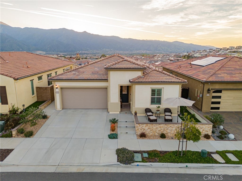 RESORT STYLE 55+ GATED COMMUNITY - SINGLE STORY - PREMIUM LOT - PANORAMIC VIEWS - PAID SOLAR - HIGHLY UPGRADED!! Welcome to the pinnacle of refined 55+ living within the prestigious Terramor community. It can come FULLY FURNISHED so you can just move right in!! This exceptional single story residence offers over 1900 ft.² of thoughtfully designed living space, featuring three bedrooms and two baths, ideally positioned on a premium lot with sweeping panoramic mountain vistas and sparkling city lights below. From the moment you arrive, the elevated front terrace and new glass entry door set a tone of understated sophistication. Inside, elegant porcelain tile flows seamlessly throughout, complemented by custom plantation shutters and a beautifully finished ceiling detail in the entryway. The heart of the home is a true Chef’s Kitchen, featuring a large center island with counter seating, stainless steel appliances, custom stainless hood, a 5 burner gas range, double ovens, reverse osmosis system, additional cabinetry w/ sleek hardware and a large walk-in pantry. Retreat to the primary suite’s master bath, featuring the luxury tub + shower upgrade for a spa-like experience with a large walk-in closet. The living space expands through extra-large sliding doors into a stunning California Room, capturing more of those breathtaking VIEWS and also equipped w/ three massive electric sunscreens—perfect for year-round indoor-outdoor entertaining. Smart and functional upgrades include electric interior shades, 9 fully OWNED solar panels, soft water system, tankless water heater, a finished garage with epoxy flooring, EV charging station and extra storage racks. Storage is plentiful with custom shelving in the guest and office closets plus a fully upgraded laundry room with sink and cabinets. Beyond your front door, enjoy world-class amenities including two clubhouses; one for 55+ and the other for families, indoor/outdoor pools, pickleball, tennis, a fitness center and all of this is surrounded by miles of scenic trails. Quick access to all major shopping, restaurants, cinemas, bowling, The Shops @ Dos Lagos as well as the 15 & 91 freeways. Come experience where luxury and convenience finally meet!