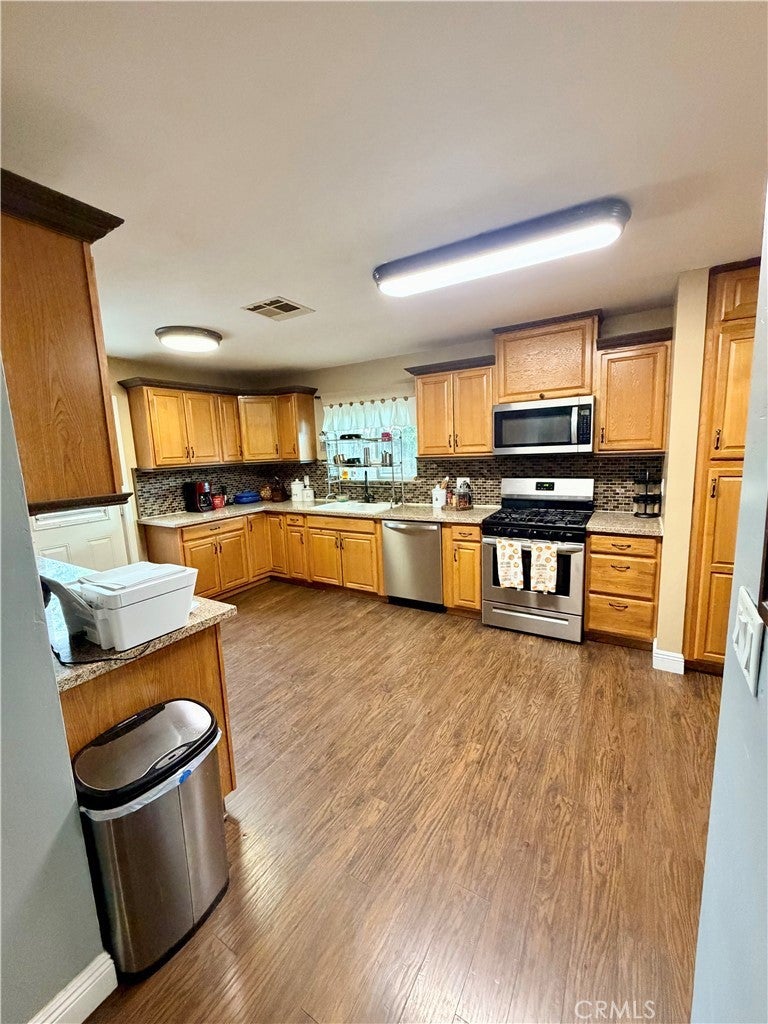 Beautifully remodeled 4-bedroom, 3-bathroom home offering 2,253 sq ft of living space, including permitted bedroom additions and a spacious primary suite. The home features three full bathrooms, two with double sinks. The primary suite includes a tub, separate shower, and a vanity area next to the walk-in closet. The spacious kitchen features granite countertops, stainless steel stove and dishwasher included, and a massive pantry. Step outside to a large backyard patio, perfect for entertaining, with mature fruit trees including apple and orange trees. The property also offers low-maintenance front and back yards and a 10x8 wooden storage shed.