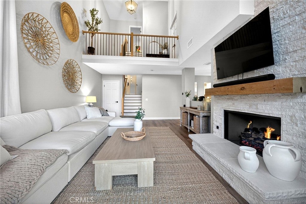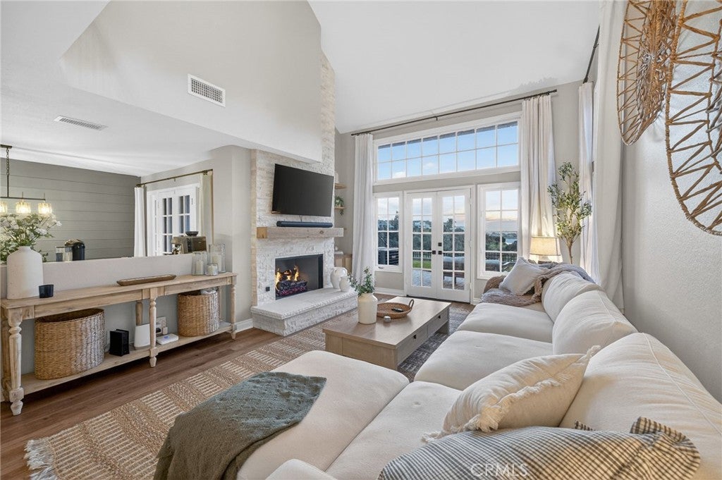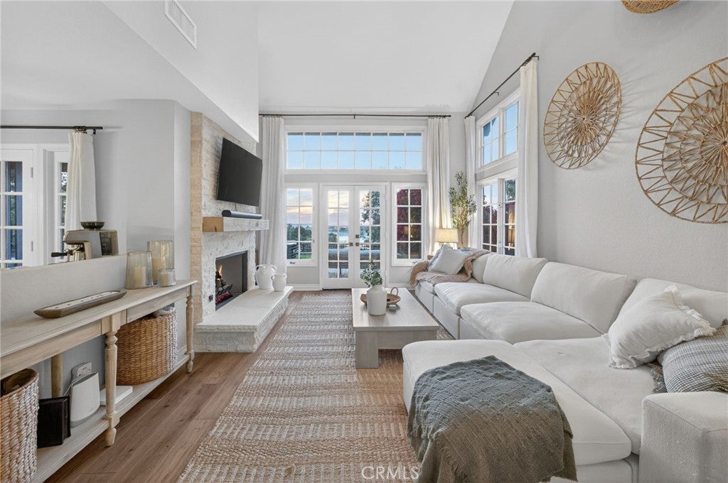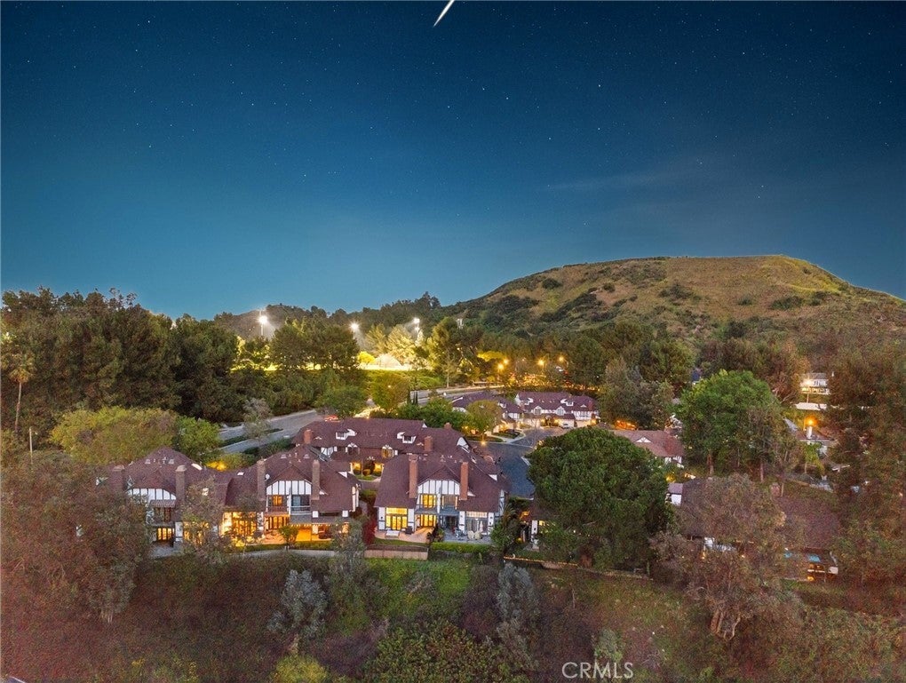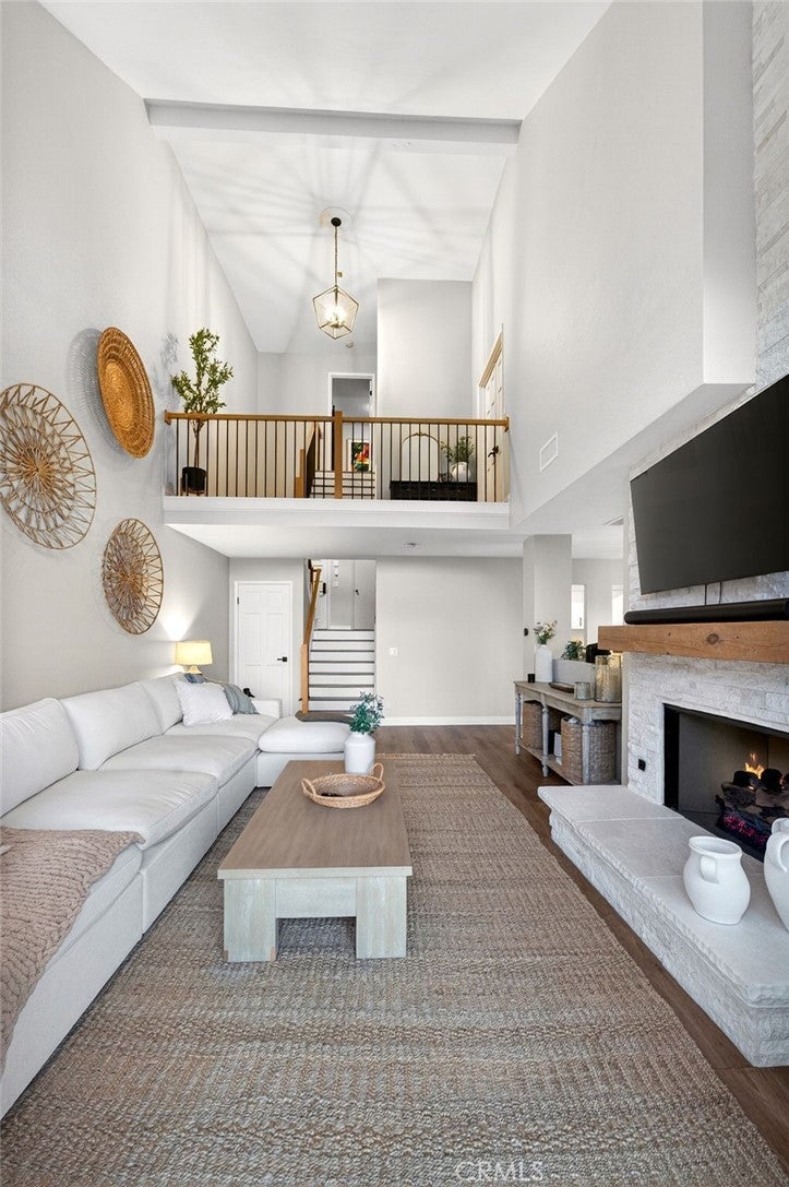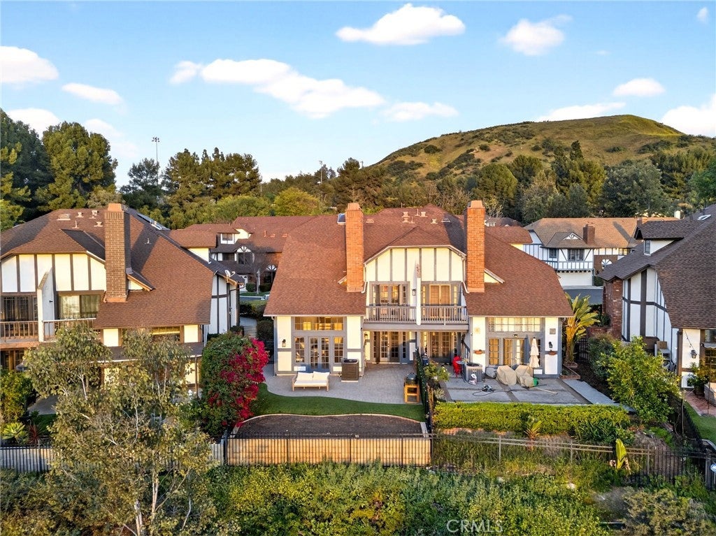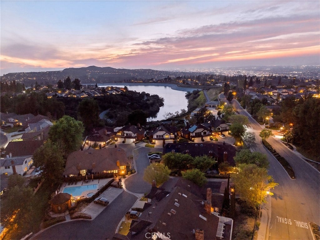 Spectacular remodeled 2-Bedroom, 2.5-Bathroom, lake view Townhome in the Gated Rimcrest Villas Community This upgraded Tudor-style end-unit townhome lives like a single-family home with only one shared wall and beautifully landscaped, low-maintenance side and backyards featuring panoramic views. Upon entry, you’re welcomed by a newly installed accent wall with hooks and a fully remodeled bathroom. The main level features a spacious living room with soaring ceilings, abundant natural light, new luxury vinyl plank flooring, a custom fireplace, and built-in shelving. French doors open to the backyard, creating seamless indoor-outdoor living while showcasing scenic views. The adjacent dining area is highlighted by a stylish accent wall, pendant lighting, and additional French doors. The fully remodeled kitchen features recessed lighting, custom cabinetry, quartz countertops, a subway tile backsplash, farmhouse sink with gooseneck faucet, 5-burner gas cooktop with hood, double ovens (microwave also functions as a convection oven), dishwasher, French-door refrigerator (included), and a large walk-in pantry. Upstairs, the primary suite features a custom fireplace, walk-in closet, and access to a resealed balcony with new railing and beautiful views. The spa-inspired bathroom includes a soaking tub, separate shower, dual sinks, rich cabinetry, and granite countertops. The spacious second bedroom occupies the top level and includes an ensuite remodeled bathroom, built-in cabinetry with a large work surface, an upgraded closet with generous shelving and barn door, and a private resealed balcony. Additional features include a 2-car garage with new lighting, washer and dryer (included), newer interior paint, a new AC unit (Nov 2024), new window locks, freshly painted doors with updated hardware, and updated electrical wiring, outlets, and switches. Residents of Rimcrest Villas enjoy exceptional HOA amenities including exterior building insurance (including fire), exterior maintenance and roof repairs/replacement, landscaping services, road upkeep and a community pool and spa. Ideally located near hiking and biking trails, restaurants, shopping, and entertainment. Situated within an award-winning school district and walking distance to Canyon Rim Elementary. Convenient access to the 91 and 241 freeways. A rare opportunity to own a turnkey Tudor-style home in prime Anaheim Hills.