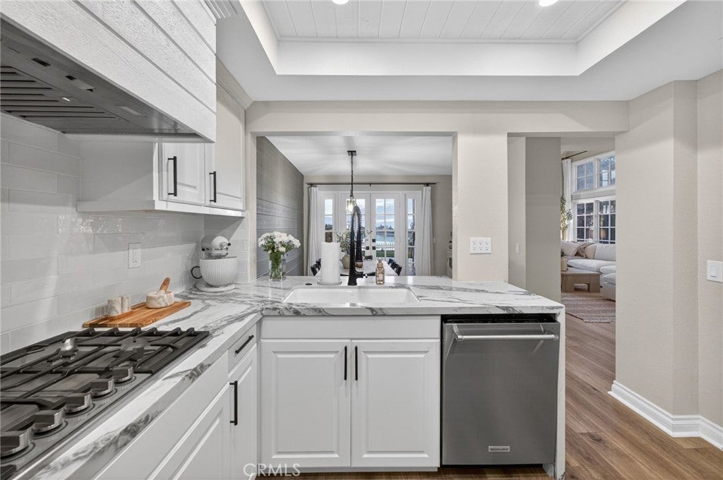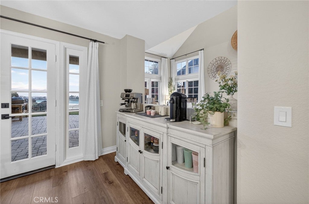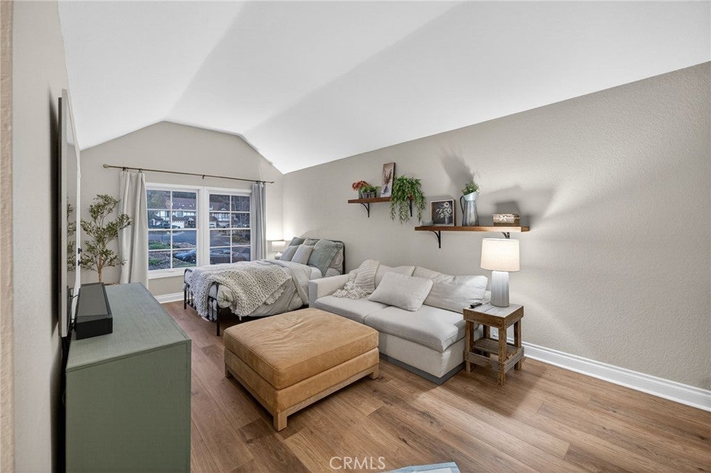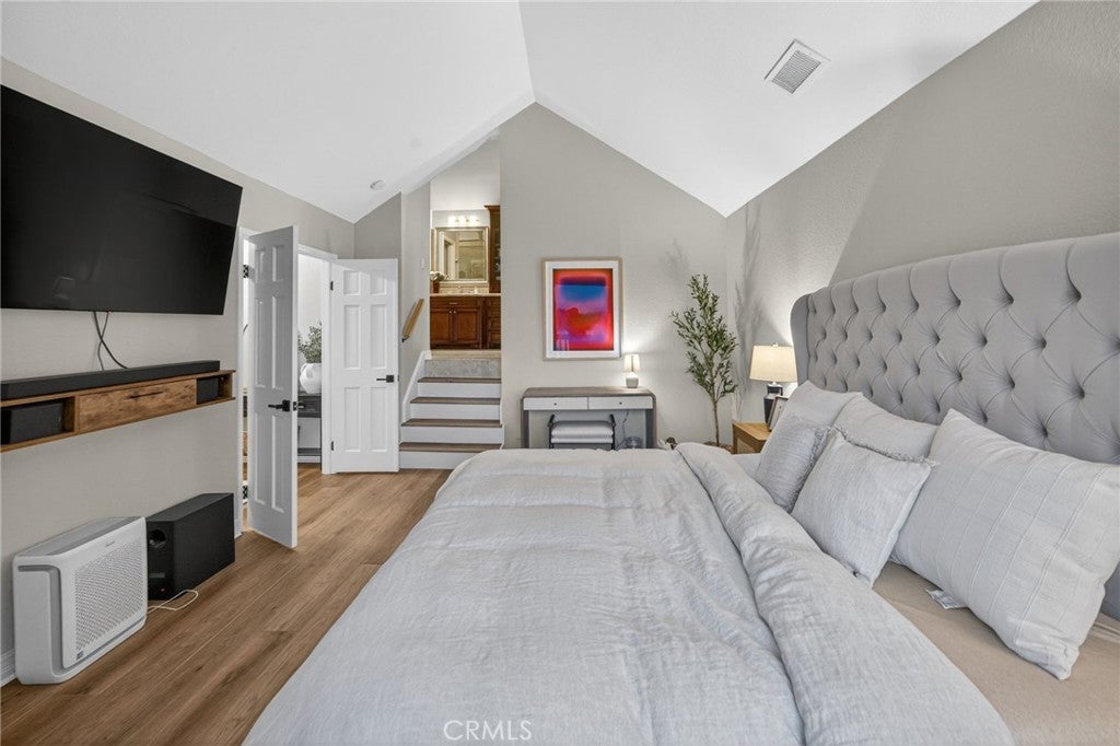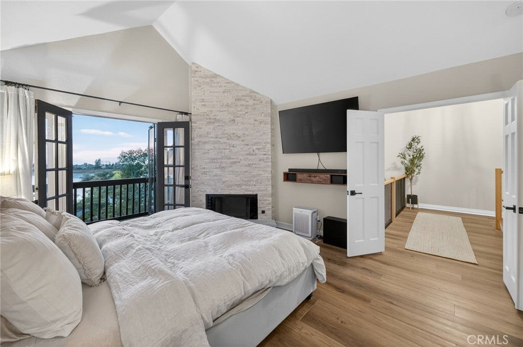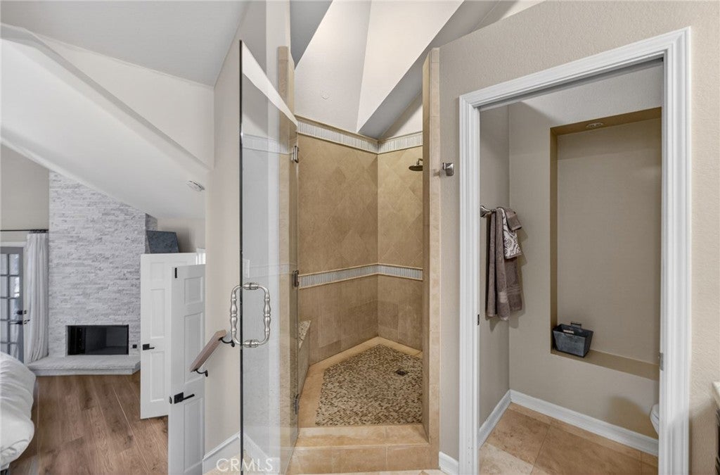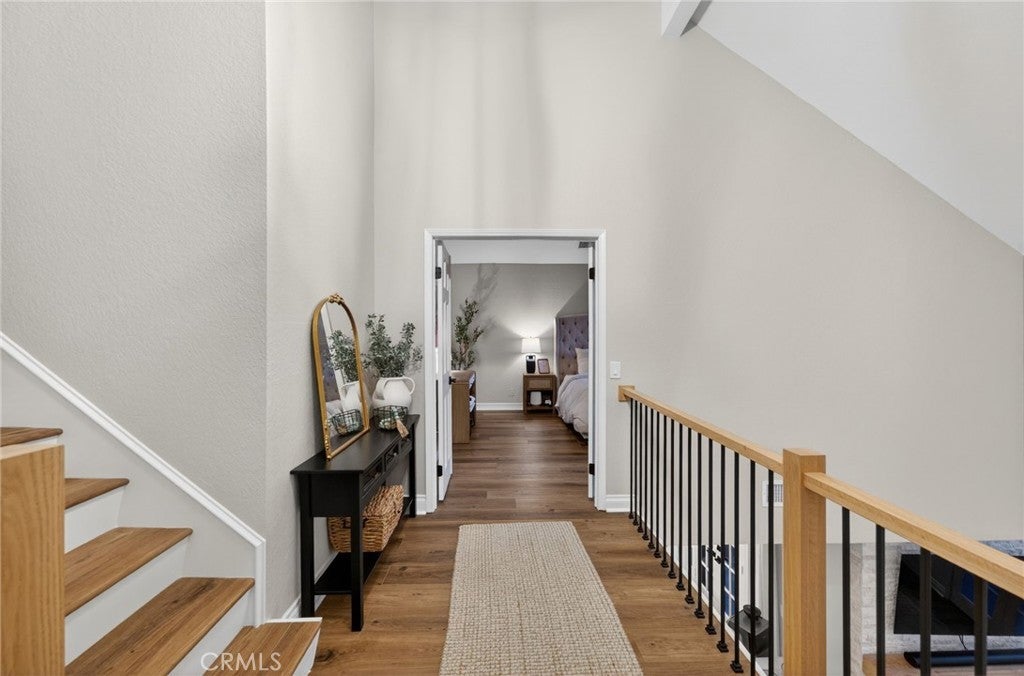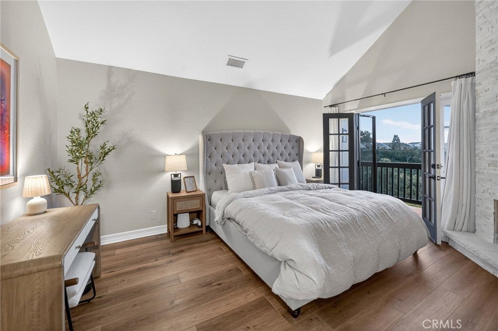 Spectacular remodeled 2-Bedroom, 2.5-Bathroom, lake view Townhome in the Gated Rimcrest Villas Community This upgraded Tudor-style end-unit townhome lives like a single-family home with only one shared wall and beautifully landscaped, low-maintenance side and backyards featuring panoramic views. Upon entry, you’re welcomed by a newly installed accent wall with hooks and a fully remodeled bathroom. The main level features a spacious living room with soaring ceilings, abundant natural light, new luxury vinyl plank flooring, a custom fireplace, and built-in shelving. French doors open to the backyard, creating seamless indoor-outdoor living while showcasing scenic views. The adjacent dining area is highlighted by a stylish accent wall, pendant lighting, and additional French doors. The fully remodeled kitchen features recessed lighting, custom cabinetry, quartz countertops, a subway tile backsplash, farmhouse sink with gooseneck faucet, 5-burner gas cooktop with hood, double ovens (microwave also functions as a convection oven), dishwasher, French-door refrigerator (included), and a large walk-in pantry. Upstairs, the primary suite features a custom fireplace, walk-in closet, and access to a resealed balcony with new railing and beautiful views. The spa-inspired bathroom includes a soaking tub, separate shower, dual sinks, rich cabinetry, and granite countertops. The spacious second bedroom occupies the top level and includes an ensuite remodeled bathroom, built-in cabinetry with a large work surface, an upgraded closet with generous shelving and barn door, and a private resealed balcony. Additional features include a 2-car garage with new lighting, washer and dryer (included), newer interior paint, a new AC unit (Nov 2024), new window locks, freshly painted doors with updated hardware, and updated electrical wiring, outlets, and switches. Residents of Rimcrest Villas enjoy exceptional HOA amenities including exterior building insurance (including fire), exterior maintenance and roof repairs/replacement, landscaping services, road upkeep and a community pool and spa. Ideally located near hiking and biking trails, restaurants, shopping, and entertainment. Situated within an award-winning school district and walking distance to Canyon Rim Elementary. Convenient access to the 91 and 241 freeways. A rare opportunity to own a turnkey Tudor-style home in prime Anaheim Hills.