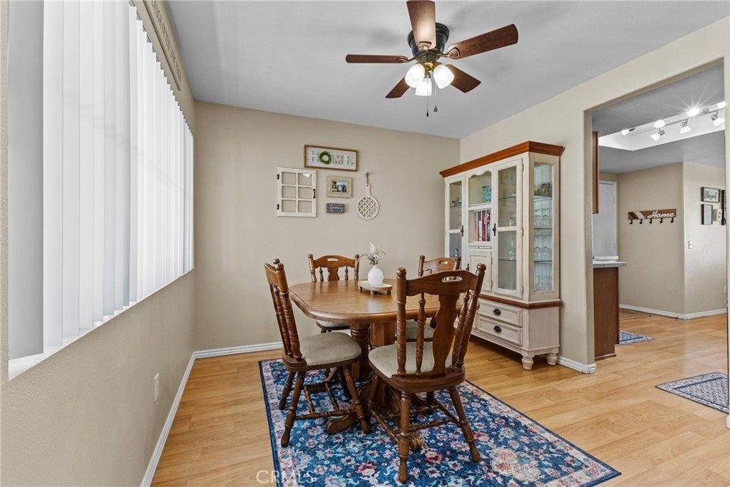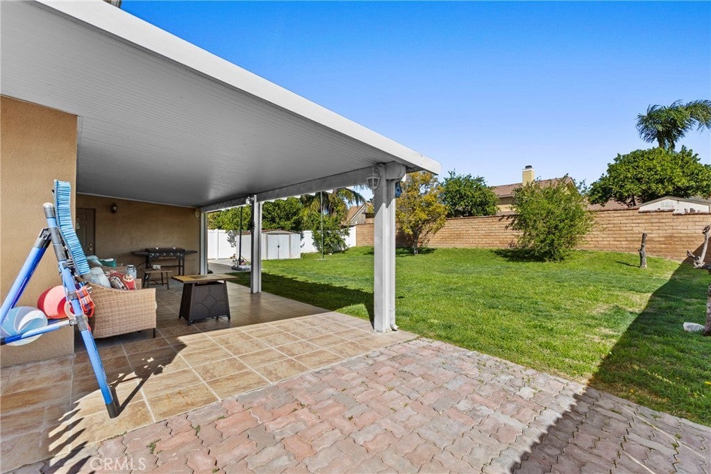 Situated on a desirable corner lot with extra parking, this spacious 4 bedroom, 2.5 bathroom home offers 1,790 square feet of thoughtfully designed living space. From the moment you step inside, you will appreciate the beautiful wood laminate flooring and a bright open layout that creates a warm and inviting atmosphere. The light-filled kitchen is designed for both everyday living and entertaining, featuring slab granite countertops, stainless steel appliances, and a breakfast counter. A cozy breakfast nook overlooks the expansive backyard and flows seamlessly into the living room, where a stone fireplace creates the perfect gathering space for relaxing evenings at home. For more formal occasions, the home also offers a separate formal dining room, ideal for hosting family dinners and holiday celebrations. The primary suite provides a peaceful retreat with a walk-in closet and a spacious ensuite bathroom complete with a separate soaking tub and shower. Step outside to a large, tiled patio with an Alumawood cover, providing shade and a perfect setting for outdoor dining or entertaining year-round. The generous backyard offers plenty of space to design your dream outdoor oasis, including room for a pool. Additional highlights include an oversized garage and the benefits of a corner lot with added parking. Located in a well-established neighborhood, this home offers easy access to local parks, shopping, dining, and schools, while still enjoying the relaxed lifestyle that makes the area so appealing. This home combines comfortable living, outdoor space, and a convenient location, making it a wonderful opportunity for the perfect place to call home. Low taxes and no HOA!