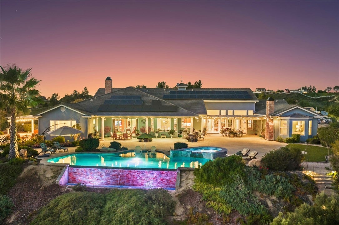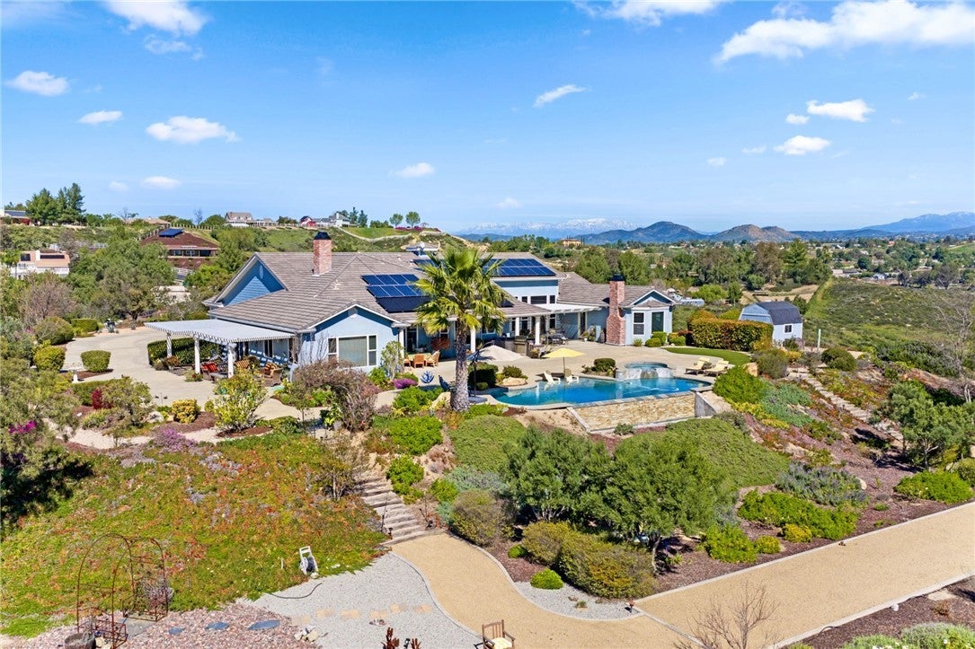 A One of One Wine Country Estate with views unlike any other…. Perched in the heart of wine country, this one of a kind single story estate offers some of the most breathtaking, unobstructed views the region has to offer, including sweeping views of Palomar Mountain that must be seen to be believed. Nearly every window frames a picturesque backdrop, creating a seamless connection between indoor living and the natural beauty beyond. Thoughtfully designed with an ideal floor plan, the home positions the primary suite to capture stunning backyard views, providing a private retreat that feels both serene and luxurious. On the opposite wing, a fully functional guest suite—or potential attached ADU—offers exceptional flexibility with its own living room, bedroom, bathroom, and private entrance. This space can remain connected to the main home or be easily separated for multigenerational living, guests, or income potential. The interior is equally impressive, featuring a show-stopping dining room, two additional bedrooms with en suite bathrooms, and a spacious walk-in pantry. The expansive entertainer’s kitchen opens effortlessly to both the family room and a casual dining area, making it ideal for hosting and everyday living alike. Car enthusiasts and hobbyists will appreciate the oversized 4-car garage, while recent upgrades such as a brand-new water heater and solar—including pool solar adding efficiency and value. Step outside to your private resort-style oasis, complete with an infinity-edge pool and spa perfectly positioned to soak in the panoramic views. Beyond the main residence, the property truly shines with its land and limitless potential. A second driveway leads to a separate graded pad with incredible views—ready for a future ADU, workshop, or RV garage. This same driveway welcomes you to a tranquil Zen garden featuring a putting green, chipping area, walking trails, multiple seating areas, and mature landscaping—all designed to maximize the property’s unmatched scenery and peaceful ambiance. Fully gated and fenced, this estate offers privacy, versatility, and endless opportunity in one of the most desirable wine country locations. With so much to offer and priced to sell, this is a rare opportunity you won’t want to miss. Schedule your private tour today and experience these extraordinary views for yourself.