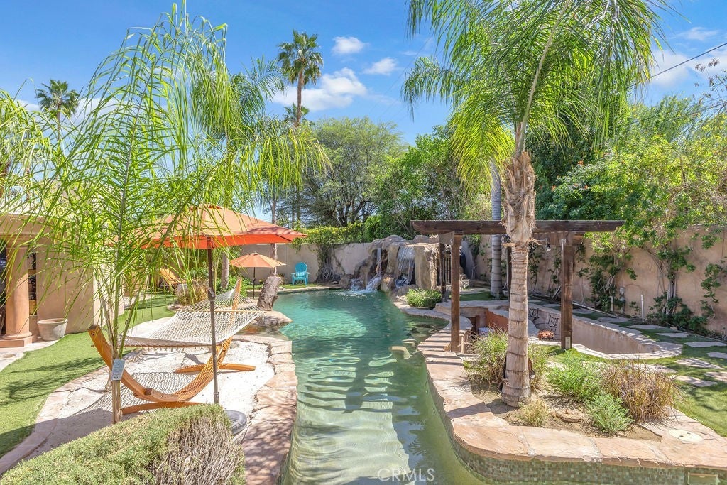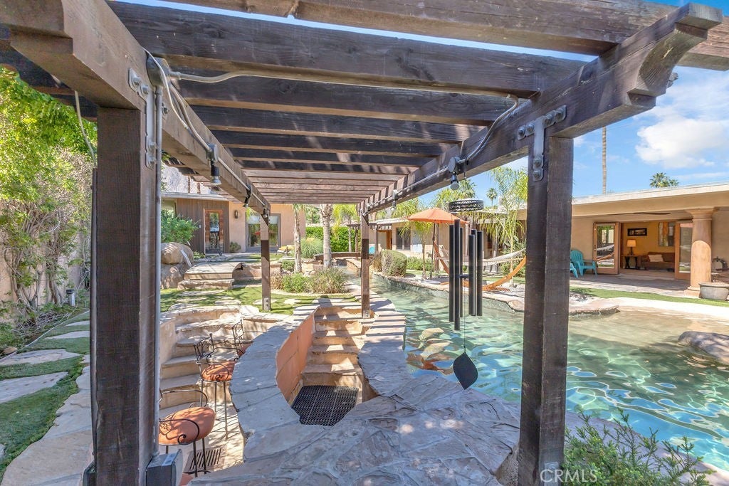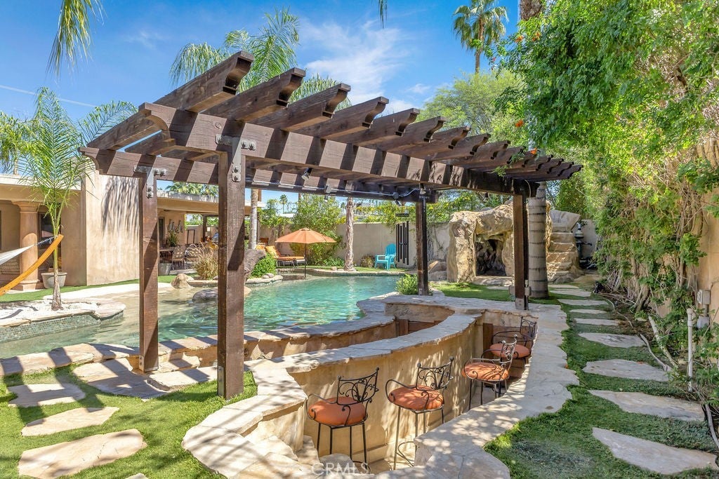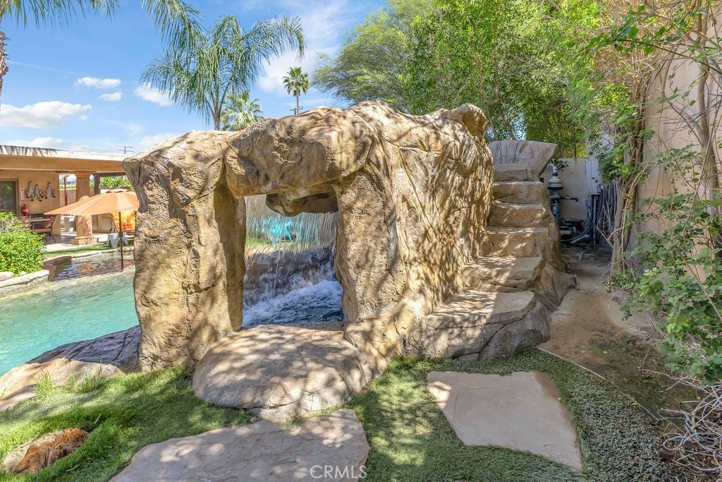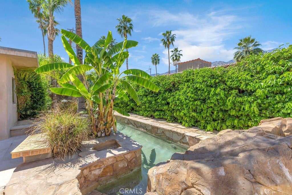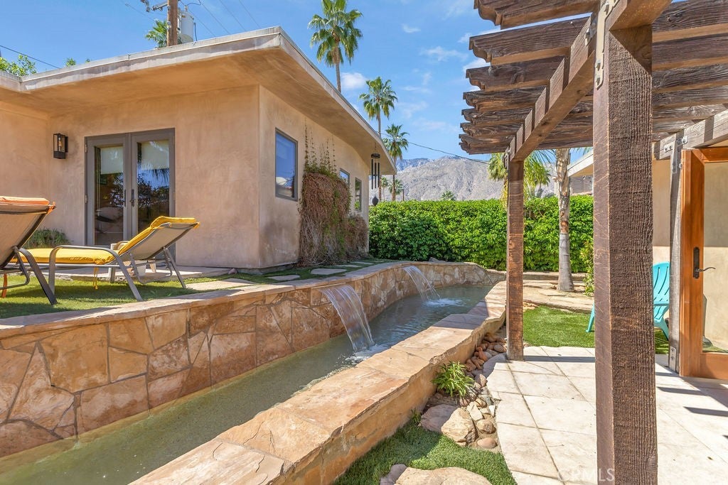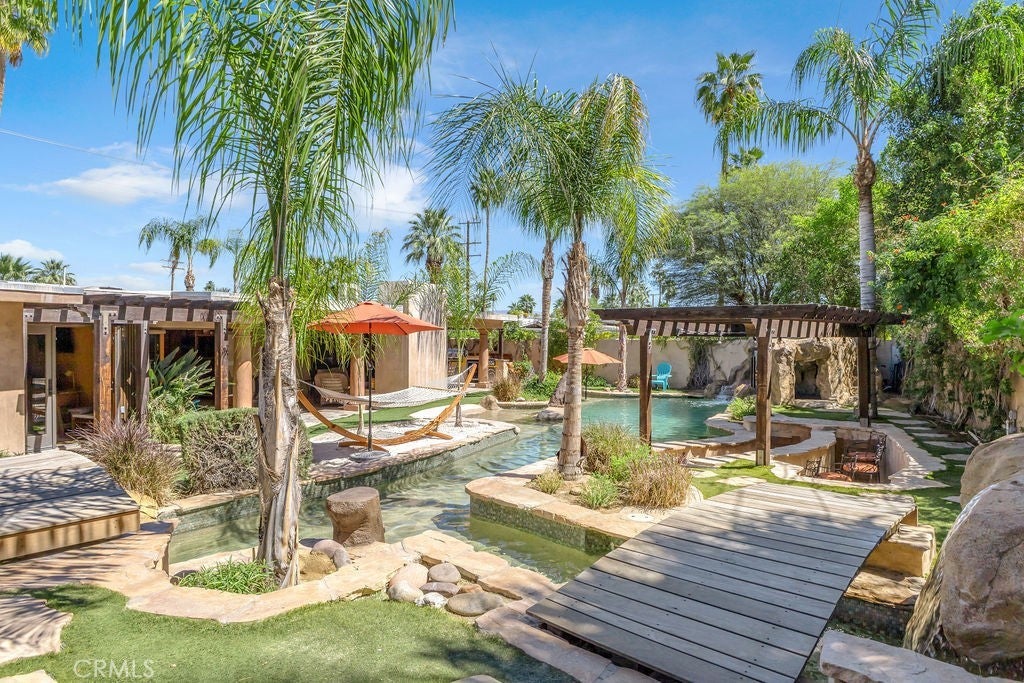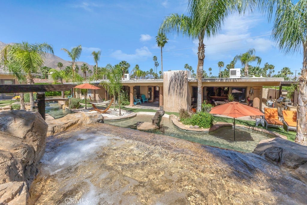 Turnkey, fully furnished mid-century modern oasis in prime Tahquitz River Estates—ready for immediate enjoyment or continued short-term rental success. This private resort-style retreat sits on a fully enclosed ¼-acre lot with custom walls maximizing every inch for privacy and entertainment. Approximately 2,226 sq ft of versatile livable space includes the original home, a 354 sq ft casita addition for guest privacy, and an expansive game room—perfect for families, groups, or luxury living. Inviting interiors feature open-concept flow, accent wood walls, spa-inspired bathrooms with freestanding tubs and rain showers, cozy bedrooms with ceiling fans and desert views, and a dedicated casita suite. Seamless indoor-outdoor connection leads to the backyard paradise: expertly custom-crafted by the owner of LA Pool & Patio, boasting a thrilling waterslide, dramatic grotto cave with hidden spa and cascading waterfall entrance, flowing lazy river, swim-up bar, overhead bridges, sauna, heated waterfall features, putting greens, lush landscaping, and a covered patio with outdoor kitchen, fireplace, and ample seating. Already equipped with a valid short-term rental permit and proven history as a high-demand vacation getaway, this property offers strong income potential—in the right hands, exceeding $200,000 annually possible through optimized management and bookings. Fee simple land (no lease, no HOA). ~15-minute walk to downtown Palm Springs dining, shops, and entertainment. A rare, turnkey gem blending mid-century charm with resort-level fun—ideal for personal use or investment!