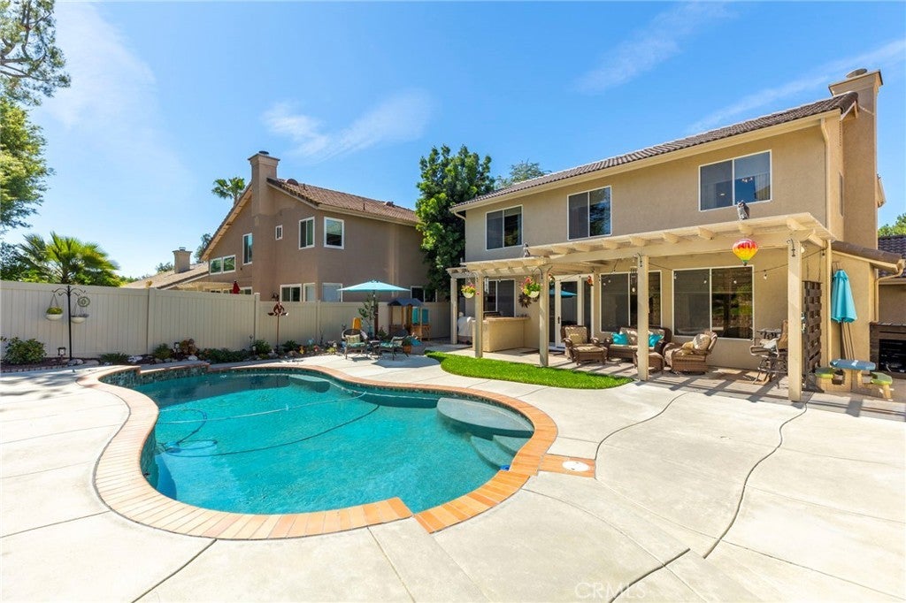 First time on the market, this South Temecula pool home shows true pride of ownership and is located within the Great Oak High School boundaries. Offering 3 bedrooms plus bonus room/optional 4th bedroom and 2.5 baths, features include a remodeled kitchen with upgraded cabinetry, countertops, and GE appliances. French door with sidelights from the dining area to the pool and covered patio. Family room with fireplace, living room, tile flooring throughout the main floor, 5-inch baseboards, replaced raised panel interior doors, custom window treatments, and interior laundry room. Wood-style flooring extends up the stairs and throughout the upper level. Bathrooms have been remodeled with upgraded cabinetry, countertops, fixtures, lighting, flooring, and glass shower doors. This home is turn key and move-in ready. The backyard is a highlight with a pool featuring resurfaced PebbleTec and a newer energy-saving variable speed pump, along with a built-in BBQ and patio cover. Additional improvements include replaced tile roof, water softener, replaced HVAC, whole house fan, attic fan, and newer water heater. Manicured landscaping, no Mello-Roos tax, and low HOA fees. Conveniently located with easy freeway access and close to Pechanga Resort, Old Town Temecula, shopping, award-winning schools, golf, numerous parks, and Temecula Wine Country.