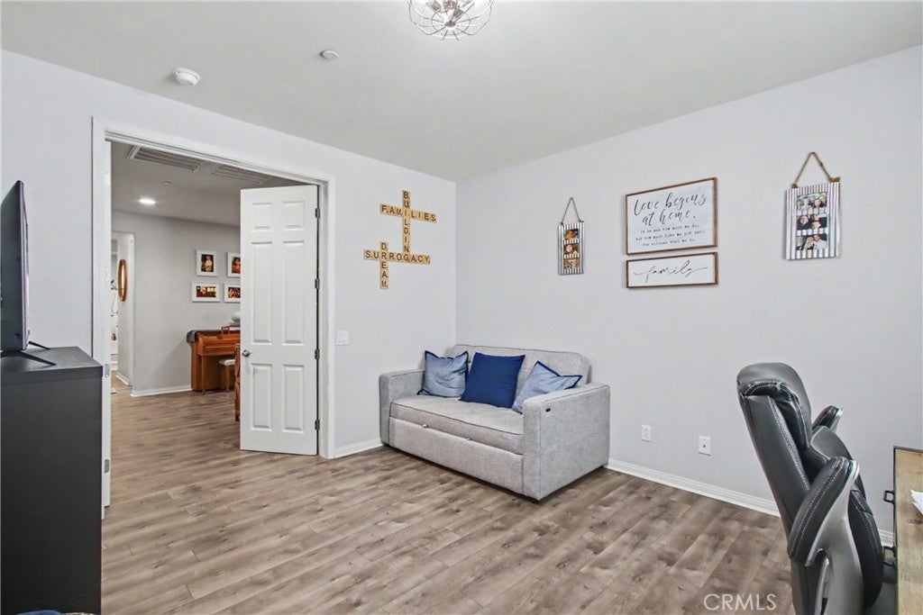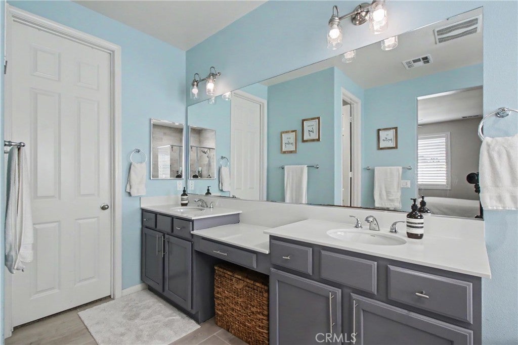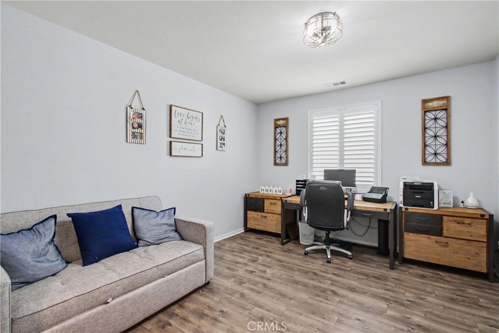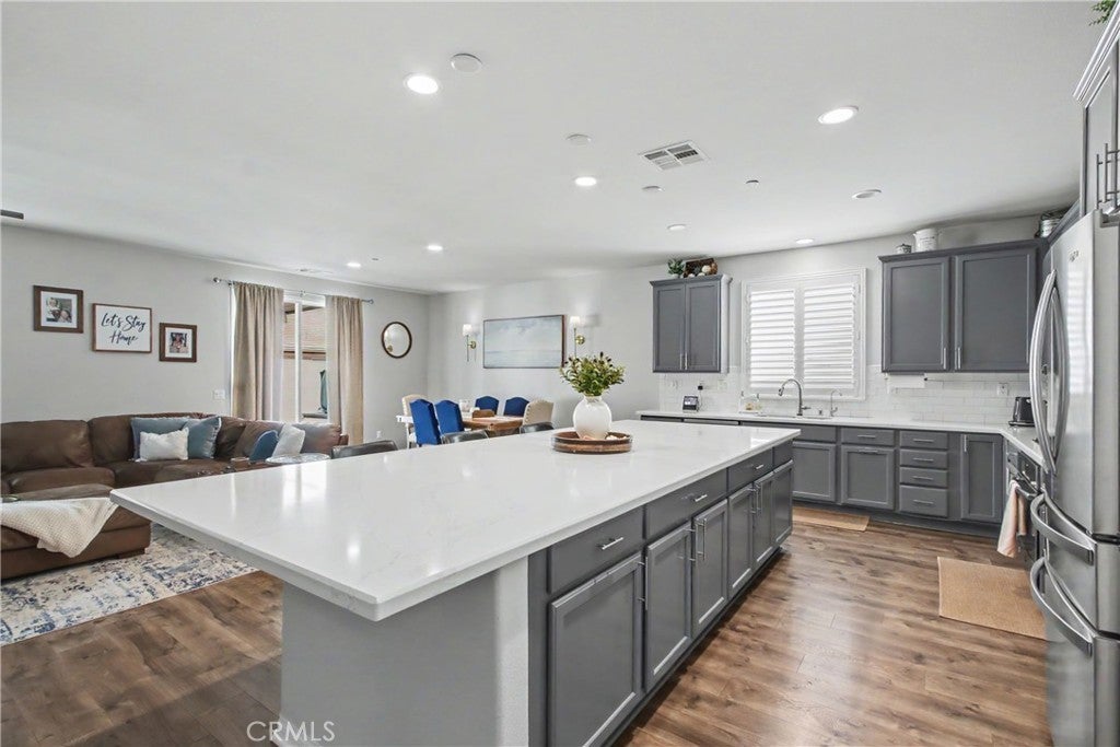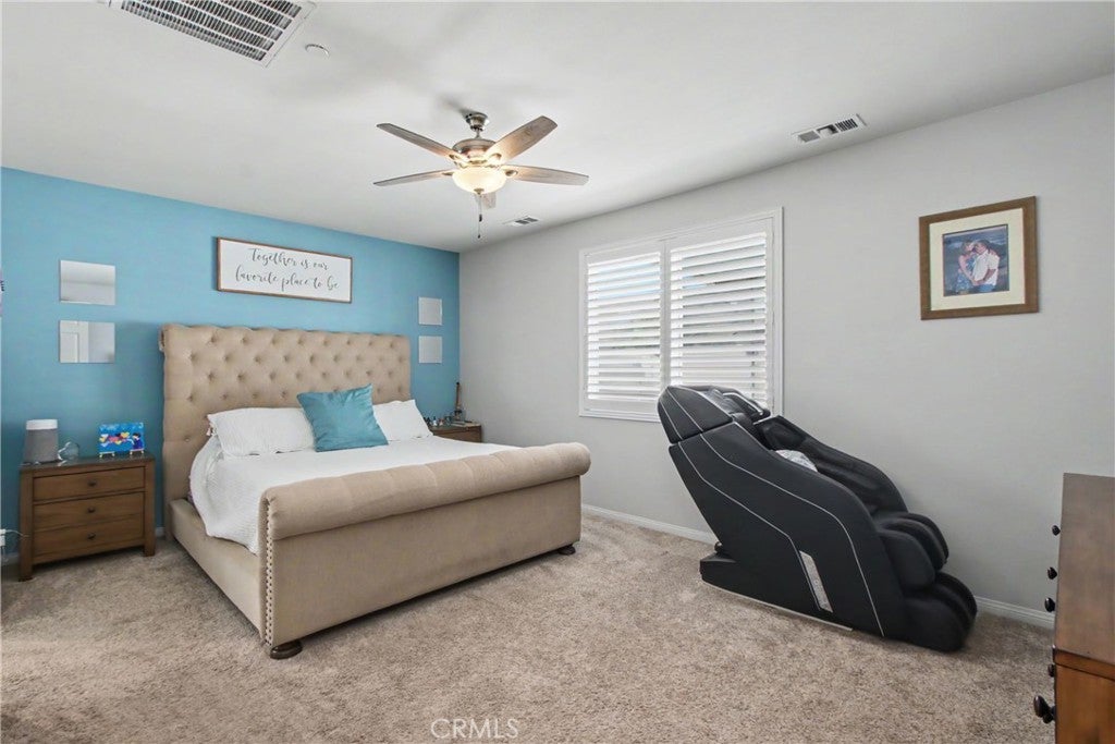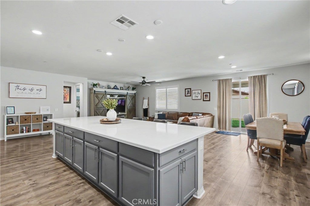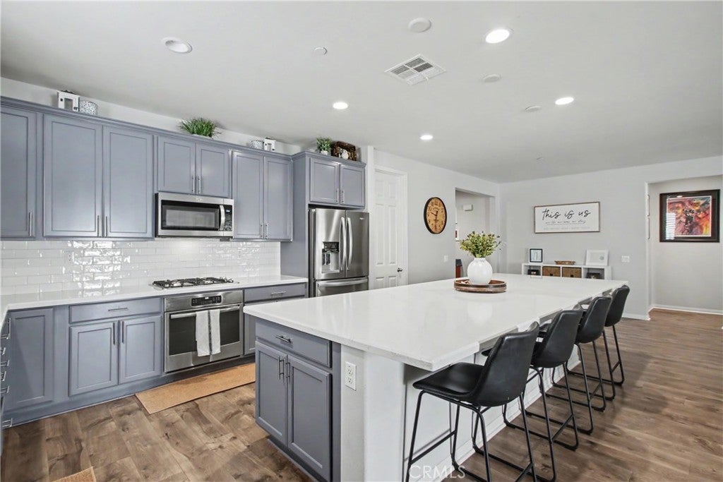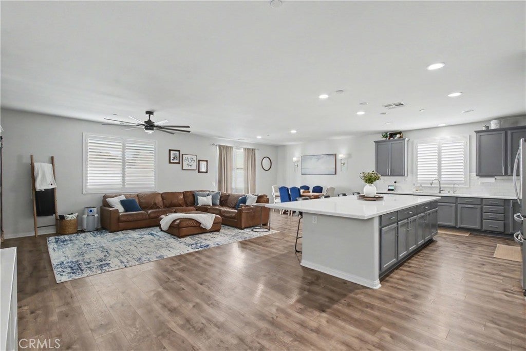 Welcome to this beautifully upgraded 5-bedroom, 3.5-bathroom home located in the highly desirable community of Spencer's Crossing in Murrieta. Step inside to find elegant plantation shutters throughout and durable luxury vinyl plank (LVP) flooring in the main living areas, with plush carpeting in the bedrooms for added comfort. The heart of the home is the expansive, chef-inspired kitchen, complete with Corian countertops, an impressive 15-foot center island, custom cabinetry, soft-closing drawers, built-in trash bin, and a large walk-in pantry. Additional highlights include a single oven and a convenient double sink with touch feature—ideal for both everyday living and entertaining. The backyard is designed for relaxation and gatherings, featuring a covered patio with ceiling fans and shades, a gas line for outdoor cooking, low-maintenance vinyl fencing, and newly installed sod. The front yard offers attractive and water-efficient artificial turf. Additional upgrades include: 2-car garage with epoxy flooring, Tankless water heater, Tesla charging station, Water softener system, Paid-off solar system for energy efficiency and savings This home truly combines comfort, style, and sustainability—don’t miss the opportunity to make it yours!