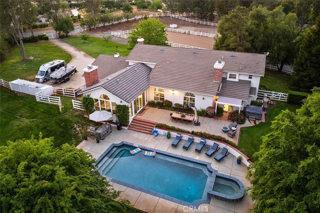 HORSE LOVERS’ LA CRESTA DREAM ESTATE! This spectacular, recently renovated home on 5 acres comes with all the bells & whistles! Tons of usable land, 150x75’ arena, 40’ round pen, direct trail access, barn with massive turnouts, pool & spa, giant mature trees, parklike grounds with grassy lawns and a very private location within the renown ranch community of La Cresta on the Santa Rosa Plateau. This estate even comes with a generous insurance discount for its proximity to the local fire station! The current owners spared no expense on the home renovations, including new flooring & paint throughout, remodeled kitchen, leveling of the previous sunken living room, designer lighting, custom front door and more! Most of the living space is single level with no steps, spacious rooms, guest wing (great for in-laws, kids…), lots of natural light, beamed ceilings, direct garage access, windows & doors to the beautiful backyard and pool. The Primary Suite and Jr. Primary Suite are both upstairs separated by a dramatic catwalk, providing an abundance of privacy. This remodeled estate in the heart of La Cresta with its usable land, fantastic horse facilities, paid-for solar and easy location is a real gem. And it is PRICED TO SELL! *****LA CRESTA & THE SANTA ROSA PLATEAU: 5-ac minimum parcels, minutes to schools, restaurants, hospitals, shopping, 15 Fwy & Temecula Wine Country. Enjoy this peaceful ranch community w/no commercial businesses, robust social activities, miles of private community trails & 1000s of acres of Ecological Reserve…All less than 1.5 hours from LA, SD, OC, Palm Springs & Big Bear. Discover the country, yet convenient, lifestyle of La Cresta, Tenaja & the Communities of the Santa Rosa Plateau!