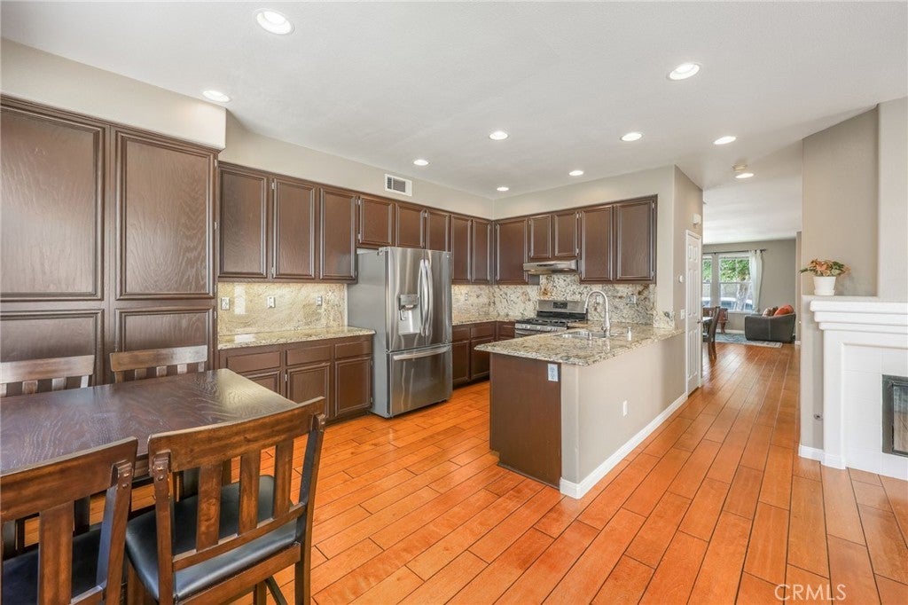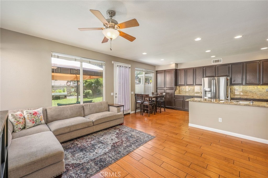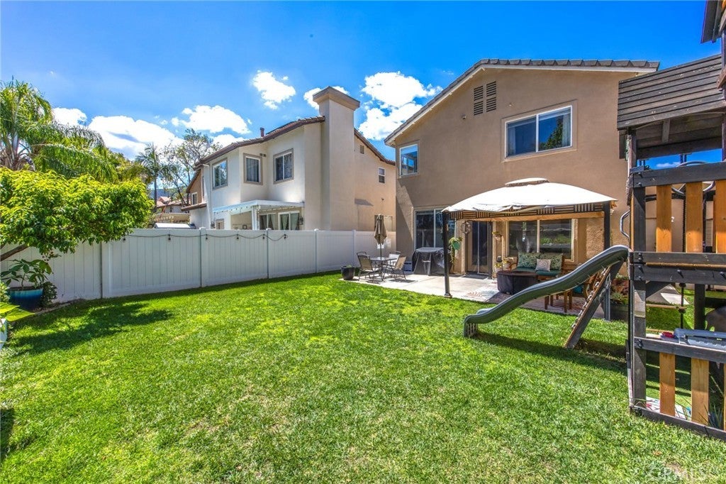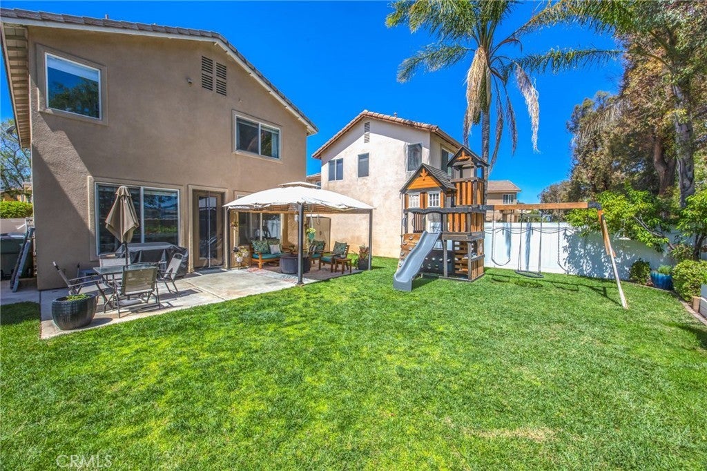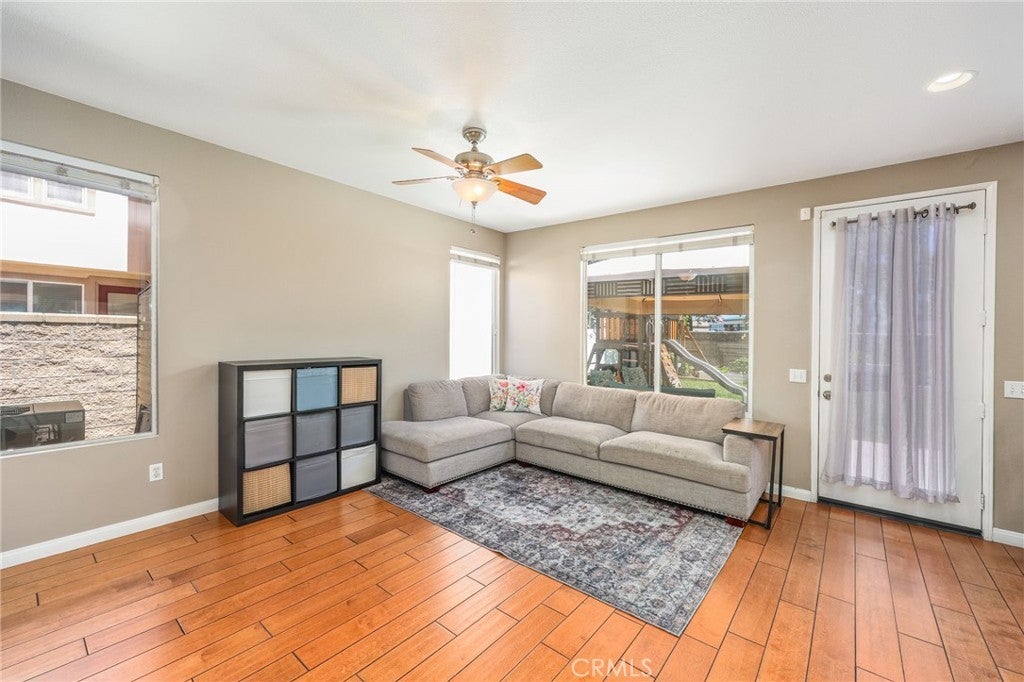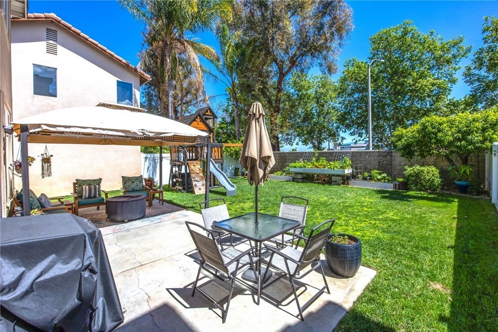 Beautiful two-story home located in the desirable Mountain Gate community of Corona, featuring 3 bedrooms, 2.5 bathrooms, warm hardwood flooring and a spacious loft that can easily be converted into a 4th bedroom. This light-filled home offers an open-concept floor plan, with the kitchen seamlessly flowing into the breakfast nook and expansive family room, complete with a cozy gas fireplace, ceiling fan, and warm wood flooring throughout the main level. The home also includes separate formal living and dining areas, perfect for entertaining. The upgraded kitchen boasts granite countertops, under-cabinet lighting, and stainless steel appliances. The primary suite features a recently remodeled bathroom with large frameless walk-in shower, his and her sinks, walk-in closet, ample storage, grey tile flooring and a soaking tub with chandelier. Two additional generously sized bedrooms offer custom paint and window treatments, along with convenient storage. Step outside to a beautifully landscaped backyard with ample shade, making it ideal for relaxing or entertaining, complete with two nectarine trees, a playground structure and 3 large garden beds, if you so desire. Recent upgrades include a new garage door, vinyl fencing, and an energy-efficient whole house fan. The home also features fully paid-off solar and a Tesla battery backup system. Conveniently located within walking distance near excellent rated schools, shopping centers, restaurants, with easy access to major freeways. The community offers a private gated playground and access to a scenic greenbelt, perfect for walking, running, and outdoor enjoyment.