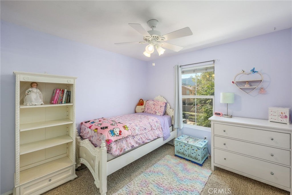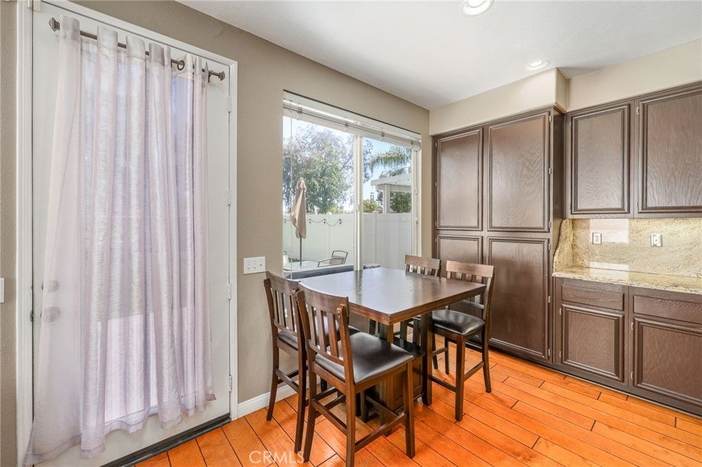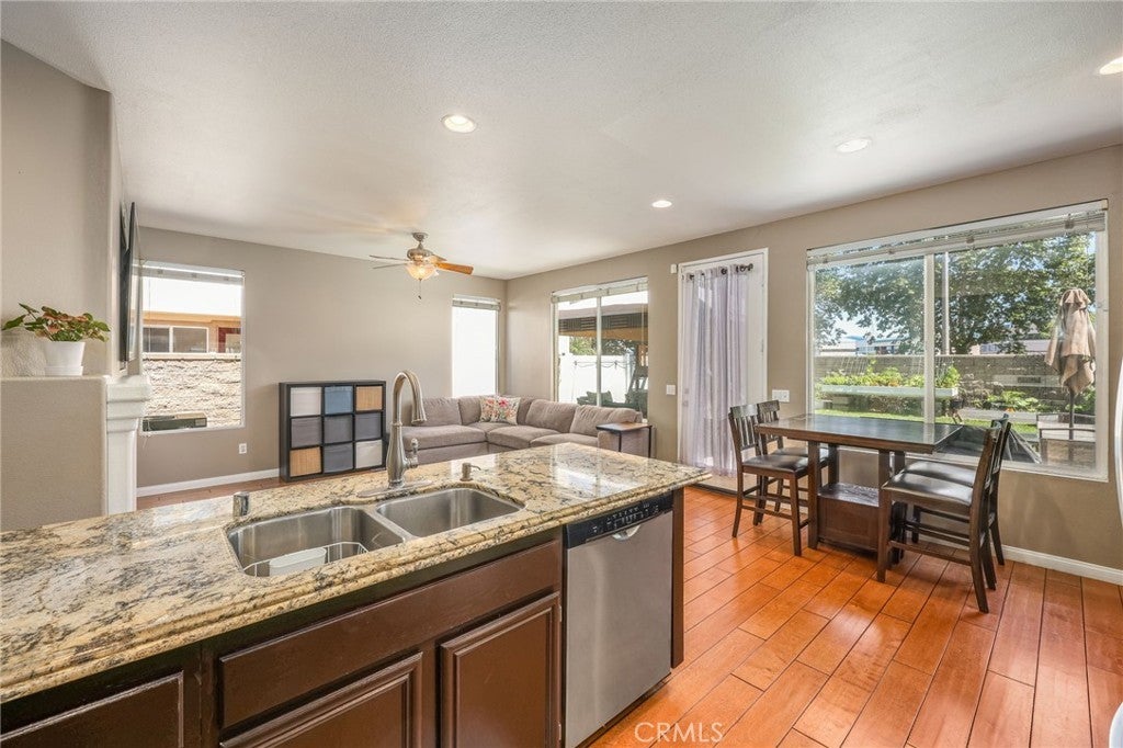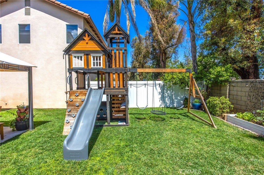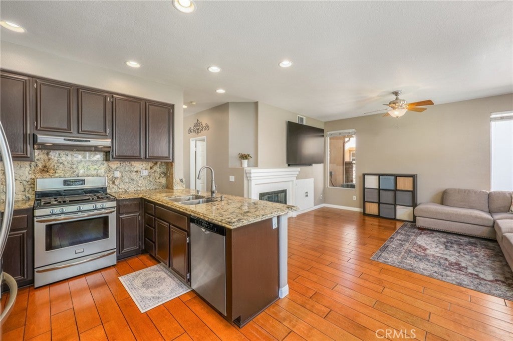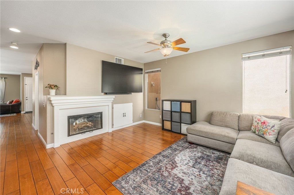 Beautiful two-story home located in the desirable Mountain Gate community of Corona, featuring 3 bedrooms, 2.5 bathrooms, warm hardwood flooring and a spacious loft that can easily be converted into a 4th bedroom. This light-filled home offers an open-concept floor plan, with the kitchen seamlessly flowing into the breakfast nook and expansive family room, complete with a cozy gas fireplace, ceiling fan, and warm wood flooring throughout the main level. The home also includes separate formal living and dining areas, perfect for entertaining. The upgraded kitchen boasts granite countertops, under-cabinet lighting, and stainless steel appliances. The primary suite features a recently remodeled bathroom with large frameless walk-in shower, his and her sinks, walk-in closet, ample storage, grey tile flooring and a soaking tub with chandelier. Two additional generously sized bedrooms offer custom paint and window treatments, along with convenient storage. Step outside to a beautifully landscaped backyard with ample shade, making it ideal for relaxing or entertaining, complete with two nectarine trees, a playground structure and 3 large garden beds, if you so desire. Recent upgrades include a new garage door, vinyl fencing, and an energy-efficient whole house fan. The home also features fully paid-off solar and a Tesla battery backup system. Conveniently located within walking distance near excellent rated schools, shopping centers, restaurants, with easy access to major freeways. The community offers a private gated playground and access to a scenic greenbelt, perfect for walking, running, and outdoor enjoyment.