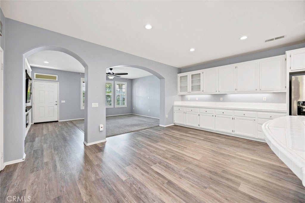 Welcome to elevated 55+ living in the prestigious guard and gated golf course community of The Legends at Hemet Four Seasons, where comfort, convenience, and lifestyle come together beautifully. Ideally positioned with a greenbelt on one side, this home offers added privacy and a peaceful setting, while HOA-maintained landscaping ensures truly low-maintenance living. This highly desirable floor plan features 2 bedrooms plus a dedicated office, offering flexible space for guests, hobbies, or a home workspace. Thoughtfully updated with a modern, cohesive design, the home showcases a large and open kitchen area, updated kitchen appliances, stylish laminate flooring, all complemented by high ceilings throughout. The inviting family room is centered around a custom fireplace and built-in entertainment unit—perfect for cozy evenings or hosting friends. Plantation shutters and an all-glass screen storm door bring in beautiful natural light, enhancing the warm and welcoming feel throughout. The primary suite offers a comfortable retreat with added privacy to the en-suite bath, while the secondary bedroom and office are bright and airy. Step outside to your own private outdoor oasis—designed for both relaxation and entertaining. Enjoy the custom Alumawood patio cover with ceiling fan, built-in BBQ area featuring a Blackstone grill, TV, lighting, and built-ins. Lown maintenance landscaping complete this tranquil space—your perfect “happy place” to unwind. Convenience is unmatched with guest parking located right next to the home, plus a 2-car garage with alley access. Even better, you’re just a short stroll to the resort-style clubhouse, making it easy to enjoy the pool, spa, fitness center, bistro, and vibrant social scene. Residents also have access to tennis, pickleball, bocce ball, billiards, a library, and championship golf—all within the community. This is more than a home—it’s a lifestyle of ease, connection, and enjoyment. Come experience it for yourself.