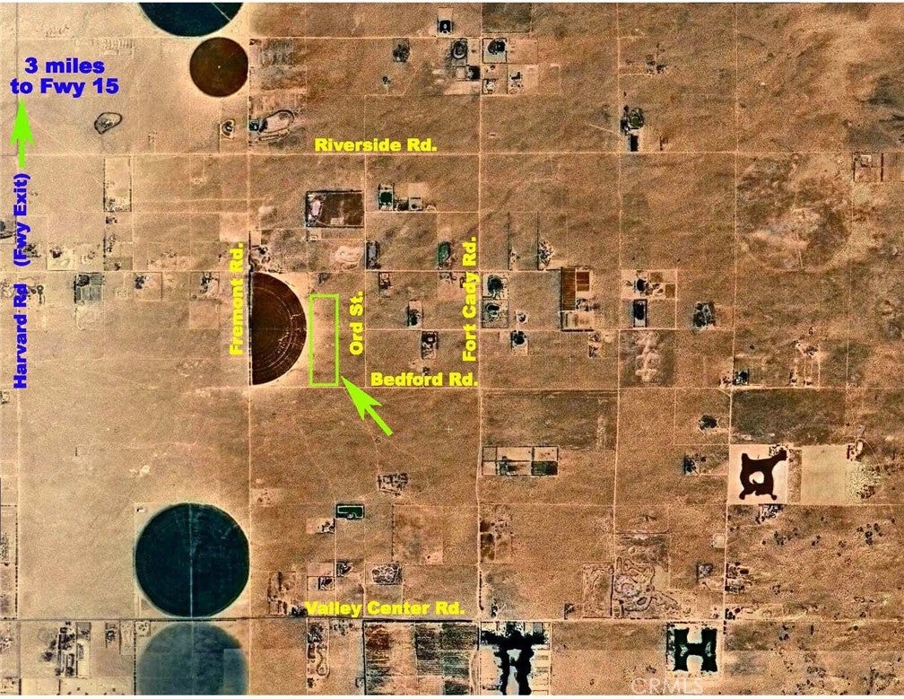 *1.25 miles E. of Harvard Rd. (a freeway 15 exit) * 660’ of frontage on Bedford Rd. * close to a private lake community * Next to an old Alfalfa Farm (abundant ground water supply) * 4 miles S. of Fwy 15 * A level lot zoned residential / agriculture The information provided herein is deemed accurate, but buyer and agent to do own due diligence. There are no warranties, express or implied.