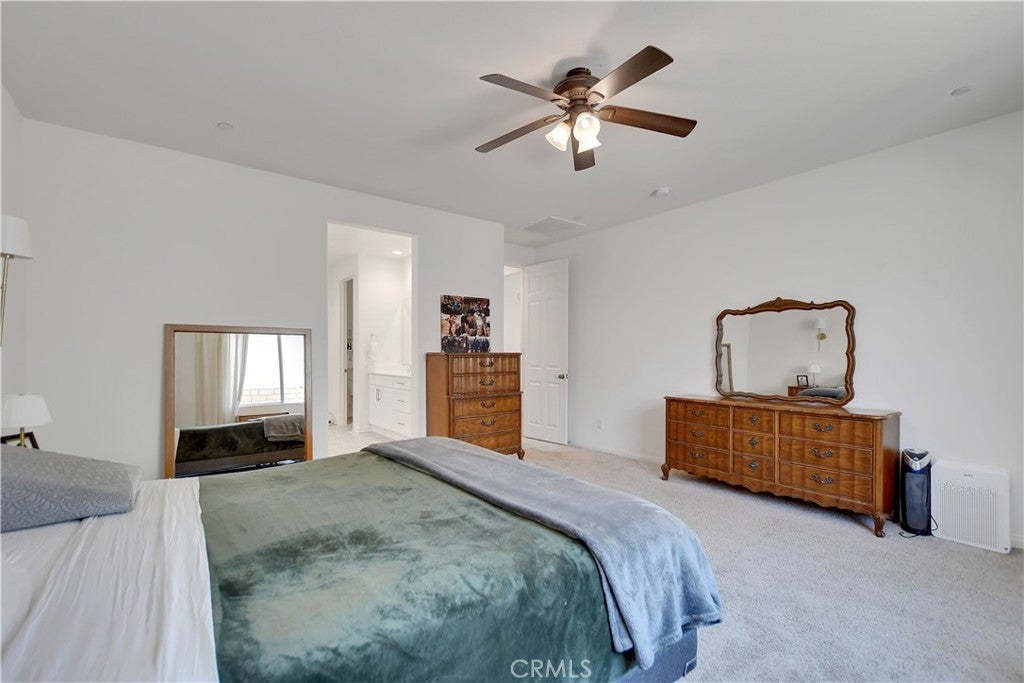 This beautiful single story Menifee home, built in 2023, offers 2615 square feet of living space with four bedrooms, three bathrooms, and a spacious two car garage, all situated on a 6098 square foot lot. Energy efficient paid off solar panels enhance this home, paired with a beautifully landscaped front yard featuring low maintenance greenery and a charming front porch with a sitting area that adds to its inviting curb appeal. Inside, the entryway welcomes you with laminate wood flooring that flow seamlessly throughout the house, a light color palette, and abundant natural light. To the right of the entry, a hallway leads to a full bathroom complete with a shower tub combo, a dual sink vanity and laminate flooring. Also down the hallway are three additional bedrooms, each featuring plush carpeting, ceiling fans, ample closet space, and windows that invite in warm, natural light. Back near the entry, you will find an additional full bathroom featuring laminate flooring, a shower tub combo, and a single sink vanity. Conveniently across the hall is a laundry room equipped with a wash sink, built in shelving and garage access. Relax in the open concept living room, featuring recessed lighting and large windows that flood the space with natural light, ideal for everyday comfort. The bright and spacious kitchen showcases stunning natural stone quartzite countertops, a walk in pantry, and stainless steel appliances including a five burner gas cooktop, built in oven, microwave, and dishwasher. It offers an abundance of cabinetry for ample storage, along with a large center island featuring a deep sink, matching granite surface, and bar seating for four. The dining area has recess lighting and a sliding glass door that floods the room with natural light and grants backyard access. Just beyond the living room, the large master suite includes plush carpet flooring, a window and a ceiling fan. The private en-suite bathroom offers a cohesive design with a matching tiled walk in shower and soaking tub. A dual sink vanity, linen closet and spacious walk in closet add both comfort and convenience. The backyard offers a spacious, blank canvas ready for your personal vision. Surrounded by a block wall and white vinyl fencing for added privacy, it's the perfect setting to design your ideal outdoor living space. This home is conveniently located near shopping centers, freeways, and highways, this home offers the perfect blend of comfort and accessibility.