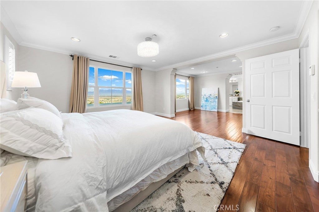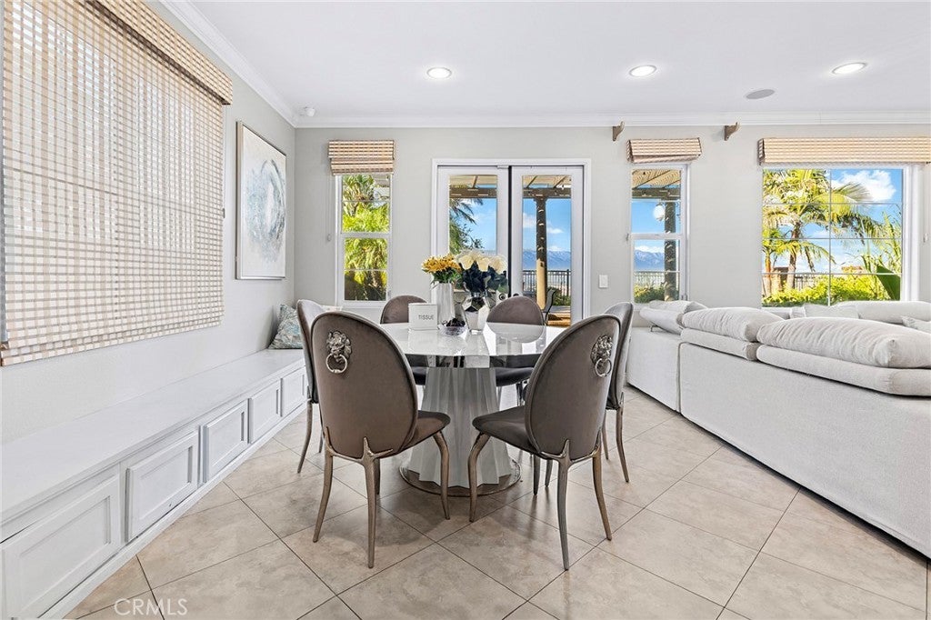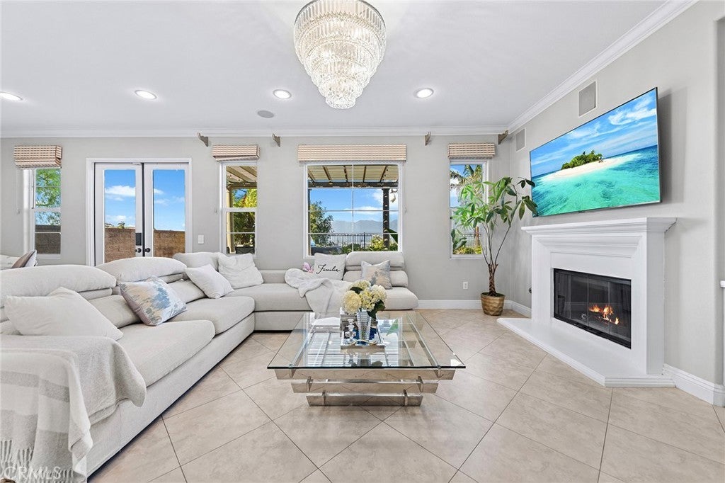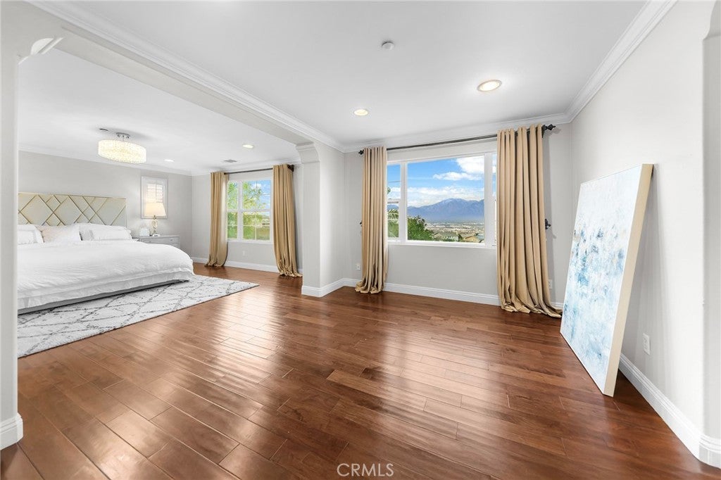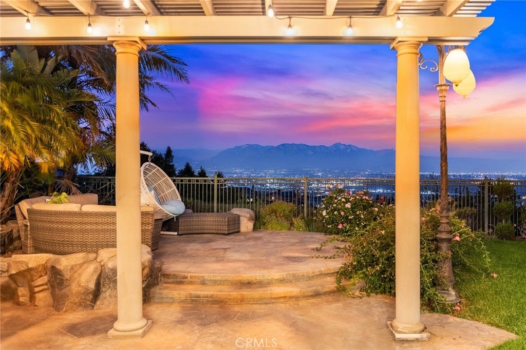 VIEW! VIEW! VIEW! Panoramic snow mountain and city lights Views! Very well maintained and upgraded executive property in Sycamore Heights! Great curb appeal. 5 bedrooms, 3 bathrooms (one bedroom one bath downstairs), plus a loft upstairs, 3 car attached garage. Enter through the private wrought iron gate to the expansive courtyard. Bright and spacious living room. Formal dining room with custom chandelier. Large family room with fireplace and media center. The gourmet kitchen boasts ample storage space with walk-in pantry, granite countertops, a center island, and a breakfast nook opening to the backyard, premium stainless-steel appliances, including 5-burner cooktop, built-in refrigerator, double-ovens, and dishwasher. The downstairs bedroom and remodeled full bath add extra convenience. Upstairs features a huge bonus room, perfect for entertainment. Primary bedroom with retreat area and large walk-in closet with organizers. Primary bathroom features soaking jacuzzi tub, separate shower with frameless glass enclosures, and double vanities. Upstairs includes three additional bedrooms. Other notable features include: Custom two-tone interior paint, engineered wood floors in living room, formal dining room and bedrooms, luxury custom window curtains, plantation wood shutters and roller shades, crown moldings, chandeliers, recessed lights, two central A/C units, upstairs laundry room with sink. Professionally landscaped gardens, palm trees and flowers, aluminum patio, elevated sitting area. Breathtaking 180-degree of mountain and city lights views. Excellent Chino Hills Schools, California Distinguished Wickman Elementary. Convenient location, close to shopping centers, restaurants, and easy access to freeways. This meticulously upgraded property is a true gem!