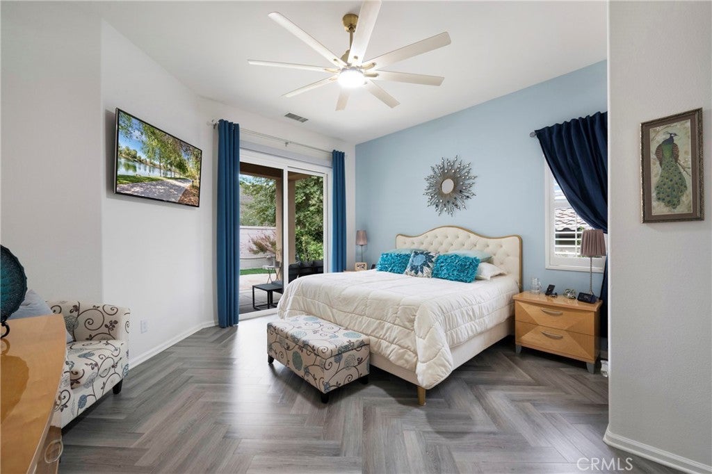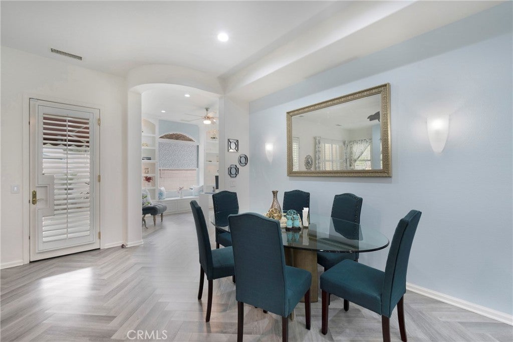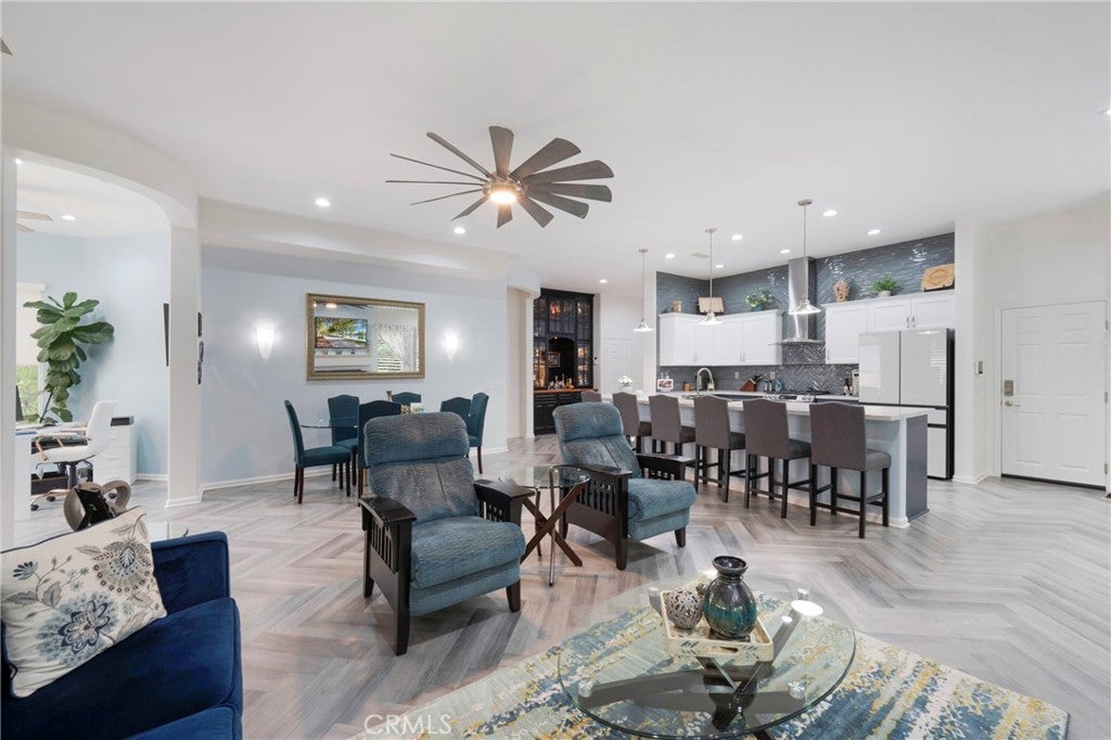 This impeccably remodeled single-story gem captures the effortless Trilogy lifestyle. Boasting two bedrooms + office, this turnkey residence shines with a fully remodeled kitchen and bathrooms, brand-new flooring throughout, and thoughtful upgrades at every turn. Step inside to an open living room featuring a built-in bar – the perfect entertaining hub. The cozy family room invites relaxation with a fireplace ideal for fireside conversations. The heart of the home is the stunning remodeled kitchen, complete with a spacious counters, pull out shelves in lower cabinets, bar-top seating, sleek countertops, and modern finishes designed for both casual dining and hosting. Retreat to the generous primary suite with direct access to an outside patio, a spa-like primary bath showcasing a large walk-in shower with bench and rainfall shower head, dual vanities, and an expansive walk-in closet. The second bedroom is perfect for guests. A versatile office with built in book shelves overlooks a low maintenance back patio. The beautifully updated guest bath complete the interior. Outside, enjoy living on the private patio with electric retractable awning – perfect for shaded gatherings or quiet mornings. Additional features include double-pane windows with plantation shutters, smart ceiling fans, and new flooring that flows seamlessly throughout. The Trilogy community features fitness centers, pools, tennis, pickleball, bocce, and the award-winning Glen Ivy Golf Course – all surrounded by rolling hills and natural beauty.
