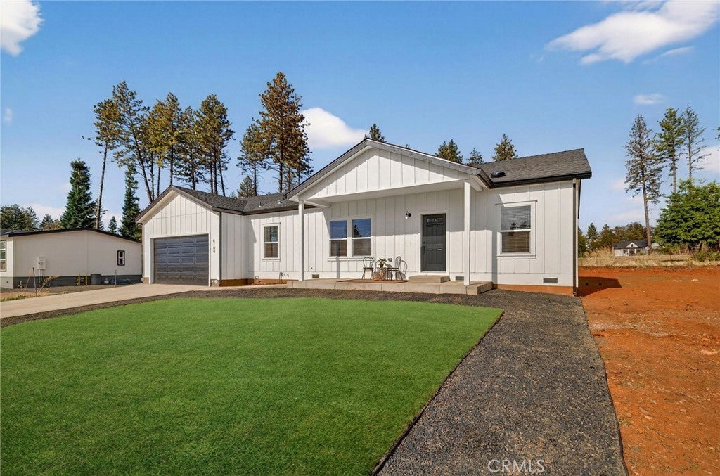 Welcome to your new home at 6160 Beacon Court, a beautiful new 3-bedroom, 2-bath manufactured farmhouse-style home offering 1,620 sq. ft. of comfortable, modern living. Perfectly situated at the end of a small cul-de-sac on a wide 0.42-acre lot, this home enjoys a peaceful hilltop setting with plenty of space to stretch out. Just minutes from Bille Park, this is one of the most desirable and growing areas of Paradise. Step inside to a bright, open floor plan featuring 9-foot ceilings, upgraded flooring, and a cozy recessed fireplace. The spacious kitchen is a true centerpiece, featuring an oversized island, farmhouse sink, updated cabinetry, and stainless-steel appliances, perfect for everyday living and entertaining. The primary suite offers a relaxing retreat with a large walk-in closet and a spa-inspired en-suite bath with dual sinks and a walk-in shower. The guest bathroom also includes double sinks, offering both comfort and convenience. You’ll love the huge utility room with ample storage space, ideal for laundry, organization, or hobbies. Enjoy the outdoors with a wide covered front porch, an attached 2-car garage, and a 5/12 roof pitch that enhances the home’s classic modern farmhouse appeal. The spacious front, side, and backyard areas offer endless possibilities for gardening, play, or future outdoor projects. Experience the perfect blend of comfort, style, and modern living in this beautifully designed home in Paradise.