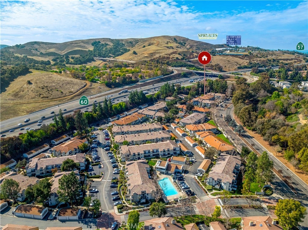 Welcome to Country Villas in Phillips Ranch! Experience comfortable and stylish living in this beautifully designed two-story townhome-style condo featuring dramatic high ceilings and an abundance of natural light throughout. This desirable end-unit offers three spacious bedrooms upstairs, ideal for family living or a home office setup. The open-concept kitchen flows seamlessly into the bright living and dining areas, creating an inviting space perfect for entertaining. A skylight above the stairwell enhances the home’s open and airy ambiance. The living room, stairwell, and bedrooms feature carpet flooring, while the kitchen and bathrooms are finished with durable tile floors. Enjoy outdoor relaxation on your private wraparound front patio, perfect for morning coffee or evening gatherings. This unit also includes one shared garage space and one additional unassigned parking space with permit. Residents of Country Villas enjoy resort-style amenities including a Junior Olympic-sized swimming pool, four spas, picnic and playground areas, and beautifully landscaped greenbelts throughout the community. Ideally located near local shopping, dining, and entertainment, including WinCo, Walmart, The Shoppes at Chino Hills, theaters, restaurants, parks, walking trails, dog parks, and golf courses. Convenient access to the 71, 60, 10, and 57 freeways makes commuting a breeze. The HOA covers water, trash, exterior building maintenance, landscaping, and security patrol, offering a low-maintenance lifestyle in one of Phillips Ranch’s most sought-after communities.