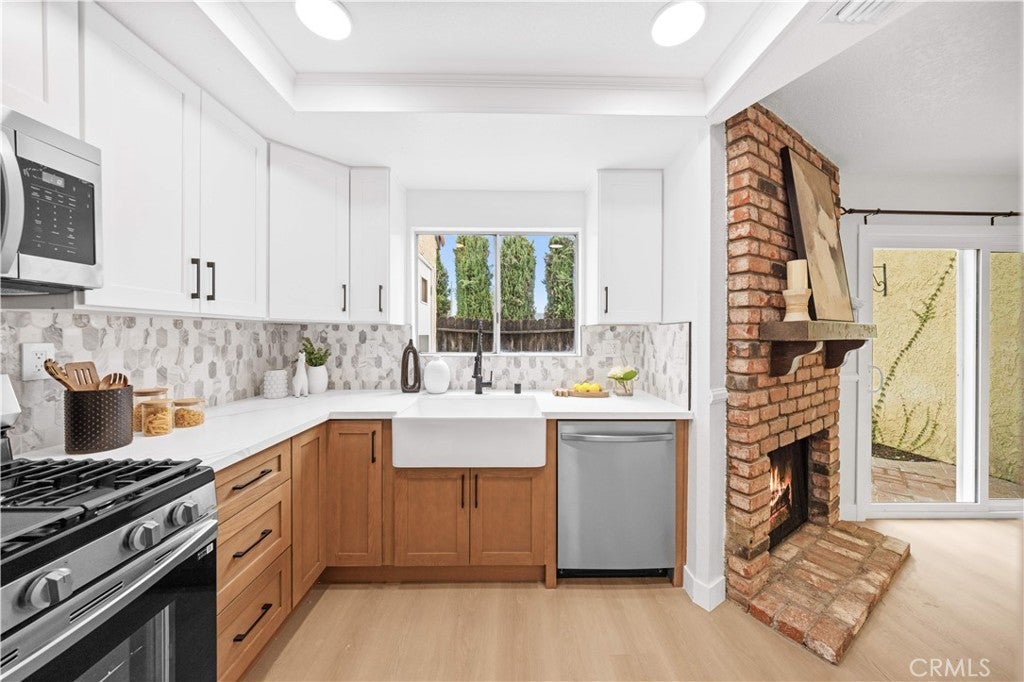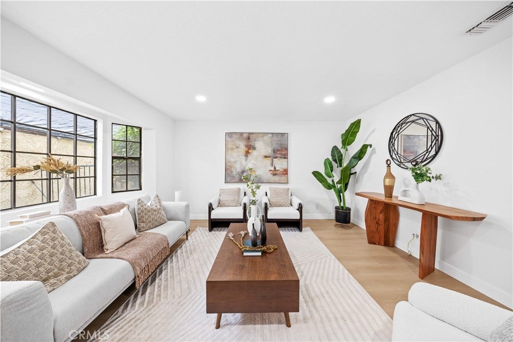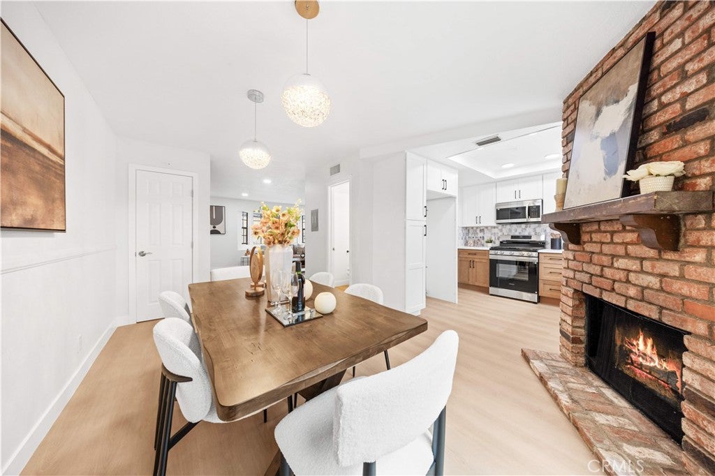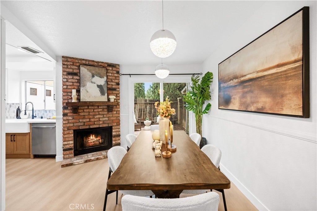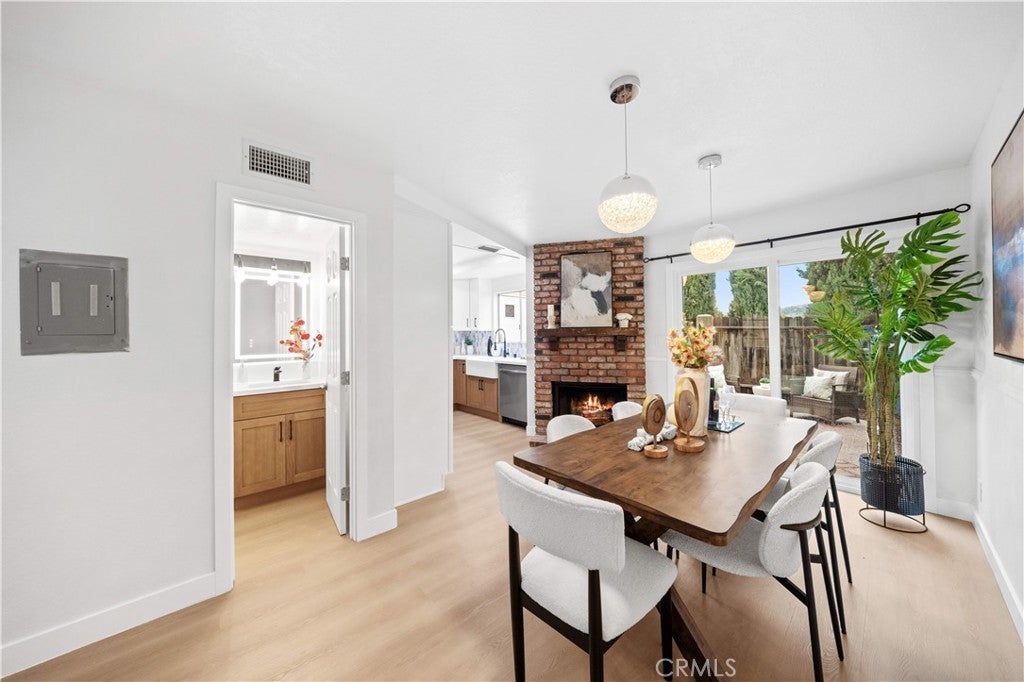 This is a beautifully renovated, bright home located in one of the most sought-after communities in La Habra. The entire house features a modern Scandinavian minimalist style with clean, elegant colors, a charming red-brick fireplace, and abundant natural light flowing throughout. Surrounded by lush greenery, the home feels peaceful and comfortable. It offers three bedrooms and two and half bathrooms, a refreshed kitchen, and a spacious laundry room. Two of the bedrooms enjoy distant views of the Whittier Hills, making it a wonderful place to live and relax. The property comes with one garage, one carport. It offers convenient access to major roads, and nearby shopping centers and restaurants make everyday living extremely easy. The spacious private patio is serene and surrounded by various plants—perfect for unwinding, hosting family gatherings, and enjoying all kinds of entertainment. Don't miss out on this opportunity!