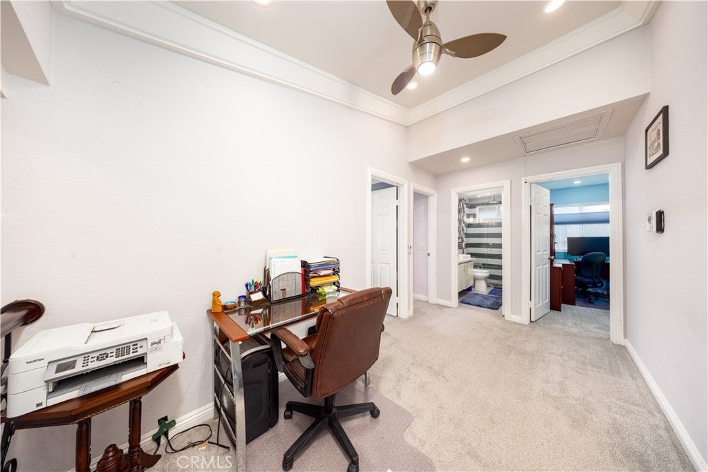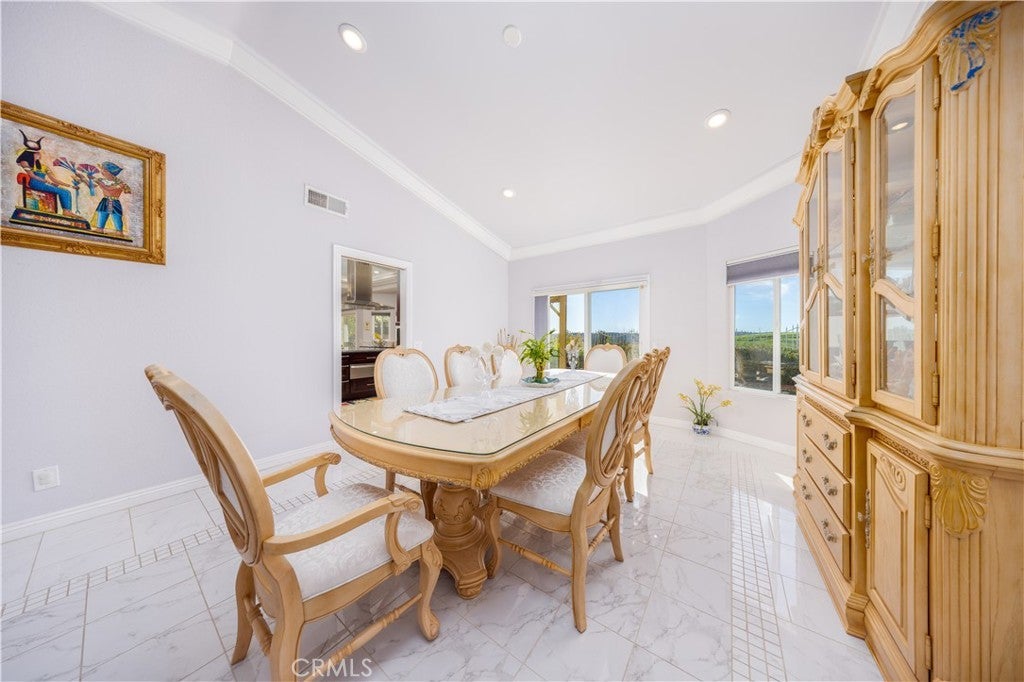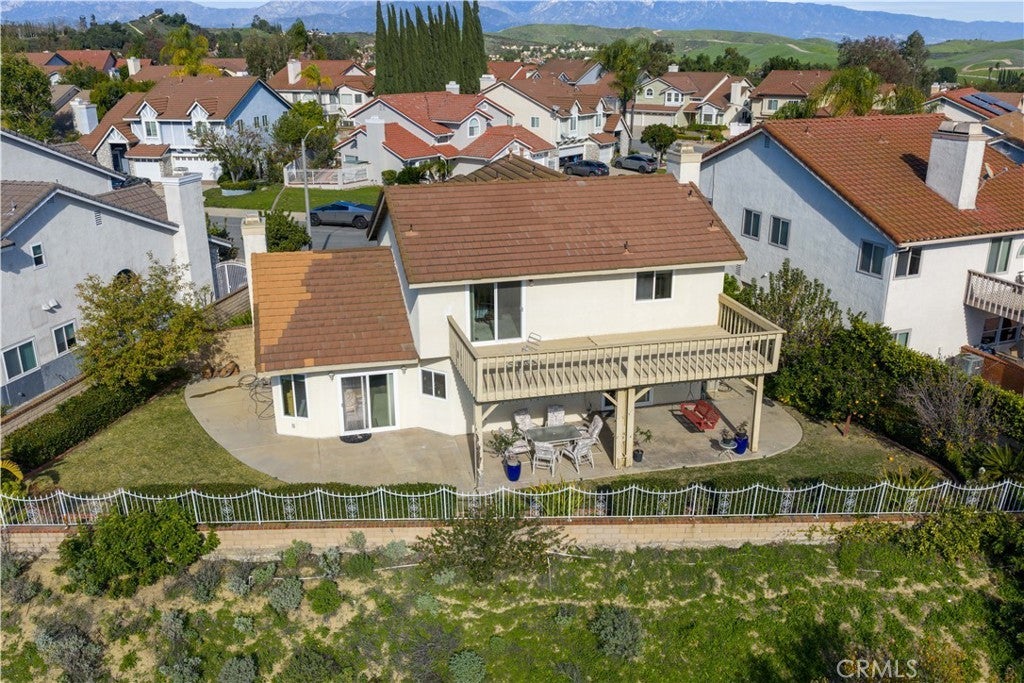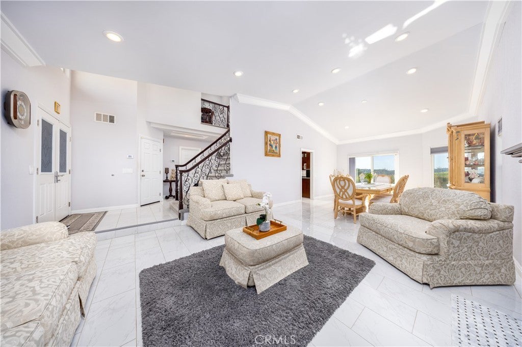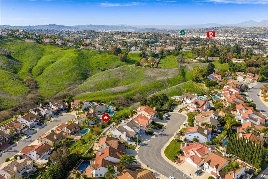 Welcome to this beautifully updated Diamond Bar home, ideally positioned to capture impressive bird’s-eye views overlooking neighboring homes, the Country Estates gated community above, and the lower-level street below—offering one of the area’s most desirable vantage points. Step through the grand double front doors into a bright, airy interior filled with natural light and south-facing rear garden views. The updated kitchen is spacious and well appointed, featuring a large center island with seating for up to six, walnut-stained custom cabinetry, expansive windows, and stainless-steel KitchenAid appliances, including an induction cooktop and food-warmer drawer. The scenic views from the kitchen are truly captivating. The adjacent day room is surrounded by windows and enhanced by a recessed ceiling with multi-color LED border lighting, creating a warm evening ambiance. The dining room offers ample space for entertaining with panoramic garden views, while the living room features bay windows, a central fireplace, crown molding, recessed LED lighting, and an elegant staircase with scrolled iron balusters. Upstairs, the spacious primary suite includes a luxurious en-suite bathroom with dual vanities, a soaking tub, a separate shower, and Ming red granite finishes. A patio door opens to an oversized upper deck with sweeping hill and neighborhood views. Three additional bedrooms and one full bathroom complete the upper level. Additional features include a three-car garage with built-in storage, a workbench, water heater, and washer/dryer hookups. The beautifully maintained rear garden offers serene hillside views—perfect for morning coffee or evening relaxation. Conveniently located near award-winning schools, parks, shopping, and dining, this home presents a wonderful opportunity to enjoy comfort, views, and location in one of Diamond Bar’s most sought-after neighborhoods.