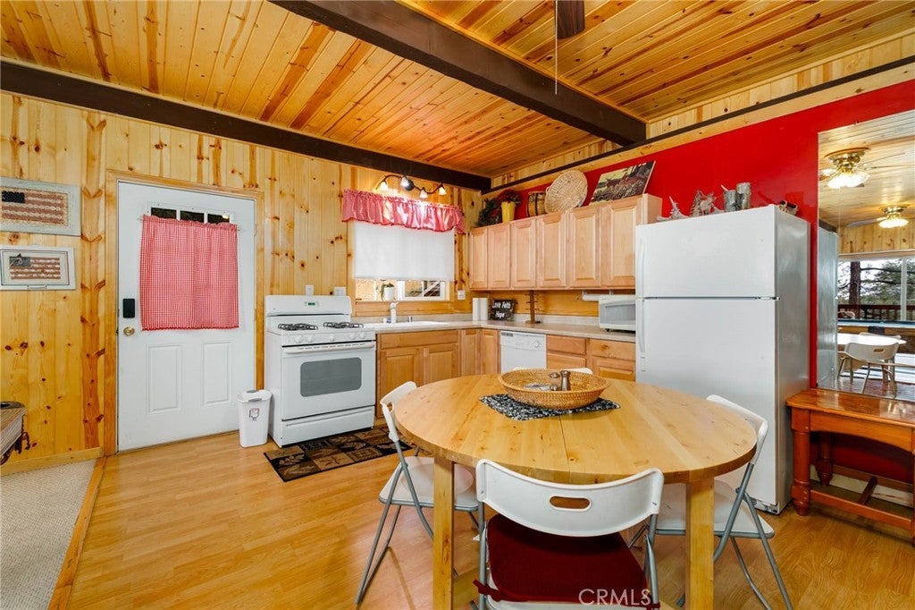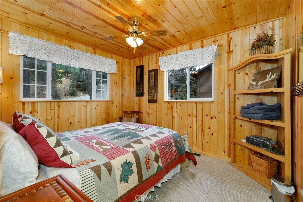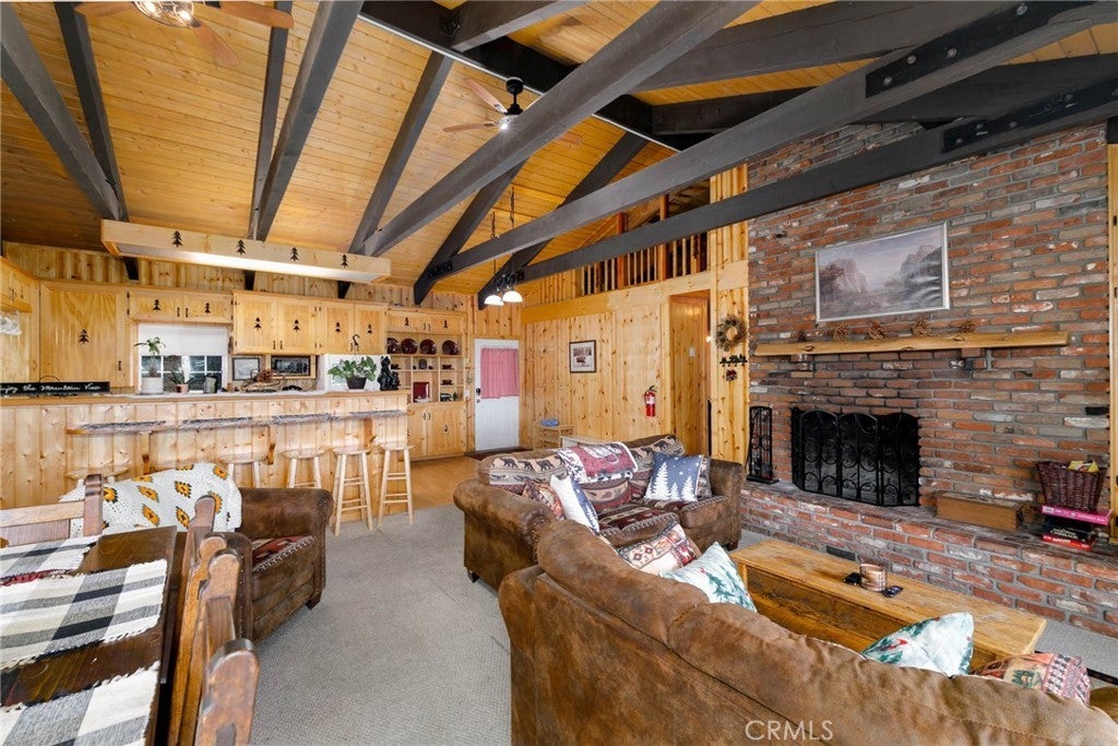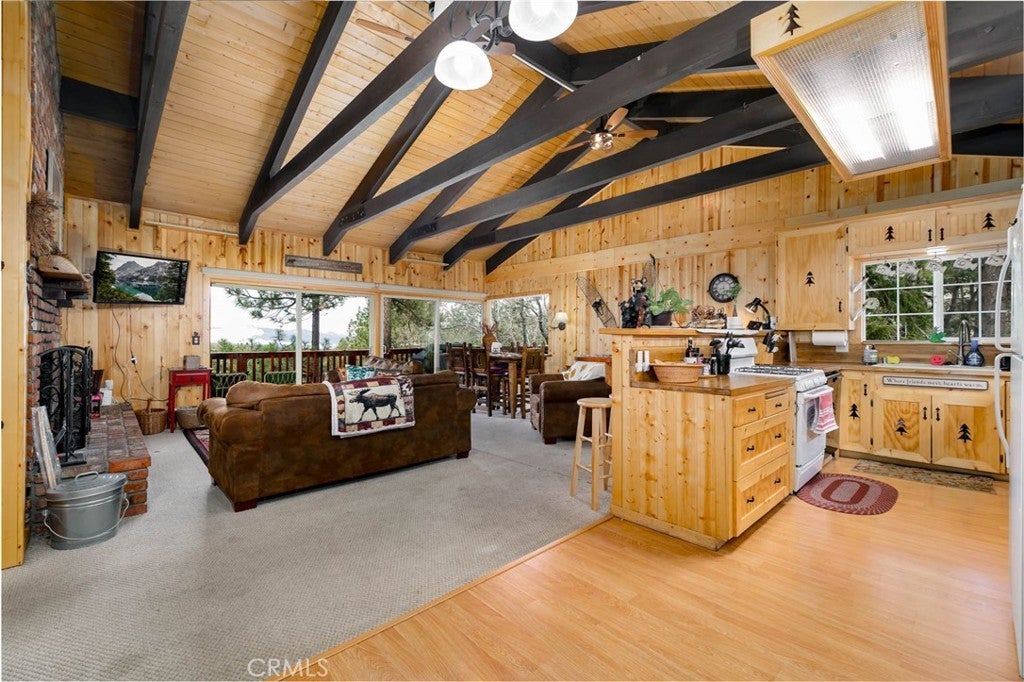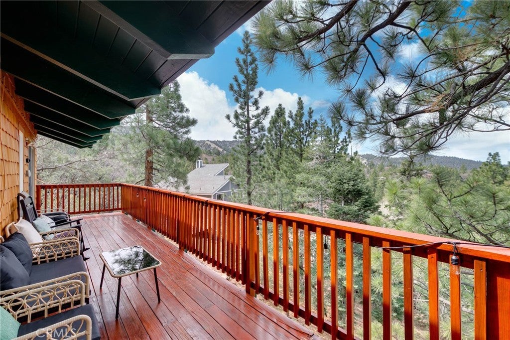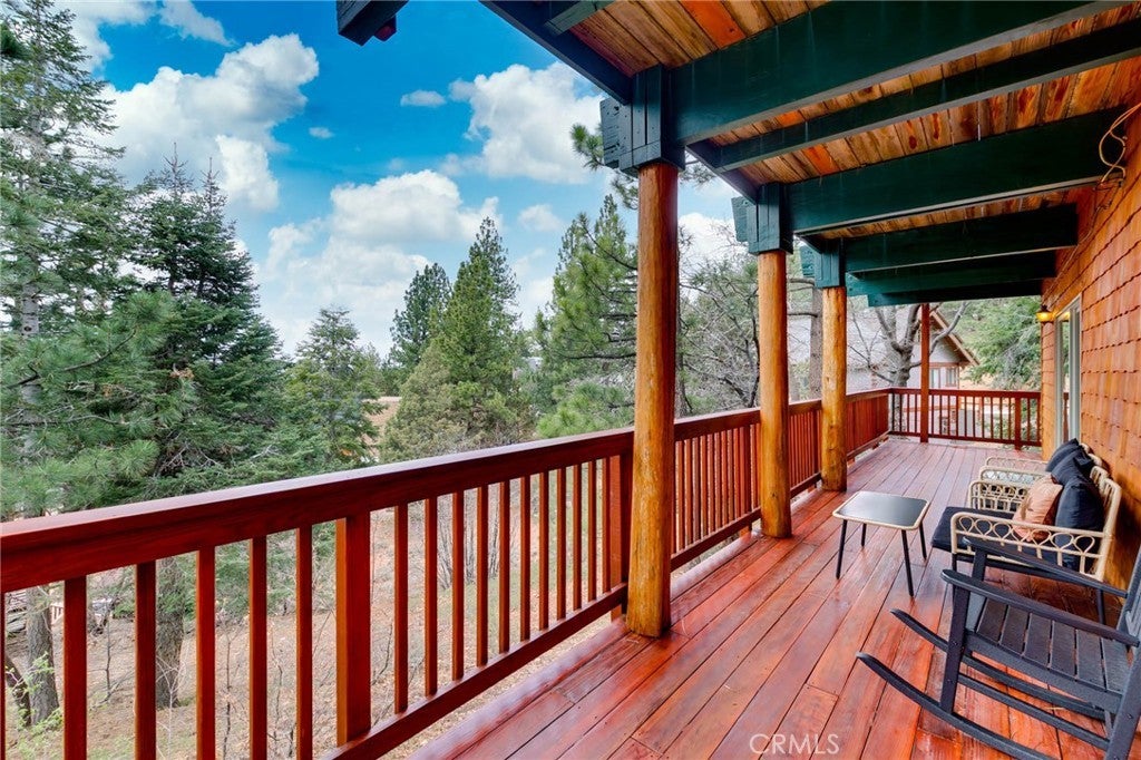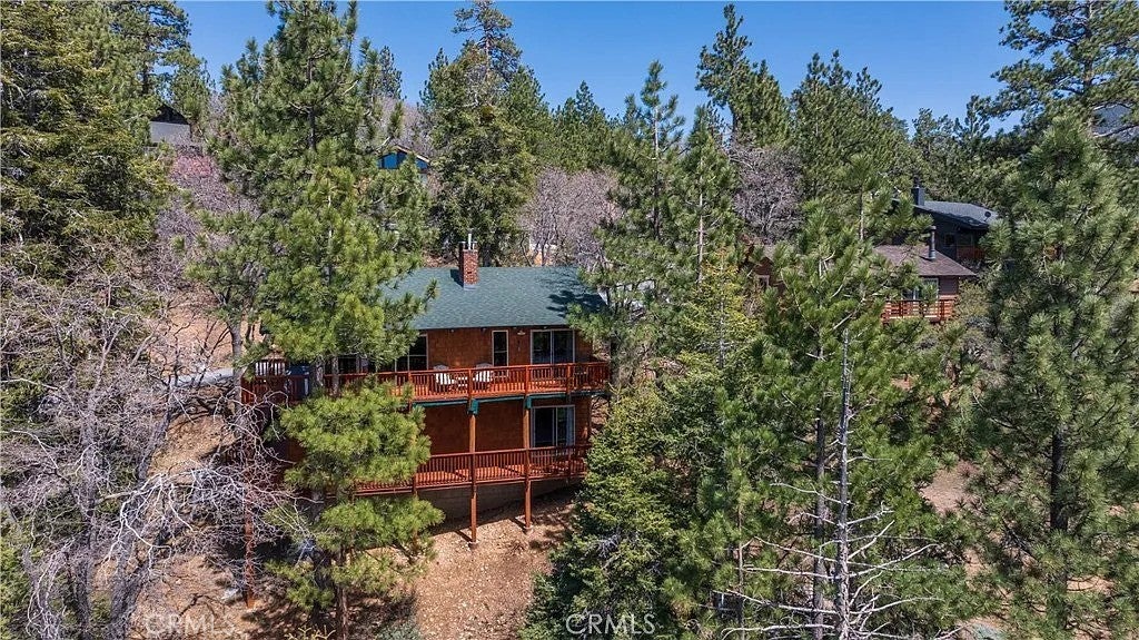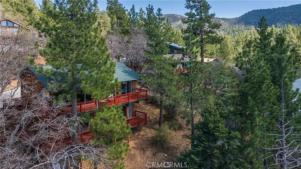 Welcome to this charming mountain retreat located in the desirable Upper Moonridge area of Big Bear Lake. This spacious cabin offers 4 bedrooms, 2 bathrooms, and approximately 1,824 sq ft of living space on a generous 9,856 sq ft lot. The open-concept living area features vaulted wood-beamed ceilings, abundant natural light, and a cozy fireplace, creating the perfect mountain lodge atmosphere. Enjoy breathtaking views of the lake, mountains, and ski slopes from the large wraparound deck—ideal for relaxing or entertaining while taking in Big Bear’s beautiful sunsets. The home also features two kitchens and a versatile lower level with its own living space, offering excellent flexibility for guests, extended family, or potential rental opportunities. Conveniently located just minutes from Bear Mountain Ski Resort, Big Bear Lake, the National Forest, and the Moonridge Corridor’s shops and restaurants, this property is perfect as a primary residence, vacation getaway, or investment opportunity.