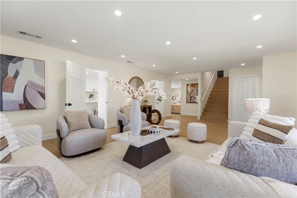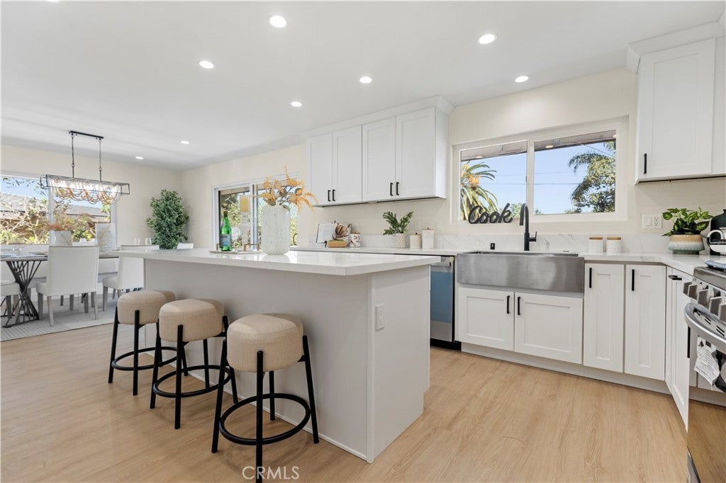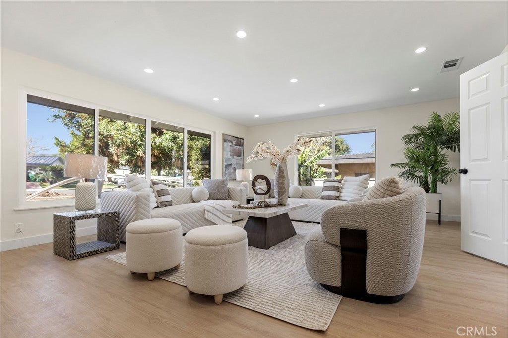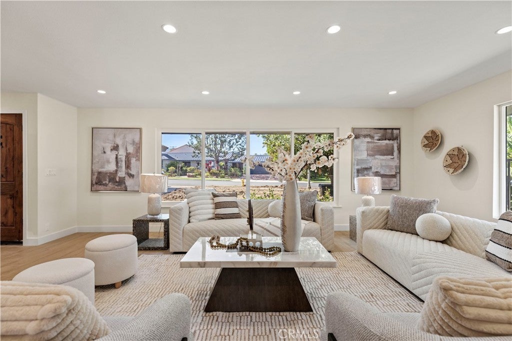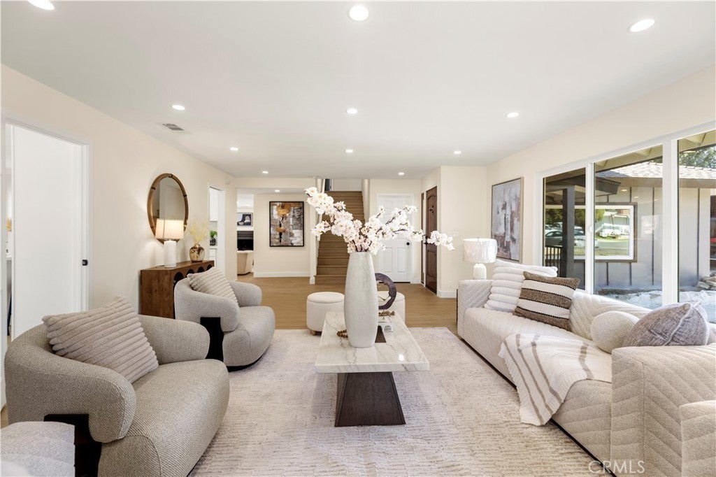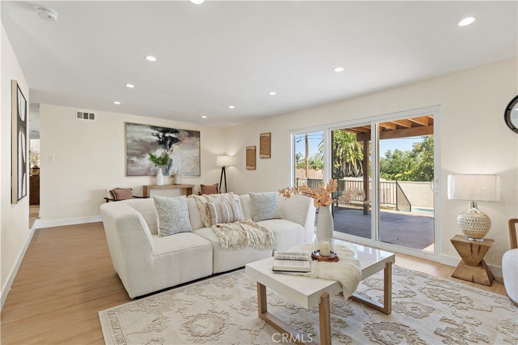 Welcome to 645 Lancer Lane, a beautifully reimagined residence located in one of Corona’s most desirable neighborhoods known for its custom homes, spacious lots, and quiet residential setting. Set on an expansive 10,454 sq ft lot, this fully remodeled home offers approximately 2,377 sq ft of thoughtfully designed living space featuring 4 bedrooms and 5 bathrooms, including a highly desirable main-level bedroom and bath—ideal for guests, multigenerational living, or a private home office. From the moment you enter, the home showcases a bright open layout enhanced by wide plank flooring, recessed lighting, and contemporary designer finishes. The spacious living room and dining area flow seamlessly into the beautifully updated chef's kitchen, featuring abundant cabinetry, generous counter space, a center island with wine cabinet, embedded microwave and breakfast seating. A large family room with statement fireplace provides an inviting space for gathering and entertaining, with direct access to the backyard for effortless indoor-outdoor living. Upstairs offers three well-appointed bedrooms along with three bathrooms, providing exceptional flexibility and privacy. A standout feature of the home is the private outdoor deck, perfect for enjoying sunset views, morning coffee, or relaxing evenings overlooking the neighborhood. The backyard is designed for Southern California lifestyle living, complete with a private pool, expansive patio areas, and generous space for entertaining or creating your own outdoor retreat. Additional highlights include: • Three-car garage (approx. 775 sq ft) • Large driveway and potential RV access from rear alley • Spacious and functional floor plan • Modern interior renovation throughout • Walking distance to local schools and parks Combining modern upgrades, generous living space, and an oversized lot, this beautifully updated property offers a rare opportunity in the sought-after Lancer Lane community. Buyer to verify all information including square footage and property details.