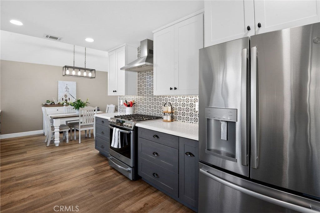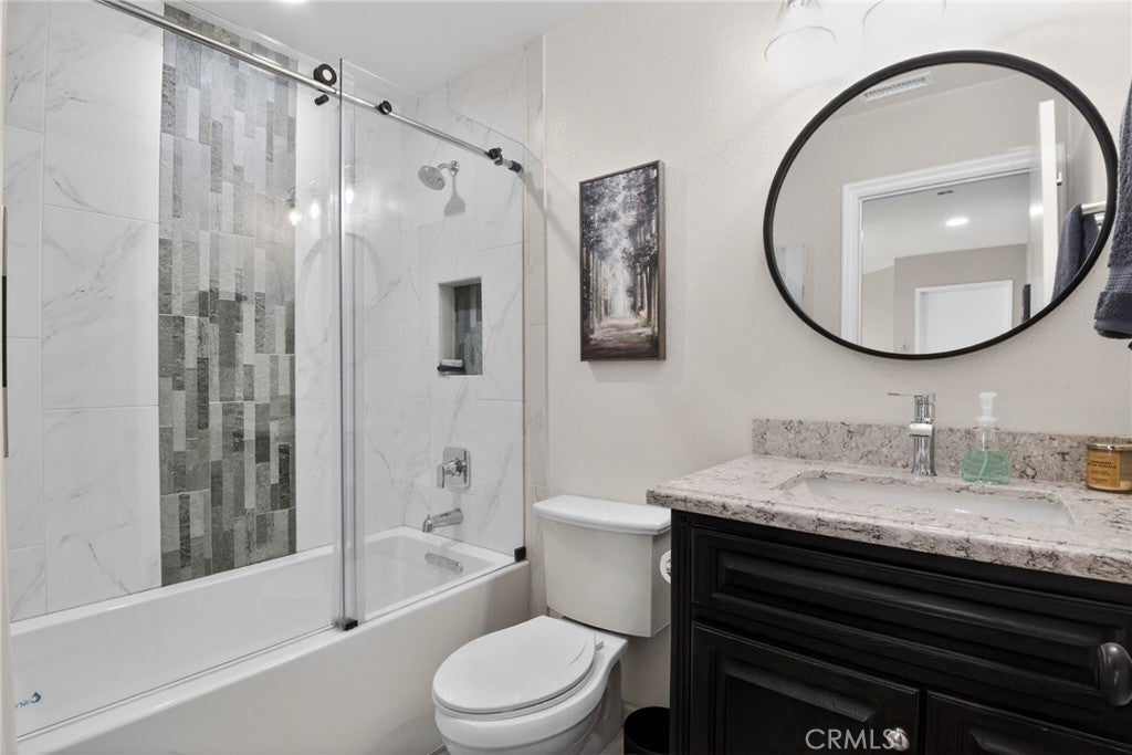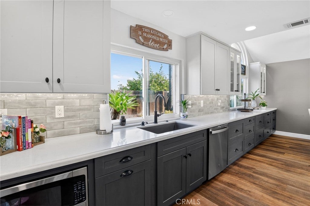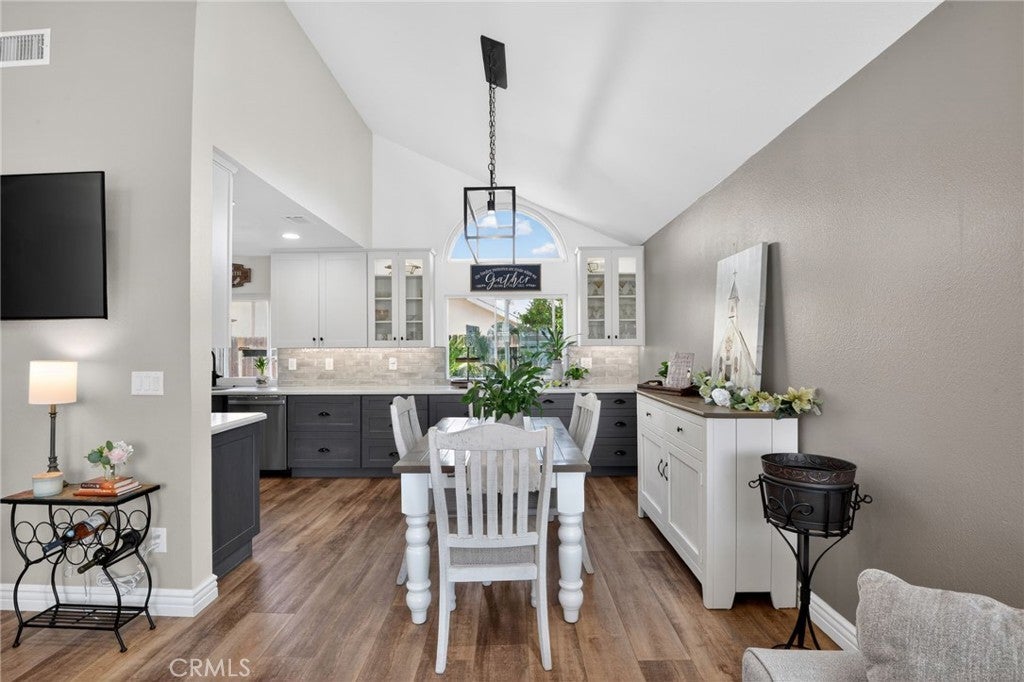 Beautifully updated 4 bed, 3 bath home featuring a truly show-stopping, expanded kitchen designed for entertaining. This reimagined space offers exceptional cabinetry and extended counter space that flows seamlessly from the kitchen through the dining area—creating one continuous serving and gathering space. Highlights include white cabinetry, stainless steel sink, newer appliances, abundant storage with soft-close doors and pull-out drawers, and a generous serving bar perfect for hosting. The versatile floorplan includes a spacious, sun-filled main-floor bedroom with a full downstairs bathroom, ideal for guests, extended family, or a private home office. Upstairs, the primary suite offers a remodeled bath with a travertine shower, granite countertops, and a walk-in closet. Secondary bathrooms are tastefully upgraded with newer cabinetry, granite surfaces, and updated fixtures. The main level showcases wide-plank luxury vinyl flooring, complemented by carpeting in all bedrooms for comfort. The home also features inviting outdoor spaces, including a charming front patio perfect for conversation and a backyard designed for entertaining. Both front and rear yards are beautifully landscaped with palms, lush lawn, and colorful plantings, creating strong curb appeal. A rare combination of thoughtful upgrades, exceptional kitchen design, and indoor-outdoor living—this home is made for gathering, hosting, and enjoying. Creekside HOA in Ontario offers a well-rounded, lifestyle-oriented setting with multiple community pools and spas, tennis courts, playgrounds, picnic and BBQ areas, and scenic walking paths woven through greenbelts and a central lake/water feature, along with access to Creekside Park featuring additional sports courts, open space, and recreation areas, all supported by well-maintained landscaping that gives the neighborhood a cohesive, resort-like feel at relatively low HOA dues. Ontario’s new Dodgers-affiliated stadium, ONT Field, is a state-of-the-art, 6,000-seat ballpark anchoring the massive Ontario Sports Empire—a nearly 200-acre sports and entertainment complex designed to become a premier destination in Southern California. Opening in 2026 as home to the Dodgers’ Single-A affiliate, the stadium blends a modern, family-friendly baseball experience with restaurants, fan amenities, and an aviation-themed design, while driving major economic growth and positioning Ontario as a regional hub for sports, events, and community activity.
