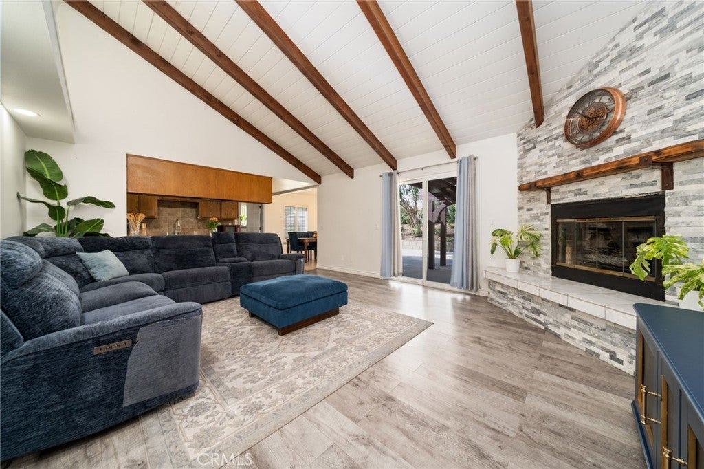 Welcome to this charming single-story Spanish-style home, perfectly situated at the end of a quiet cul-de-sac with desirable RV parking and a spacious driveway accommodating up to six vehicles. Nestled in a family-oriented neighborhood, this home offers convenient access to shopping and transportation while maintaining a peaceful residential feel. Step inside to discover beautiful Spanish arched entryways leading into the formal living and dining rooms, creating a warm and inviting first impression. The expansive family room showcases stunning natural wood open-beam vaulted ceilings and a cozy fireplace, making it the perfect space for relaxing or entertaining. The adjacent gourmet kitchen features gorgeous granite countertops, a newer stove, range, and oven, and flows seamlessly into the main living areas. Throughout the home, you’ll find rich natural wood moldings and wood-finished doors that add timeless character and charm. The open floor plan offers spacious rooms filled with natural light. The primary suite serves as a private retreat, complete with a walk-in closet and a large bathroom featuring dual vanity sinks, a soaking tub, and a separate shower. Sliding glass doors lead directly to the backyard patio, creating a seamless indoor-outdoor living experience. The backyard is truly an entertainer’s delight—thoughtfully redesigned with a concrete slab, retaining wall, and professional landscaping. Enjoy a tranquil setting surrounded by Texas privets, rose bushes, lavender plants, and sago palms, along with a fragrant greenhouse and sprinkler system. It’s the perfect space for BBQ gatherings or relaxing evenings outdoors. Additional upgrades include dual-pane windows, newer central A/C and forced air systems, and recessed lighting throughout. Both bathrooms have been tastefully remodeled with new faucets, countertops, and toilets, completing this beautifully maintained home that blends comfort, style, and functionality.