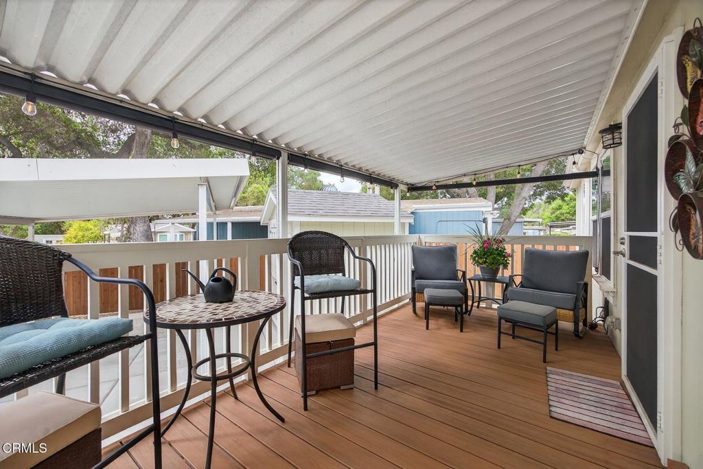 Gorgeous turn-key home located in the highly desirable Golden Oaks (55+) community. This lovely home features 2 bedrooms, 2 bathrooms plus an office/den, laundry room, vaulted ceilings, vinyl plank floors, central heat and air conditioning. The open concept floor plan has a great flow and offers an abundance of natural light. For those who enjoy cooking, you will love the spacious kitchen with a large center island, ample cabinet space, sleek counters and tile backsplash. Appointed with stainless steel appliances and a beautiful stainless steel apron front farm sink. There are single French doors with blinds between the glass in the living room, primary bedroom and guest room offer easy access to the great outdoors. The living room features a wood burning, flagstone fireplace perfect for cozying up next to while reading a book. When you enter the primary bedroom, it feels like you are stepping into your own private oasis with direct access to the deck, a customized closet with motion sensor lights for a more usable space and ceiling fan. The large attached bathroom has a contemporary walk in tile shower and nice vanity area. Two covered decks create a tranquil outdoor living space perfect for your morning coffee, afternoon nap or evening beverage. There is also the rare side by side carport which provides easy access to parking. The large Tuff Shed and a smaller shed out back are perfect for all of your storage needs. This is a beautiful park with majestic oak trees gracing its residence. The park amenities include a pool, clubhouse, dog park, community garden, RV parking and the Ojai Trolley stop is right out front. The low monthly space rent of $894.23 includes, trash, water and sewer. This home is stylish, tranquil and low maintenance making it the perfect place to enjoy retirement.