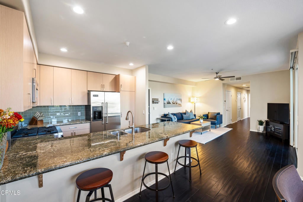Experience the Best of Coastal Downtown Ventura Living! Welcome to the Poli-Oak Pavilion, and a rare opportunity to own a modern end-unit condo in the heart of Downtown Ventura! This exclusive residence offers the perfect blend of coastal charm and urban convenience. Start your day with a scenic hike in the Ventura Botanical Gardens, where breathtaking panoramic ocean views and lush landscapes await. Stroll to Main Street, where an endless array of dining, shopping, and entertainment options cater to every taste. As the sun sets, take a leisurely walk to the beach and soak in the spectacular coastal scenery. This 2-bedroom, 2-bathroom condo features upgraded finishes throughout, including granite countertops, stainless steel Viking Professional appliances, plantation shutters, and rich engineered hardwood flooring throughout. Enjoy stunning views of Ventura's iconic City Hall, palm trees, and twinkling city lights from the comfort of your home. The Poli-Oak Pavilion is known for its exceptional security, featuring all gated entry points and gated underground resident parking. Unit #404 sells with two assigned, side-by-side, parking spaces. Live in the heart of Ventura's vibrant coastal community, just minutes from the beach, hiking trails, and endless activities and adventures.